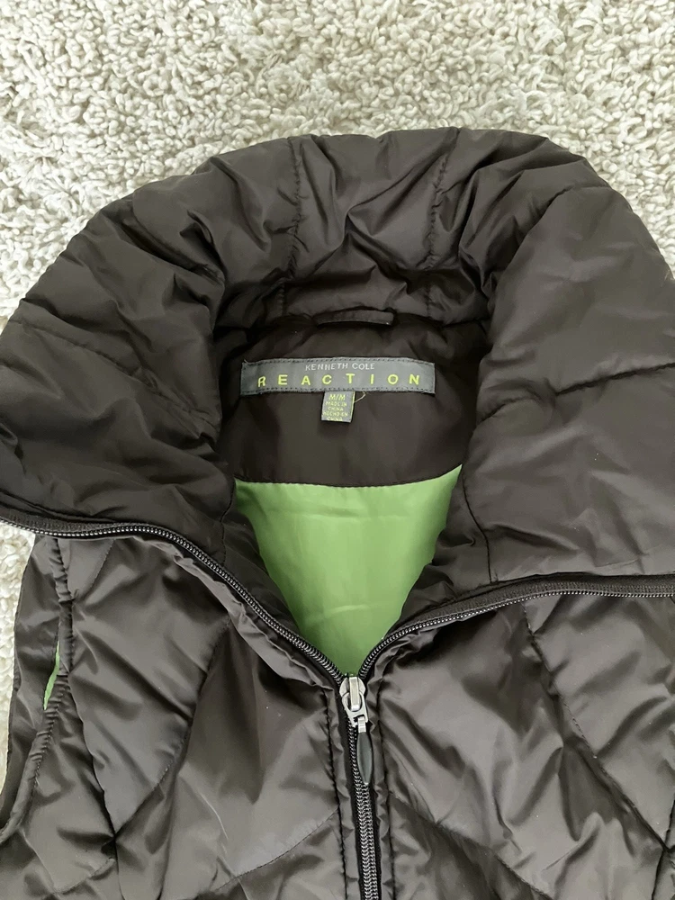 This nice down puffer Jacket has a beautiful dark brown outer layer and a green inside to add a little pop. It can be worn open or zipped. It includes two Zippered pockets to keep items safe. The sides are slightly elastisized so as not to have that blocky square look. Add it to your fall wardrobe!