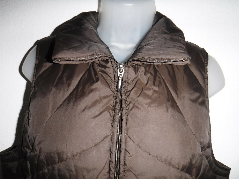 Women's Large brown down fill quilted full zip vest (Kenneth Cole Reaction) in good condition. Underarm to underarm is 20 inches. Length from back collar seam to bottom of of vest is 22 inches. Very nice vest.... Feel free to ask questions. I am happy to combine shipping. Thanks for looking!