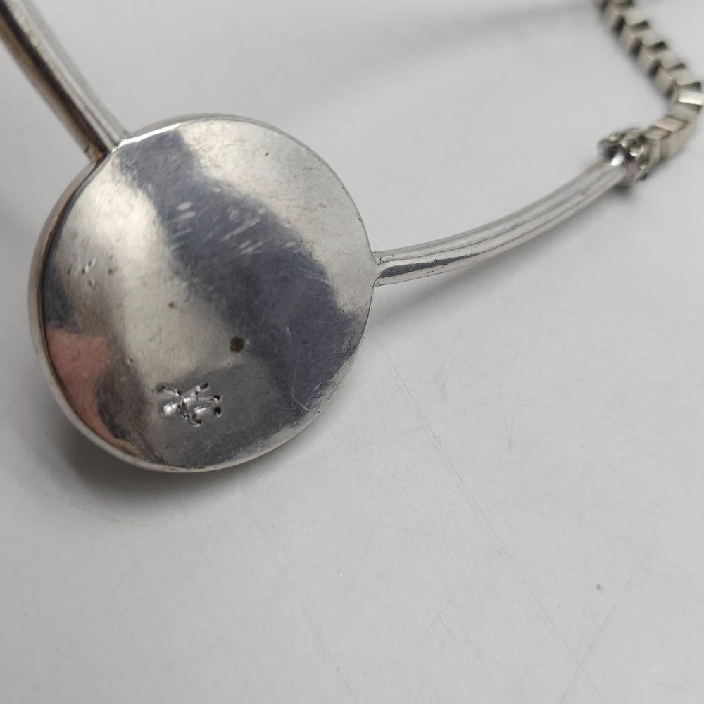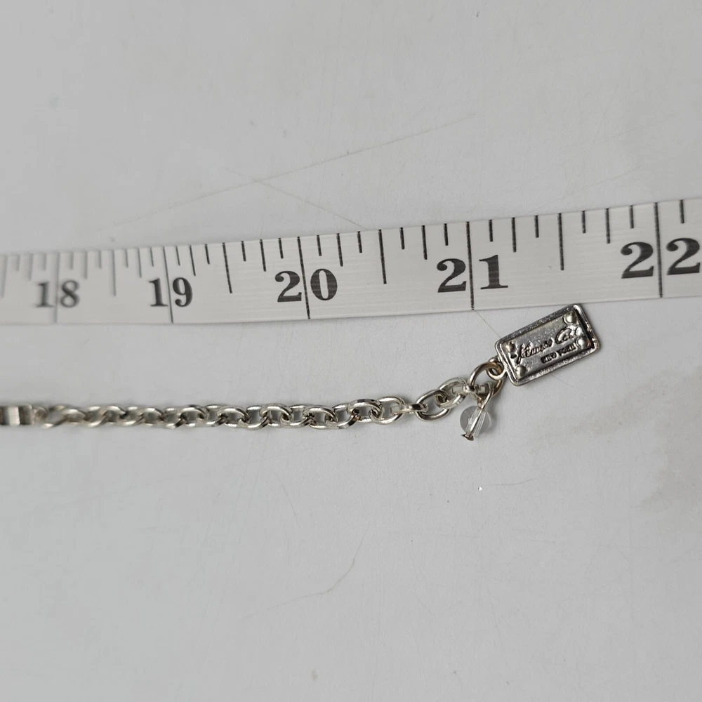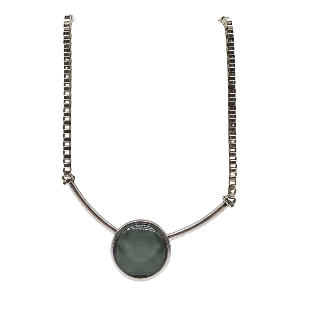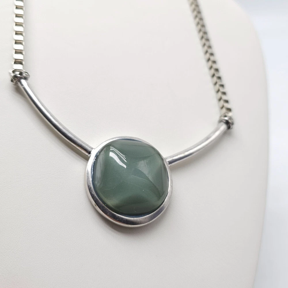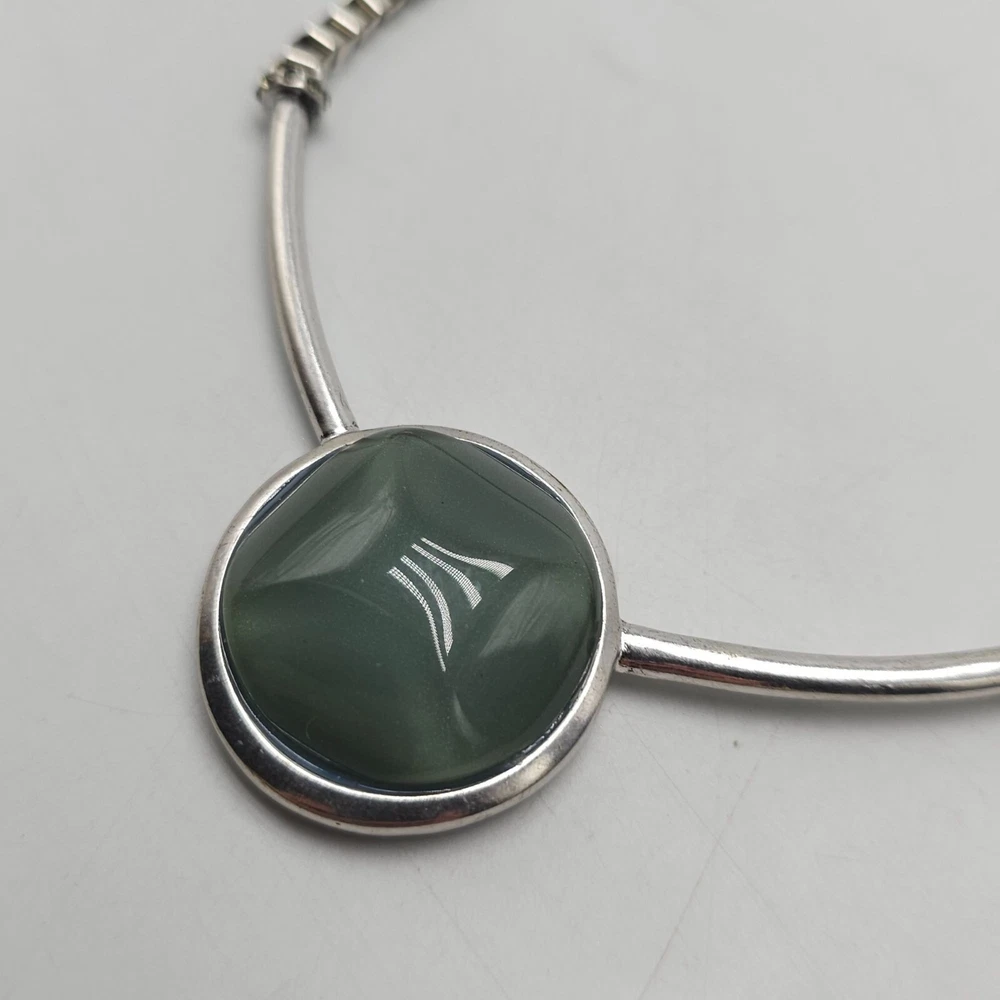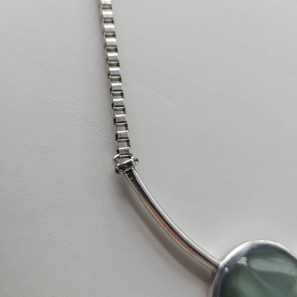 A sophisticated necklace by Kenneth Cole featuring a striking green stone encased in a silver-tone setting. The necklace's unique design and color make it an elegant statement piece for professional attire. • Silver-tone chain with box links • Green stone pendant • Secure clasp closure • Elegant design Minor tarnish on the back of the pendant. Gently Used - see all pics for condition Condition: Pre-Owned Good Size: Womens 21 in Features: Pendant Made in Unknown