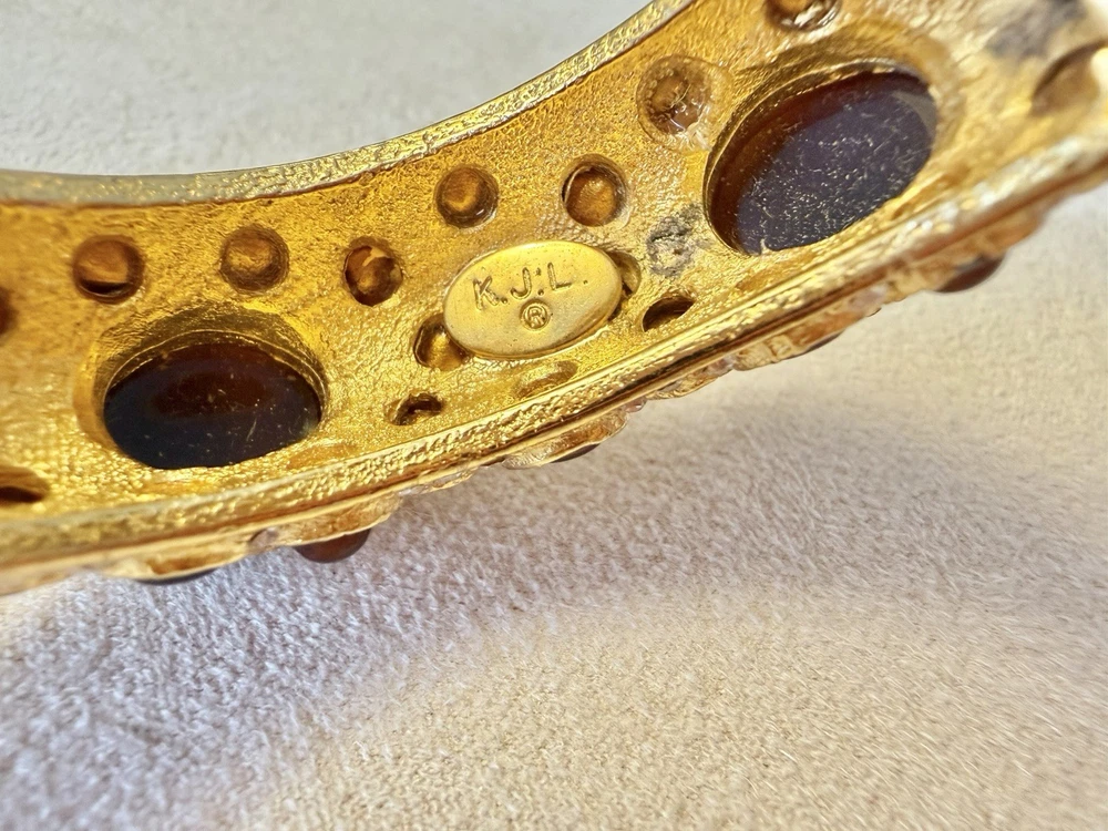 The Kenneth Lane KJL Vintage 1960s Jewels Of India Mughal Cabochons Bangle Bracelet is a stunning piece of vintage jewelry featuring Mughal cabochon stones set in a bangle style bracelet. The rich history and intricate design of this bracelet reflect the brand's commitment to creating high-quality and unique pieces. Perfect for adding a touch of vintage glamour to any outfit, this bracelet is a timeless accessory that speaks of elegance and sophistication.