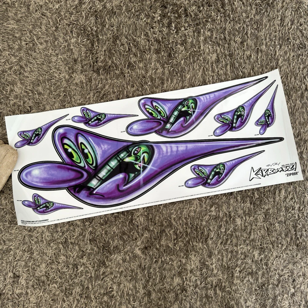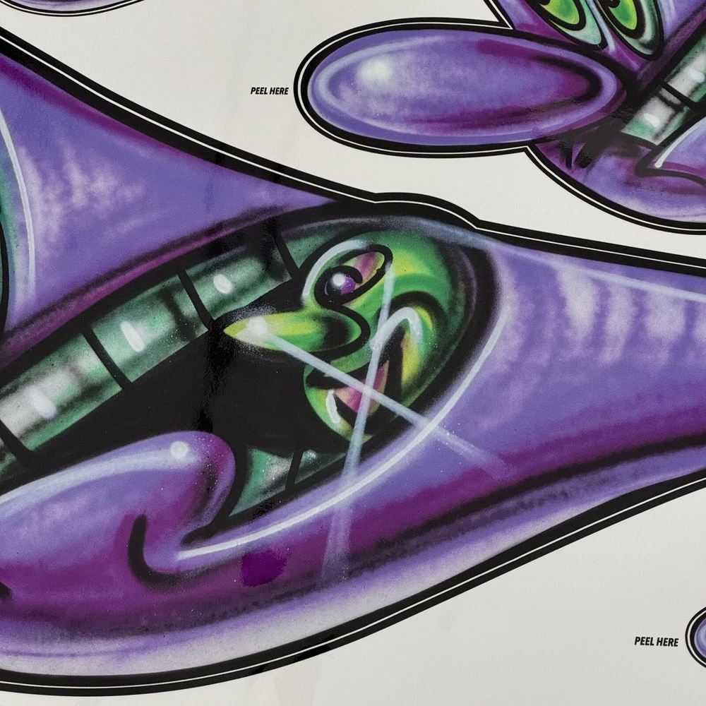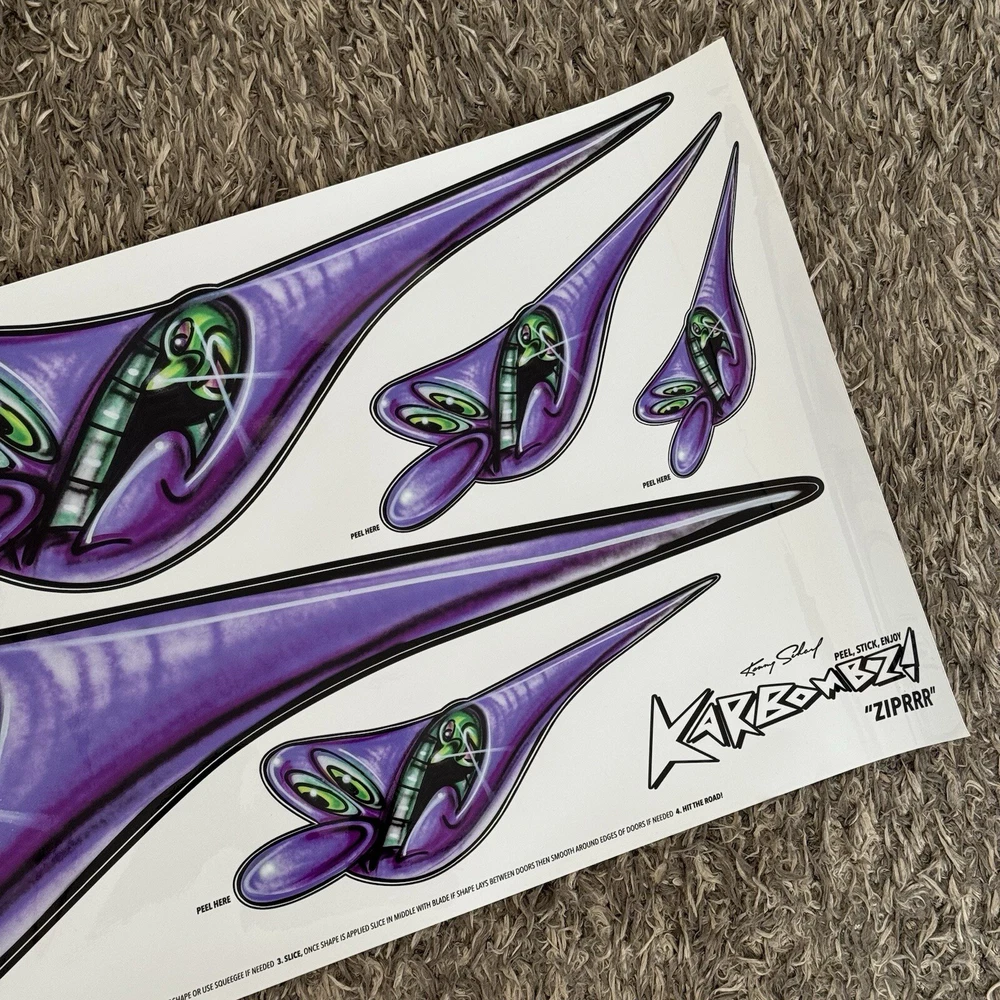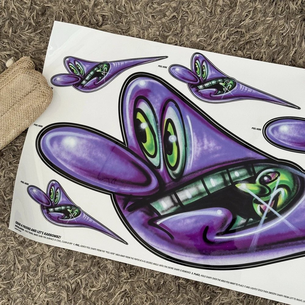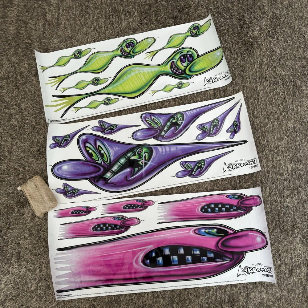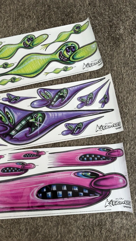 Kenny Scharf Karbombz Decals Large Size: 40“ x 16” • SPEEDYGRR (PINK) • ZIPRRR (PURPLE) • SPEEDERMI (GREEN) We ship worldwide.