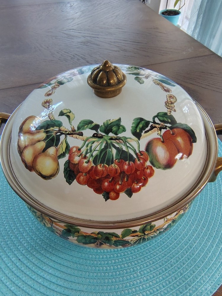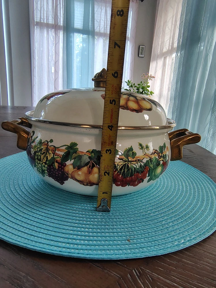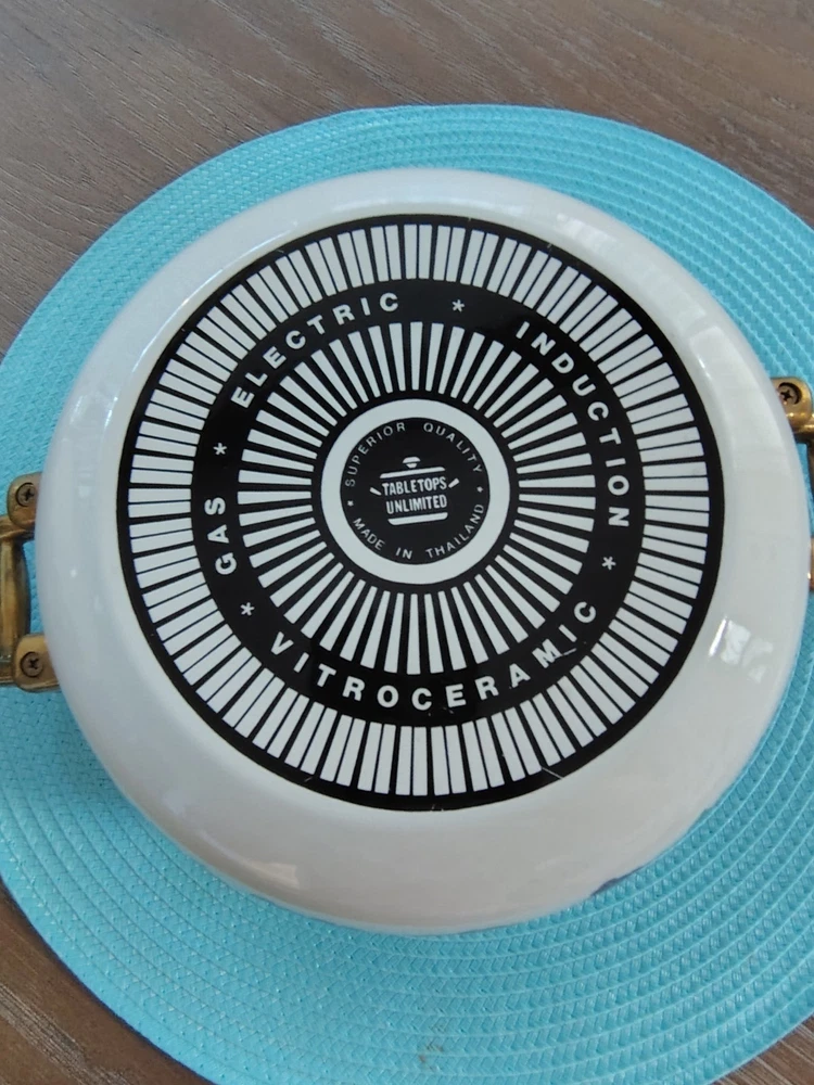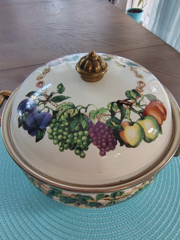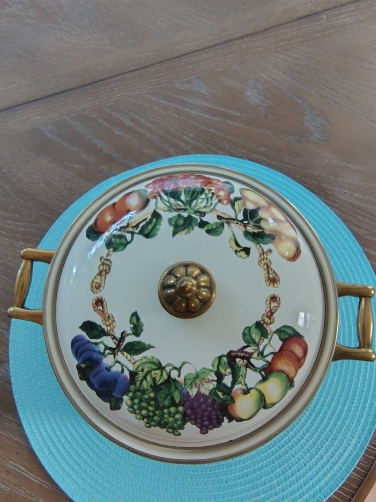 Shape:RoundOriginal/Licensed Reproduction:OriginalBrand:Tabletops UnlimitedCountry/Region of Manufacture:ThailandType:Dutch OvenColor:MulticolorNumber of Items in Set:Two-PieceMaterial:VitroceramicSet Includes:Lid, PotStove Type Compatibility:Electric, Gas, InductionSurface Coating:CeramicItem Height:4 inTime Period Manufactured:1980-1989Features:Double Handle, Flat-Bottomed, With LidType of Oven:Electric, Gas, InductionAntique:NoVintage:YesItem Diameter:9