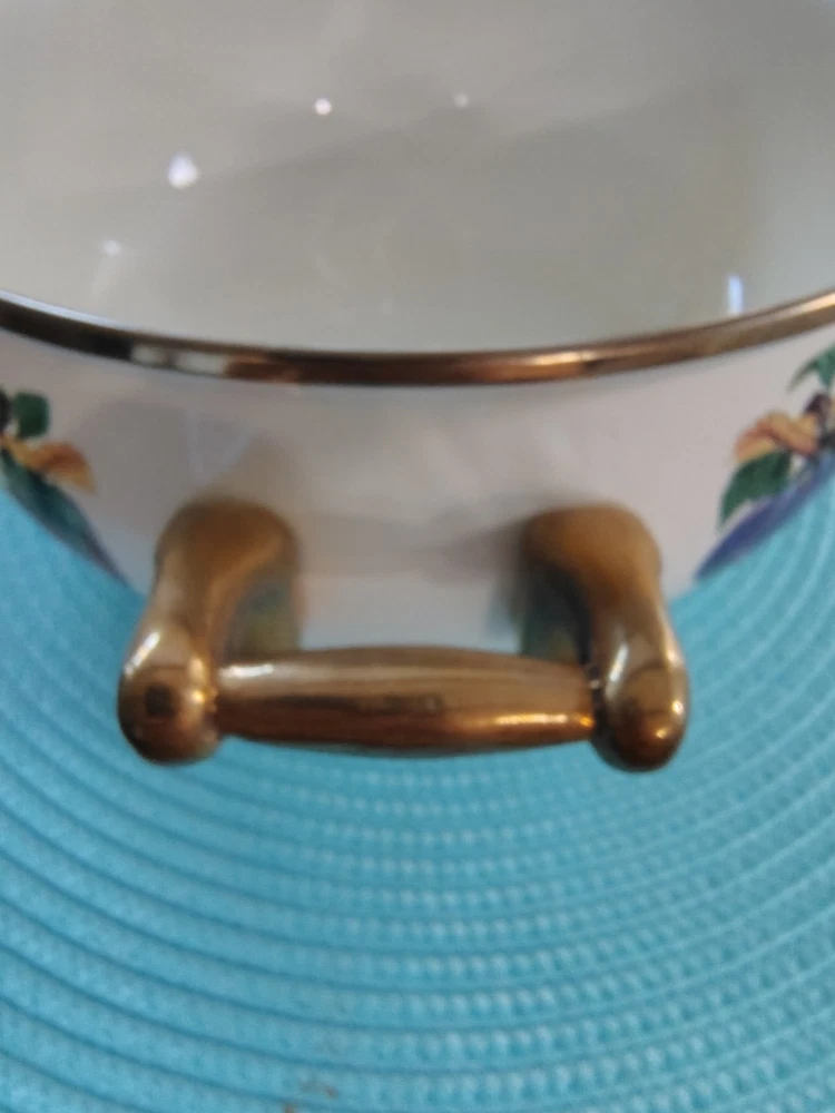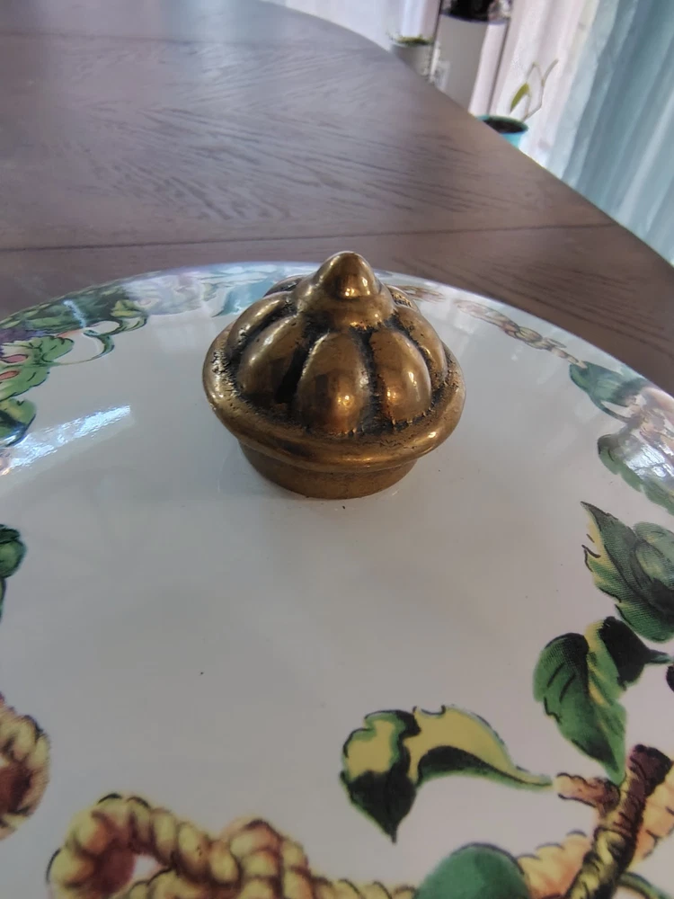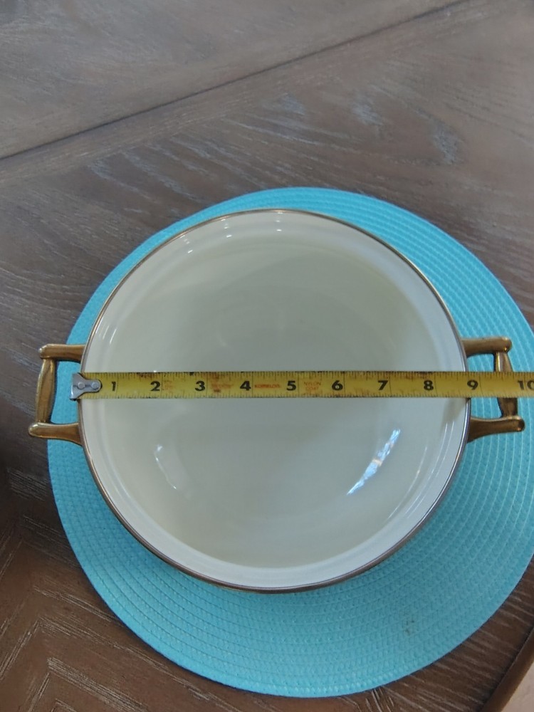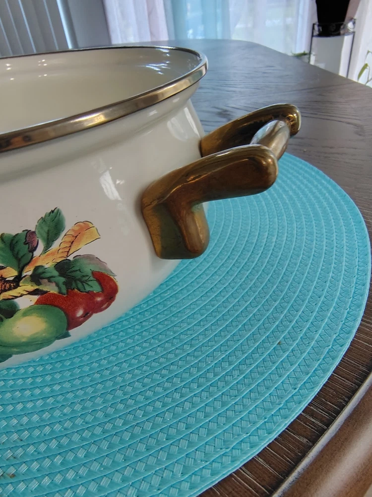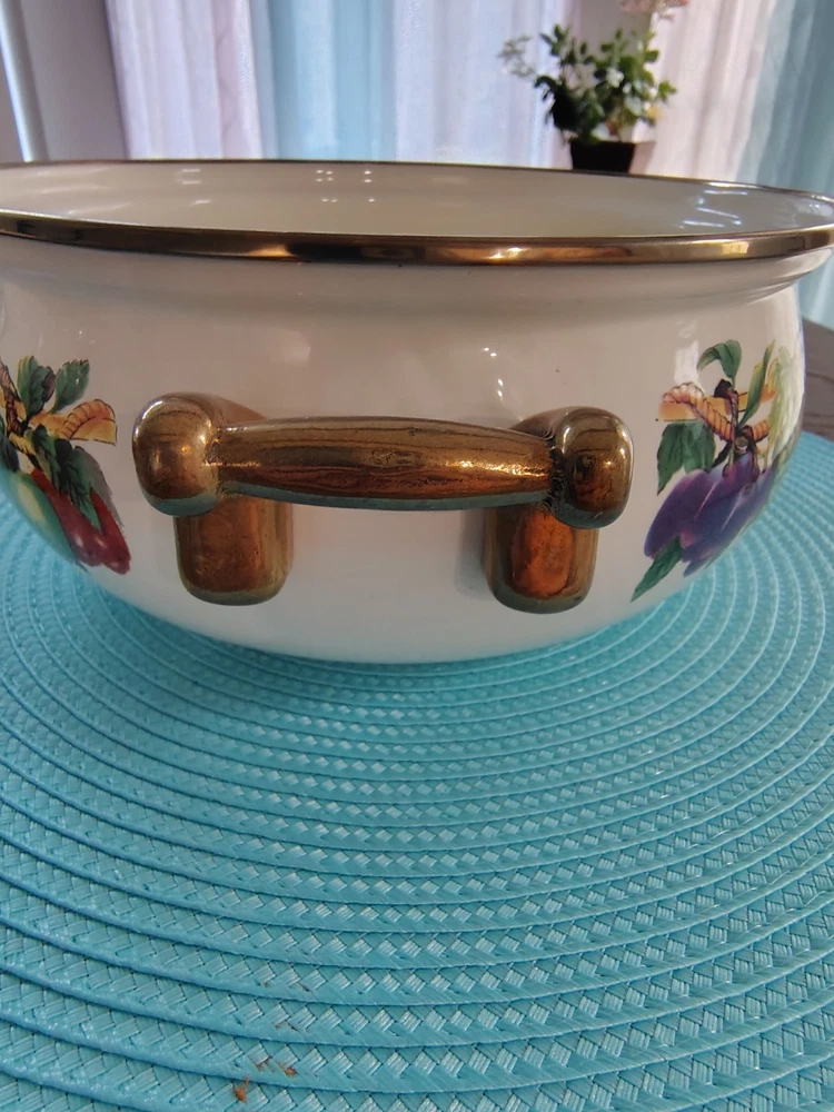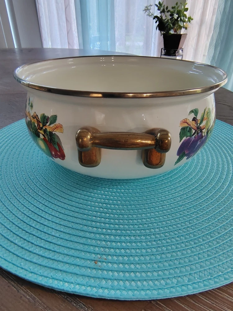 Shape:RoundOriginal/Licensed Reproduction:OriginalBrand:Tabletops UnlimitedCountry/Region of Manufacture:ThailandType:Dutch OvenColor:MulticolorNumber of Items in Set:Two-PieceMaterial:VitroceramicSet Includes:Lid, PotStove Type Compatibility:Electric, Gas, InductionSurface Coating:CeramicItem Height:4 inTime Period Manufactured:1980-1989Features:Double Handle, Flat-Bottomed, With LidType of Oven:Electric, Gas, InductionAntique:NoVintage:YesItem Diameter:9