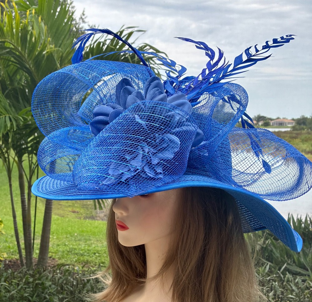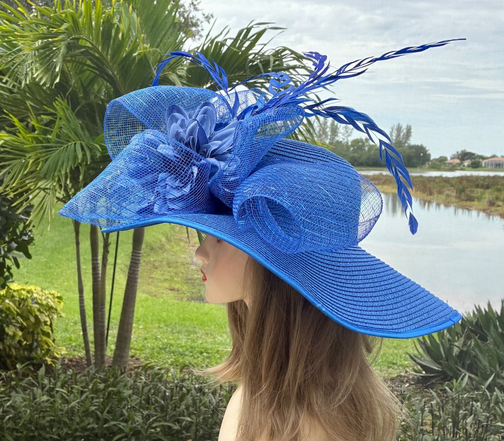 The Kentucky Derby Hat Church Tea Party Hat with Wide Brim is a stylish sun hat designed for women. The wide brim provides excellent sun protection while adding a touch of elegance to any outfit. The one-size-fits-all design in a classic blue color makes it a versatile accessory for any occasion, whether it's a derby party or a casual day out in the sun. Made with quality materials and attention to detail, this hat is perfect for those looking to make a fashionable statement while staying shaded from the rays.