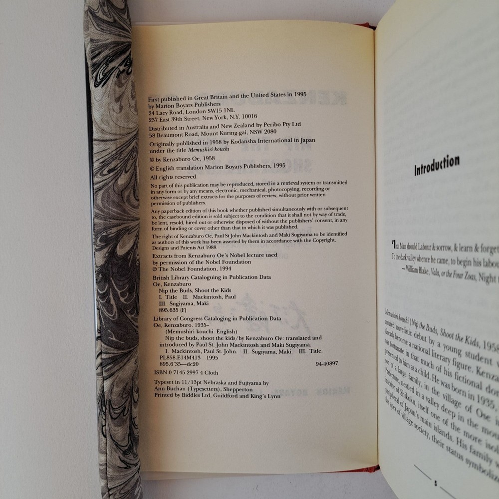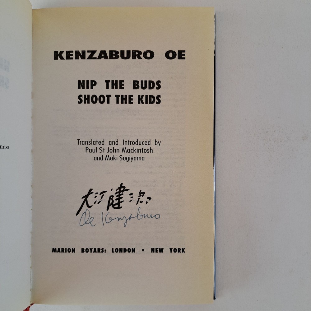 NIP THE BUDS SHOOT THE KIDS [Signed] Author: Ōe, Kenzaburo, Mackintosh, Paul St John [Translator]; Sugiyama, Maki [Translator] Title: NIP THE BUDS SHOOT THE KIDS [Signed] Publication: London, UK: Marion Boyars, 1995 Edition: First U.K. Edition, First Printing Description: Octavo, 189 pages. In Very Good minus condition with a Very Good condition dust jacket. Black spin with yellow and white lettering. Dust jacket is wrapped in a mylar covering, price uncut "US $22.95/ UK £14.95", has a crease along the tail fore corner of the rear flap, and mild shelving wear. Boards have mild bending along the spine tail edge. Textblock has mild foxing along the head edges, and mild age toning along the edges. Contains a loose publisher's review sheet. Signed flat by Kenzaburo Ōe on the title page. Shelved in Room C. Seller ID: 1392640 Subject: Literature Welcome to the eBay store of Second Story Books! DC's Oldest Rare and Used Bookstore, Second Story Books operates two open shops in the Washington D.C. metropolitan area. We have an extensive internet presence and provide accredited appraisals member ASA. This listing was created by Bibliopolis.