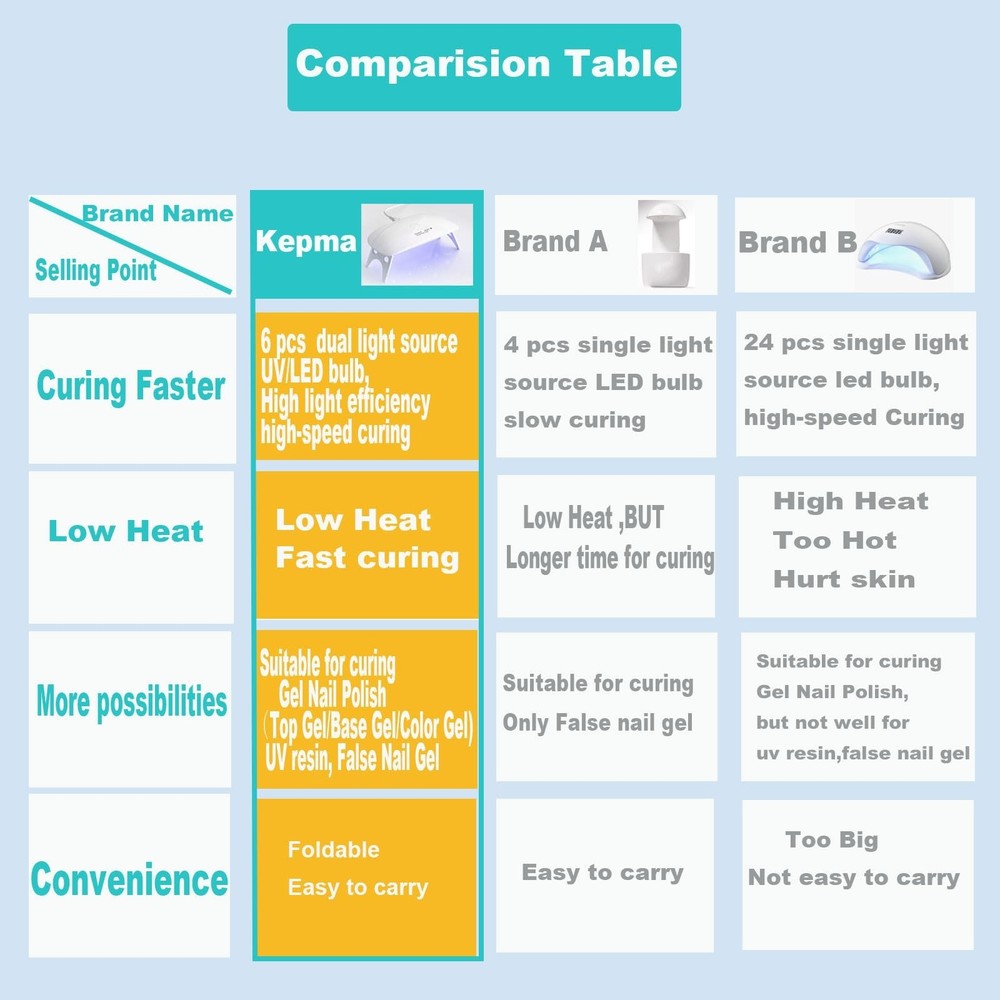 Kepma UV LED Nail Dryer Mini lamp Portable Curing Light for Gel Nail Polish,6w(White) Product Details Finish Type: Polished Base Material: Resin Bulb Base: Prong Product Dimensions: 3.54"D x 5.12"W x 0.79"H Item Weight: 0.11 Pounds Is Discontinued By Manufacturer : No Product Dimensions : 5.12 x 3.54 x 0.79 inches; 1.76 ounces Date First Available : January 10, 2019 Manufacturer : Kepma Customer Reviews: 3.9 3.9 out of 5 stars 16,469 ratings Finish Type: Polished Base Material: Resin Bulb Base: Prong Product Dimensions: 3.54"D x 5.12"W x 0.79"H Item Weight: 0.11 Pounds Lamp Type: Nail Dryer Shade Color: White Shade Material: Resin Switch Type: Touch Style: Minimalist Brand: Kepma Color: White Special Feature: Rechargeable Light Source Type: LED Material: Resin Room Type: Office Recommended Uses For Product: Curing Power Source: Corded Electric Number of Light Sources: 6 Connectivity Technology: USB Included Components: Power Cable Is Waterproof: TRUE Bulb Shape Size: A19 Mounting Type: Tabletop Wattage: 6 watts Number of Items: 1 Lighting Method: LED Control Method: Touch Indoor/Outdoor Usage: Indoor Water Resistance Level: Waterproof Installation Type: Nail On Number of Pieces: 1 Efficiency: High Efficiency Voltage: 5 Volts (DC) Is Cordless?: No UPC: 886319224517 686494436961 686494436862 Size: 3 Piece Set Manufacturer: Kepma Shade Height: 0.79 Inches Part Number: UVL Item Weight: 1.76 ounces Is Discontinued By Manufacturer: No Finish types: Polished Special Features: Rechargeable Batteries Included?: No Batteries Required?: No Wattage: 5 Watts Date First Available: January 10, 2019 1.Attention Please: The lamp works well with GEL nails but not for TRADITIONAL nail polish Dual light sources (wavelength 365nm+405nm), makes it works fastly with gel nail polish(top coat/base coat/color gel),gel stickers and uv resin,but not for traditional nail polish. The traditional nail polish needs to be air dried rather than curing by uv nail lamp. 2.Mini Size Mini size(3.54"D x 5.12"W x 0.79"H), 0.11 lb light weight, can be easy to put in your makeup bag, handbag even in a wallet. 3.Timer Design: 3 Timer Settings : 60s, 180s and "Stay on" .Press ON/OFF button once for curing 60 seconds, second press for 180 seconds.Press and Hold for 3-4 seconds, it stays on. Warm Tips: The nail lamp is not rechargeable. When using the product, please connect the attached cable to a mobile powerbank or the other USB socket. 4.Pretect Your Eyes adn Skin Comparing with other products, its light is closer to white light, has no harm to eyes and skin. Fashionable and durable 50000hrs lifetime, ideal for personal use and best gift for friends. 5.Warranty100% customer satisfaction is our pursuit, we can provide 12 months warranty.Warm Tips:Please notice the lamp size before placing an order . It is normal for gel nail polish to feel sticky after curing.DO NOT WIPE. It is recommended to apply as thin a coat as possible when applying gel nail polish. The curing time will be shorter.