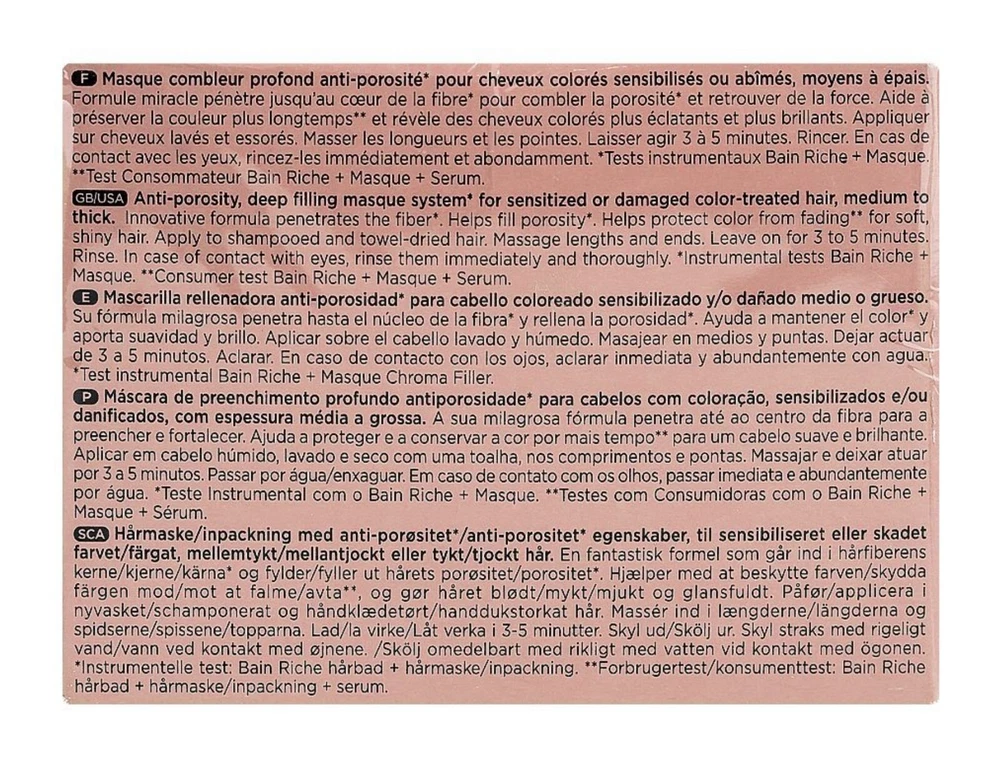 AFFORDABLE US AND CANADA EXPEDITED SHIPPING Kerastase Chroma Absolu Masque Chroma Filler 200 ml/ 6.76 oz *NEW IN BOX*. Description: This fortifying mask for color-treated and damaged hair deeply nourishes and conditions to maintain hair health and color vibrancy while enhancing shine. Hair Type: Fine, Medium, and Thick Hair Texture: Straight, Wavy, and Curly Hair Concerns: – Safe for color-treated hair – Damage, split ends, and breakage – Dry hair Key Benefits: – Deeply nourishes to leave a brilliant shine – Improves hair health by strengthening and softening – Preserves and protects color vibrancy Highlighted Ingredients: – Amino Acid, Lactic Acid, and Tartaric Acid: A blend of healing acids that target all three levels of hair damage and penetrate the hair to repair all damage caused by coloring and prevent color from fading or fading. (This particular product is formulated with Amino Acid and Centella Asiatica.) Additional Information: This mask deeply strengthens and rebuilds hair damaged by color treatments, preventing future breakage. Formulated with amino acids, it nourishes and hydrates to help preserve color vibrancy and soften hair. Infused with reparative acids, this mask leaves hair healthier and shinier, and protects against color-damaging environmental aggressors. Clinical Results: In a controlled study using a Chroma Absolu Masque system versus a non-conditioning shampoo, results showed: – 92% had stronger hair In a controlled study using Chroma Absolu Masque versus untreated hair: – 93% had softer hair In a controlled study using a Chroma Absolu Bain Riche, Soin Acide, and Masque system versus untreated hair: – 62% had shinier hair Show more Ingredients -Amino Acid, Lactic Acid, and Tartaric Acid: A healing acid blend that targets the three levels of hair damage and penetrates to recover hair from all types of color-induced damage and prevent color stripping or fading. (This specific product is formulated with amino acid and Centella asiatica.) Aqua/Water/Eau, Cetearyl Alcohol, Amodimethicone, Behentrimonium Chloride, Cetyl Esters, Isopropyl Alcohol, Peg/Ppg/Polybutylene Glycol-8/5/3 Glycerin, Trideceth- 6, Phenoxyethanol, Arginine, Citric Acid, Cetrimonium Chloride, Chlorhexidine Dihydrochloride, Linalool, Limonene, Sodium Hyaluronate, Centella asiatica Extract, Lactic Acid, Ci 17200/Red 33, Ci 19140/Yellow 5, Parfum/Fragrance. Instructions for use Suggested Use: – After cleansing with Chroma Absolu Shampoo (sold separately), apply a small amount to hair from mid-lengths to ends. – Leave on for five minutes. – Rinse thoroughly.