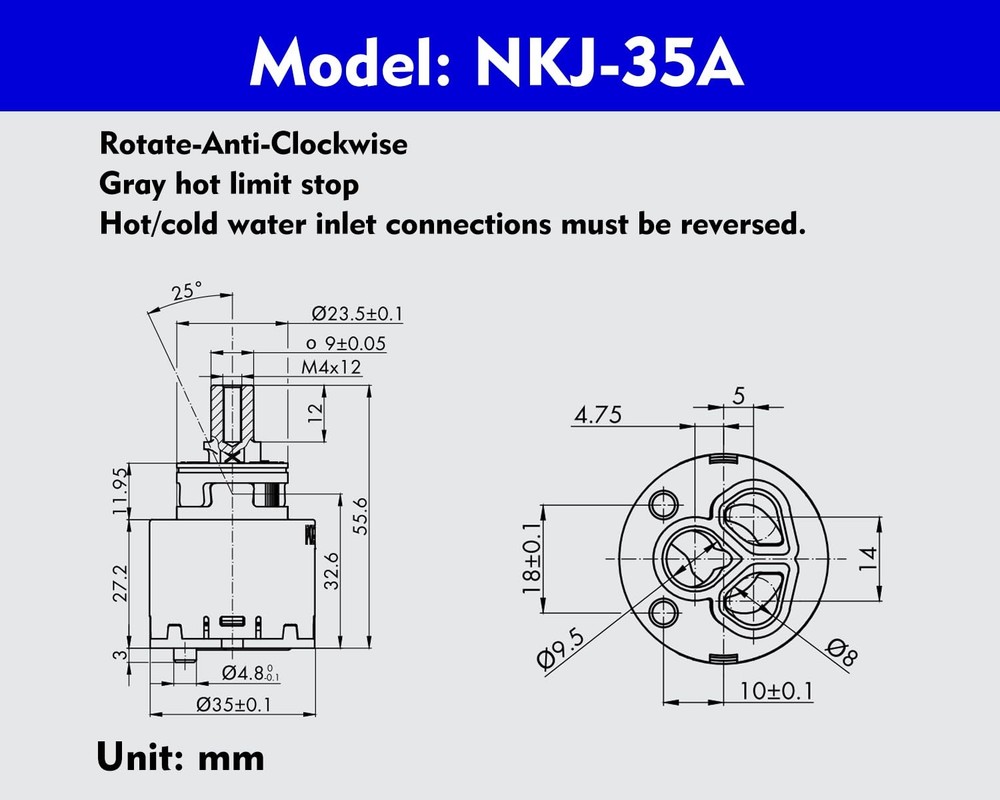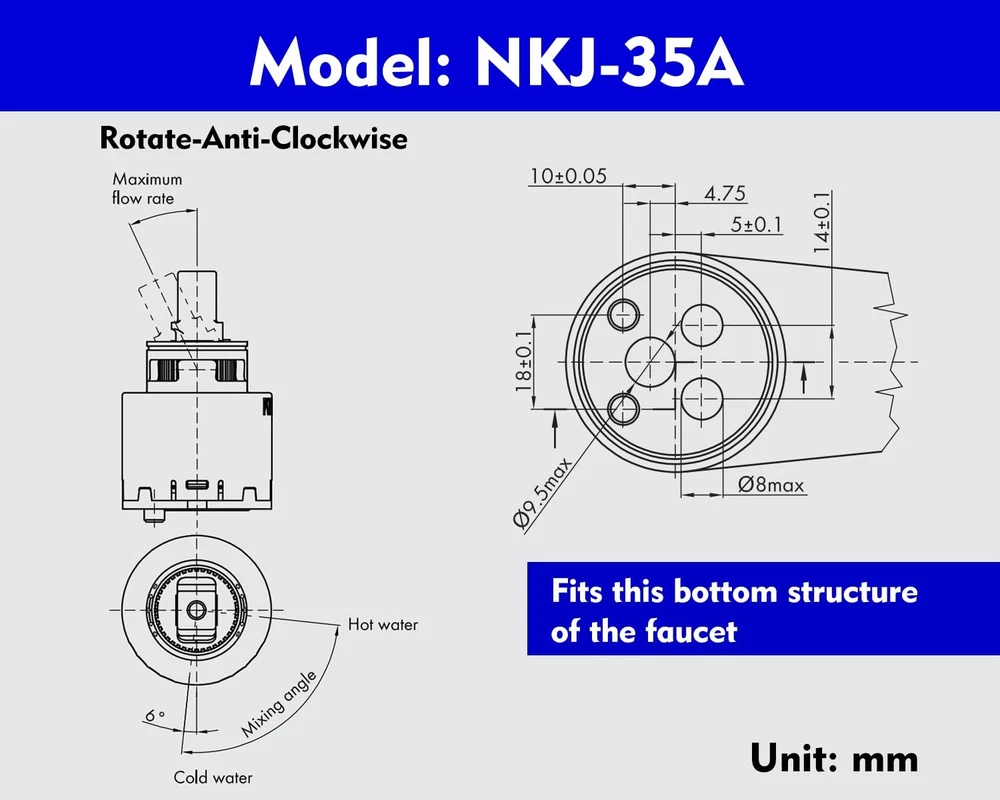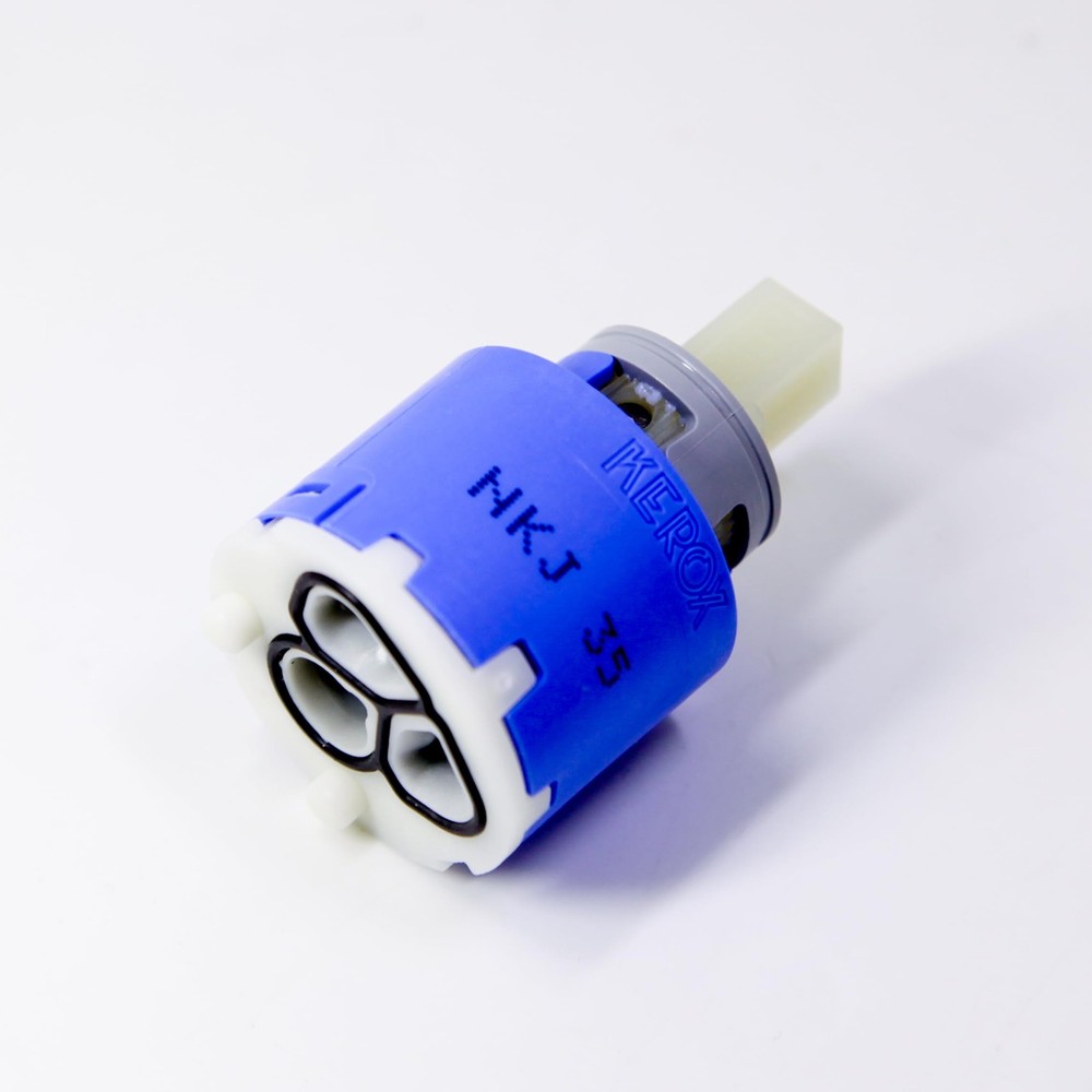 35MM Single Lever Ceramic Cartridge for Blanco Kerox NKJ 35 F206502 F0304 NKJ35A 123817 p29119 Two exclusive features to provide economies of waterconsumption overall, and of hot water use specifically: Saves energy by turning on in middle position oflever handle, delivering cold water - adds hot water only as lever is rotated. Saves water because user must override“resistance bump” to obtain high flow - acts as deterrent to unconsciously turning handle onto full flow position regardless of water requirement. Economical flow rate is maximum 9 l/min / 2.4 gpm at 3 bar / 45 psi. 35MM Single Lever Ceramic Cartridge for Blanco Kerox, NKJ 35 / F206502 / F0304 / NKJ35A / 123817 P29119. It's 35mm in diameter with conventional volume and temperature control but with the temperature range shifted to the right (NKJ). HANDLE ROTATION: The NKJ35A single-handle faucet rotates differently than the regular K35A cartridge. The NK-35 model has either NKJ (right rotation of temperature range) or NKB (left rotation of temperature range) volume and temperature control. Both options, however, are ideal for a side-mount faucet to keep the lever from hitting the backsplash. Durable: Kerox ceramic disc cartridges are built to last. Tested to 500,000 cycles (ASME A112.18.1). Recommended tightening torque: 12-13 Nm / 106-115 Ibfin Opening angle: 25° Mixing angle: 90° Max. temperature: 90°C / 194°F COMPATIBILITY: The Kerox NKJ35A cartridge fits the La Torre Single Lever Faucet 12781 and other qualified models. This repair part has flat or distributor bottom options, two (2) locating pins, and an adjustable hot limit stop. This cartridge is made of ceramic, the latest development in faucets' modern technology.
