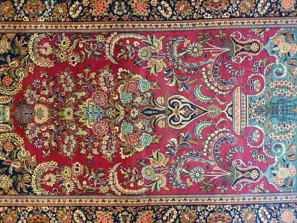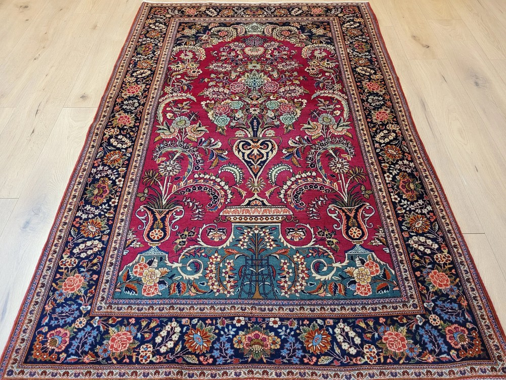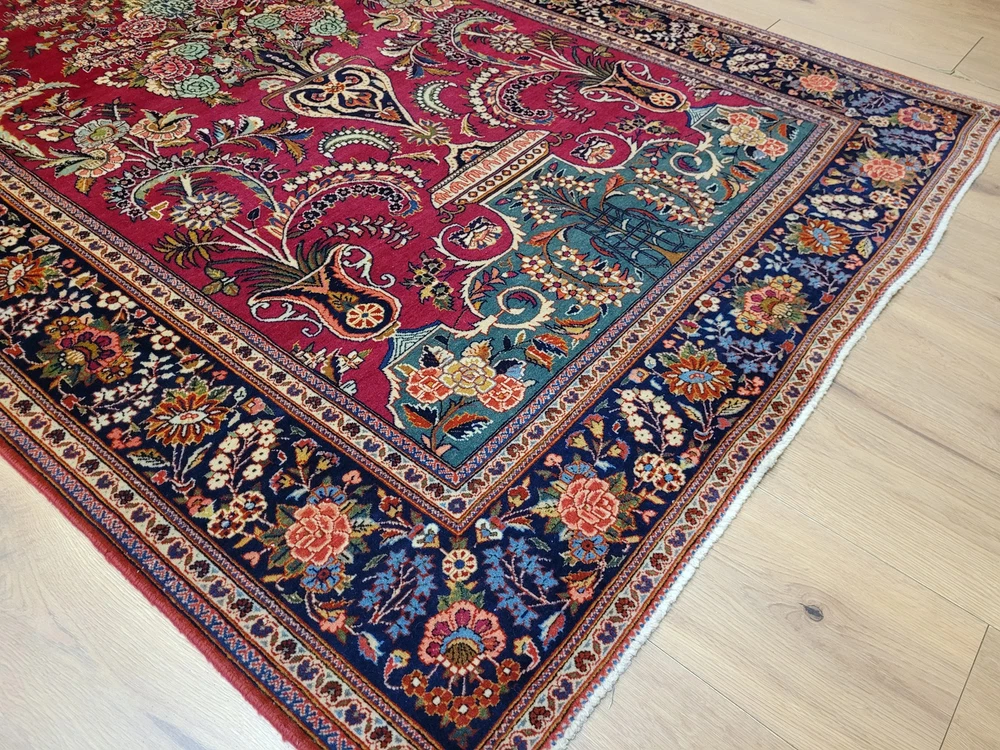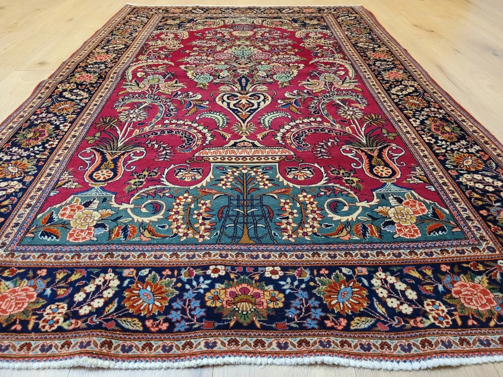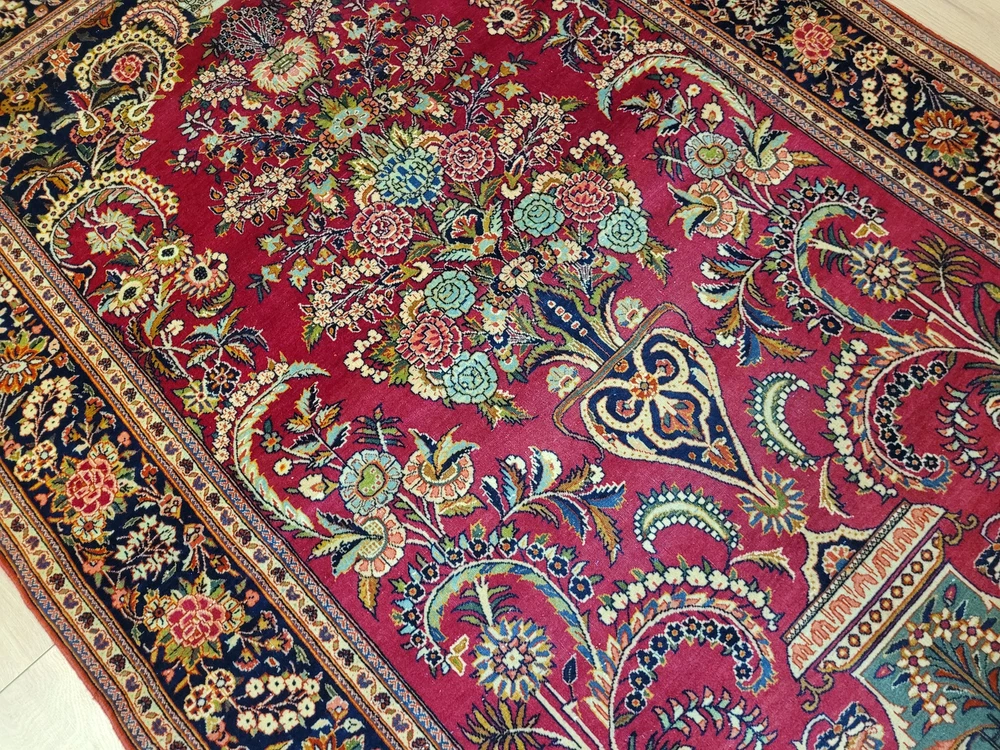 Herzlich willkommen, angeboten wird ein kunstvoller Keschan Teppich aus feiner Korkwolle, handgeknüpft in detailreicher Ausführung. Das Hauptmotiv zeigt eine prachtvolle Vase, aus der sich ein reich gefüllter Blumenstrauß erhebt. Die Komposition ist symmetrisch angelegt und von dekorativen Blütenranken umgeben, die in kräftigen Farben erstrahlen. Artikelnummer: GJH25/158 Maße: 200 × 132 cm Details: Material: Korkwolle, handgeknüpft Knüpfung: fein gearbeitet mit klarer Linienführung Farben: leuchtendes Rot im Fond, dazu Blau, Grün, Gelb, Beige, Schwarz und Rosé Design: Großes Vasenmotiv mit blühendem Strauß im Zentrum Reiche florale Arabesken mit geschwungenen Ranken und Blüten Bordüre mit umlaufendem Blütenfries in kontrastreicher Gestaltung Verarbeitung: hochwertige Knüpftechnik, harmonische Farbkomposition und detailgenaue Ornamentik Verwendung: repräsentativer Teppich für Wohn- oder Empfangsräume, dekoratives Sammlerstück Zustand: Sehr guter, gepflegter Zustand. Die Bilder sind Teil der Zustandsbeschreibung. Versand: Wir versenden per GLS, UPS und DHL versichert weltweit.