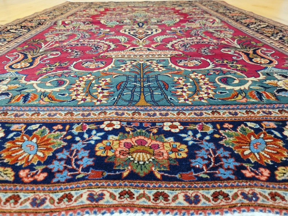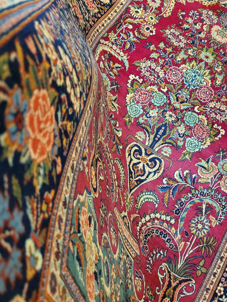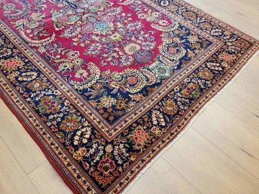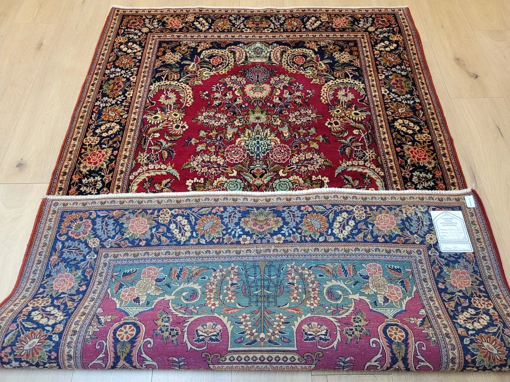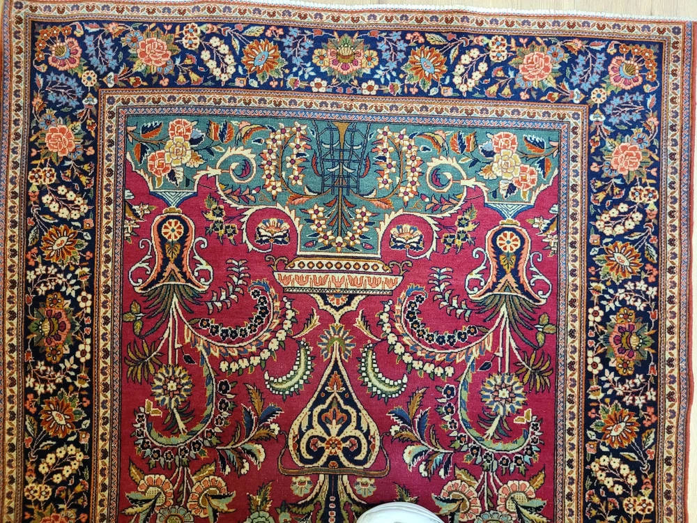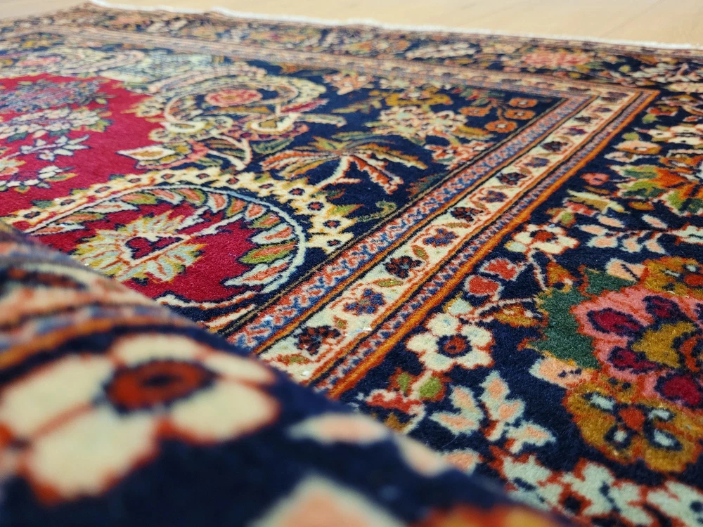 Herzlich willkommen, angeboten wird ein kunstvoller Keschan Teppich aus feiner Korkwolle, handgeknüpft in detailreicher Ausführung. Das Hauptmotiv zeigt eine prachtvolle Vase, aus der sich ein reich gefüllter Blumenstrauß erhebt. Die Komposition ist symmetrisch angelegt und von dekorativen Blütenranken umgeben, die in kräftigen Farben erstrahlen. Artikelnummer: GJH25/158 Maße: 200 × 132 cm Details: Material: Korkwolle, handgeknüpft Knüpfung: fein gearbeitet mit klarer Linienführung Farben: leuchtendes Rot im Fond, dazu Blau, Grün, Gelb, Beige, Schwarz und Rosé Design: Großes Vasenmotiv mit blühendem Strauß im Zentrum Reiche florale Arabesken mit geschwungenen Ranken und Blüten Bordüre mit umlaufendem Blütenfries in kontrastreicher Gestaltung Verarbeitung: hochwertige Knüpftechnik, harmonische Farbkomposition und detailgenaue Ornamentik Verwendung: repräsentativer Teppich für Wohn- oder Empfangsräume, dekoratives Sammlerstück Zustand: Sehr guter, gepflegter Zustand. Die Bilder sind Teil der Zustandsbeschreibung. Versand: Wir versenden per GLS, UPS und DHL versichert weltweit.