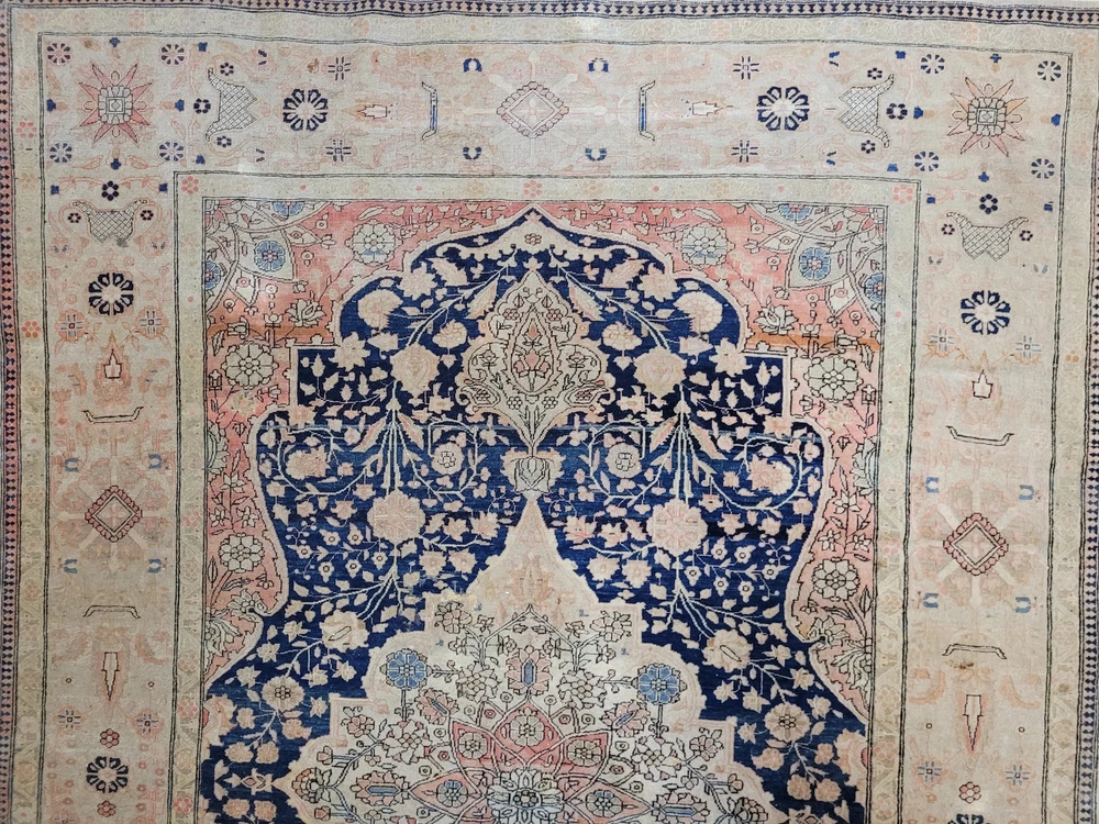 Herzlich willkommen, angeboten wird ein seltener, fein gearbeiteter Keschan Teppich mit klassischem Zentralmedaillon und floralem Dekor. Dieses handgeknüpfte Meisterstück überzeugt durch seine harmonische Farbgebung, detailreiche Knüpfkunst und elegante Ausstrahlung – ein beeindruckendes Beispiel traditioneller Teppichkunst. Artikelnummer: GJH25/299 Maße: 190 × 132 cm Details: Material: Korkwolle auf Baumwolle, handgeknüpft Knüpfung: fein und präzise, dichte Struktur Farben: Nachtblau, Rosé, Beige, Himmelblau, Altgold Design: Zentralmedaillon mit symmetrischem Aufbau Florale Ranken und Palmetten im Fond Bordüre mit kunstvoll verschlungenen Blütenmustern Harmonischer Farbverlauf mit feinen Schattierungen Verarbeitung: Hervorragende Handarbeit mit ausgewogener Balance zwischen Ornamentik und Farbe. Der Teppich zeigt typische Merkmale älterer Keschan-Knüpfkunst: zarte Linienführung, klare Medaillonform und florale Eleganz. Zustand: Guter, gepflegter Erhaltungszustand mit authentischer Patina. Leichte Gebrauchsspuren, altersgemäß schön erhalten. Die Fotos sind Bestandteil der Zustandsbeschreibung. Versand: Versicherter weltweiter Versand mit DHL, UPS oder GLS.