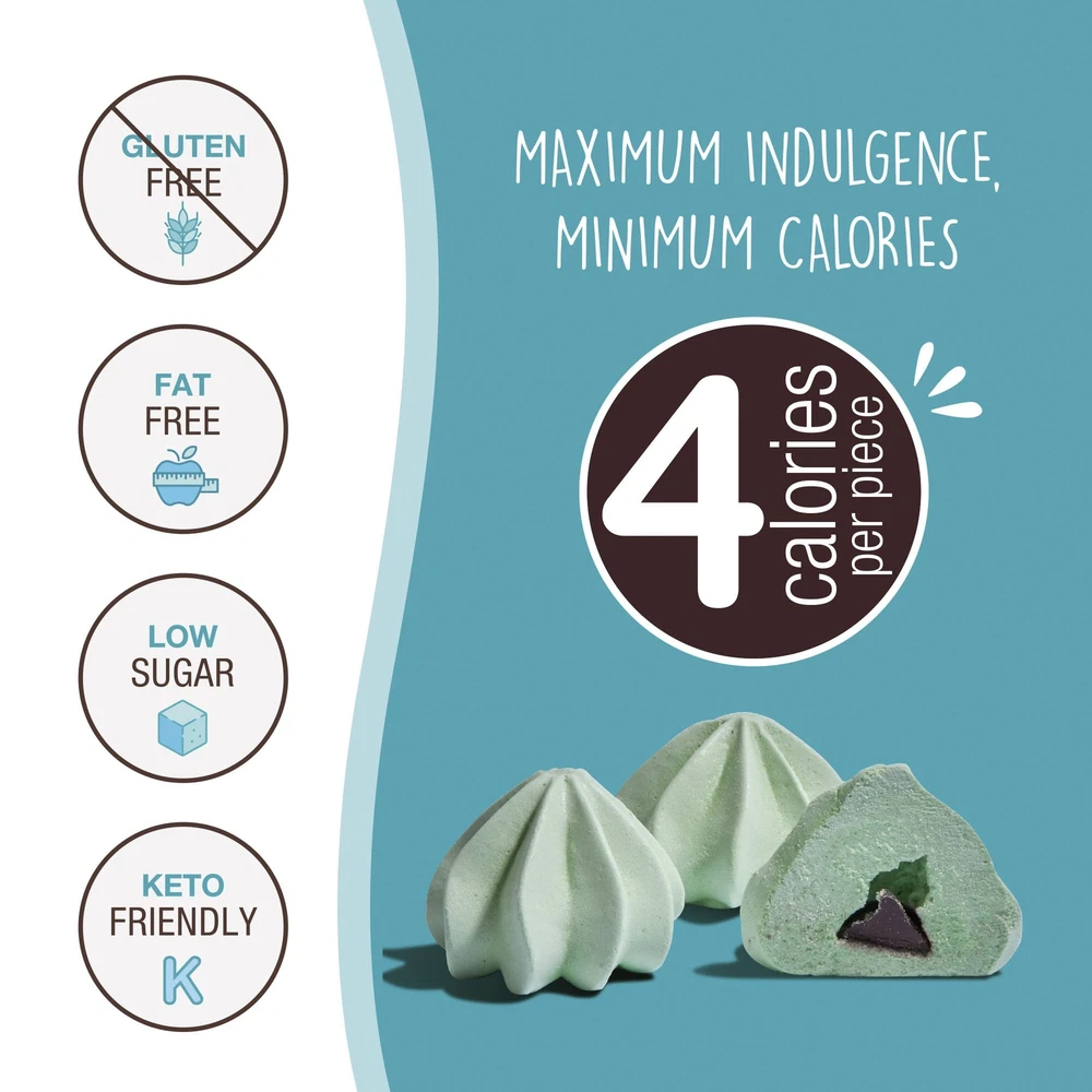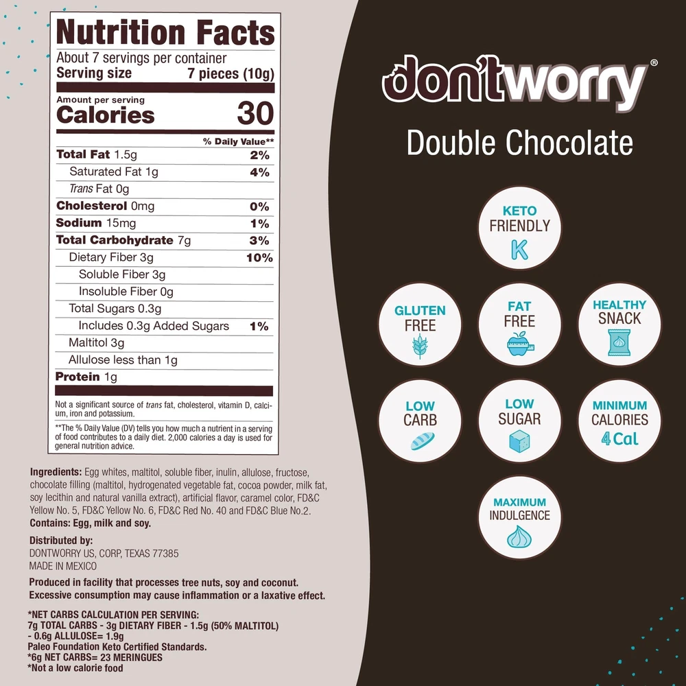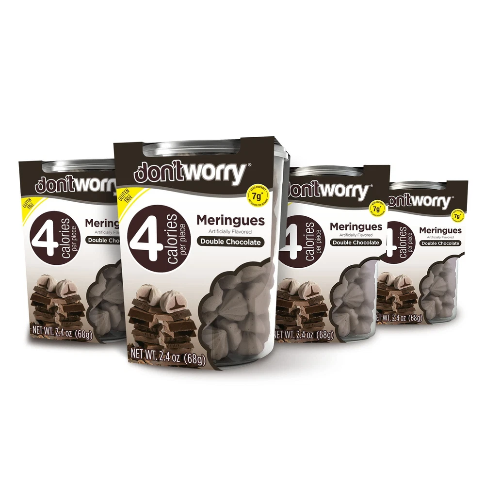 Made to delight you Our light meringue cookies have been carefully crafted for your absolute enjoyment! Whether for a quick break at home, work, or studying; to enjoy with a good friend or loved ; entertaining guests; or just some quality me-time snuggled up on the bed or couch—our products are intended to make life sweeter (but not too sweet!) 😁 Our deeper purpose and mission Truth be told, since conception, Don'tWorry has aimed to help tackle of the world´s biggest public challenges—alarming rates of obesity and diabetes. So we set out to do the impossible: Create delightful snacks that also happen to be good for you and your weight and fitness goals. But frankly, we want you to love our products simply for the great taste and quality!🍦 Founded in 2009 by a small, entrepreneurial team with a BIG dream, we started making our delightful meringues by hand in a neighbor's tiny kitchen. In the years since we are certain your taste buds and waistline will agree we have perfected recipes that will surprisingly amaze and delight you!🌟Product Description KETO-FRIENDLY SNACKING: Enjoy the meringue cookies, made with miraculously only 4 calories. Gluten-free, low-fat, and low sugar cookies are enhanced with natural sugar alternatives for guilt-free indulgence in every bite! GUILT-FREE INDULGENCE: Our chocolate cookies with no refined sugar or trans fat. Delicious and healthy, they’re perfect as low-sugar desserts & treats. Enjoy guilt-free snacking with cookies! PROMOTE A HEALTHY LIFE: Our purpose is to help tackle the global challenge of alarming rates of weight-related issues. That's why we set out to achieve this by creating low sugar snacks that support your fitness goals. GLUTEN FREE: We cracked the code after 600+ formulations, we perfected the balance of indulgence with minimal calories and guilt. Since 2009, we've crafted keto friendly snacks with passion and love. Try them and let us know if you agree! FLAVORS VARIETY: Our weight loss snacks comes in a variety of delicious flavors from Cookies & Cream, Double Chocolate, Strawberry, Vanilla, Hazelnut, Mint, to more. If you're looking for something different, try our delicious Quinoa Bites!