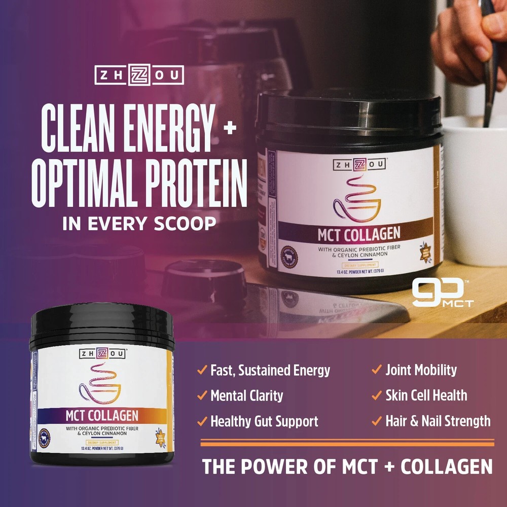 Sometimes those Monday morning vibes follow you around regardless of what day It is, so we created the perfect blend of MCT and collagen to help you shake that feeling. There are four different types of MCTs: C6, C8, C10, and C12. C8 is the good stuff, and we've got lots of it. Plus, we've packed our powder with type 1 and type 3 collagen to get you those vital proteins for hair, skin and nails bone and joint health. Mct collagen is immediate and robust source of energy and proteins, perfect for kickstarting your day No matter how you like to play Product Details Brand Zhou Nutrition Manufacturer Zhou Nutrition Product Type Collagen Nutritional Supplements Mpn 1890190 Supersonic Energy Source: MCTs can be absorbed quickly and digested rapidly, leaving you with a burst of clean and immediate energy to your body and mind, giving you a full-body jumpstart Beauty Protein Powerhouse: Collagen is a super protein that helps support your hair, skin, nails, bones, and joints. Our pure, sustainably sourced, hormone-free collagen hydrolysate can help to replenish lost collagen and support cell turnover Brain Boosting Blend: Your brain requires a constant stream of energy and proteins. Because MCTs are equipped with blood-boosting powers and collagen is a protein powerhouse, your brain is furnished with the energy it needs to be functioning at its finest Hearty Gut Health Hero: Our formula is designed to have a potent form of antifungal MCTs, meaning it can help get rid of the bad bacteria in your gut. And with the Ceylon Cinnamon that we added to the mix, you get a bonus antioxidant boost What Sets Us Apart? At Zhou, we use only the highest-quality ingredients in a facility following GMP (good manufacturing practices). Plus, we test everything at our lab in Utah, so you can be confident that you're fueling your body with the very best