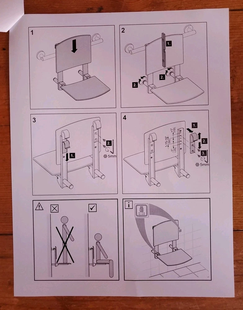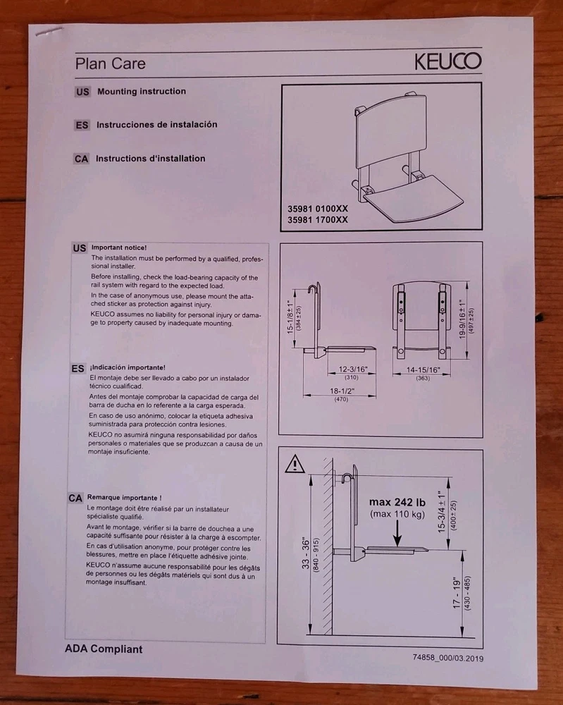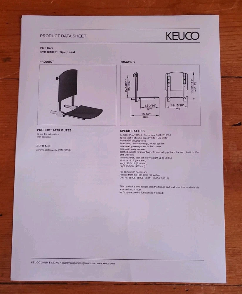 Keuco folding shower chair pre Owned But almost looks new hardly any signs of being used very shiny and clean these chairs are around $1000 new but here's a opportunity to get one at less than half of that, made in Germany very heavy construction maximum weight 285lbs thanks for Looking mounting instructions will be included with purchase Lot 118