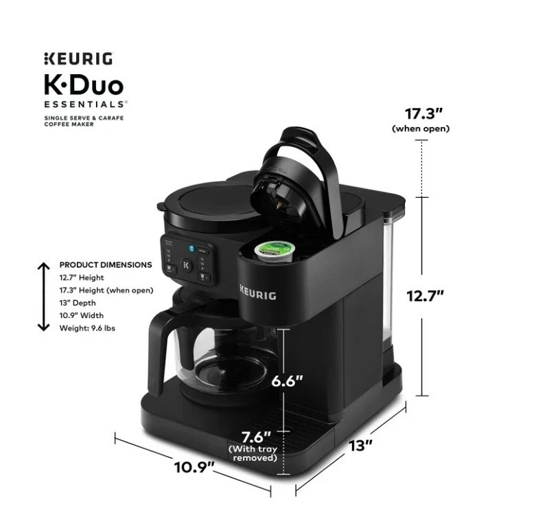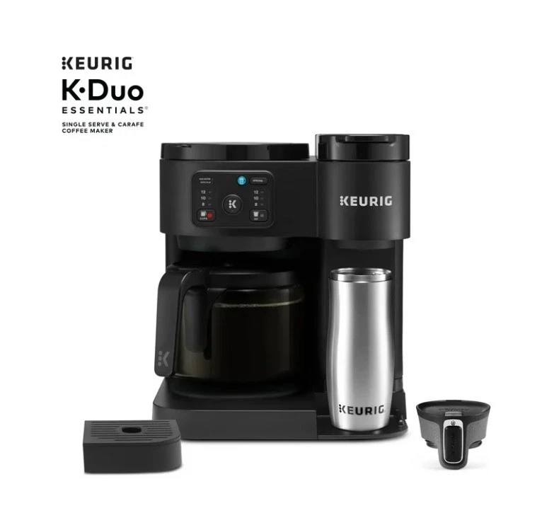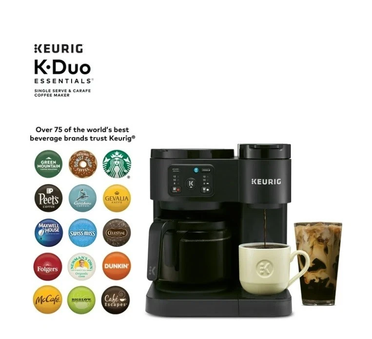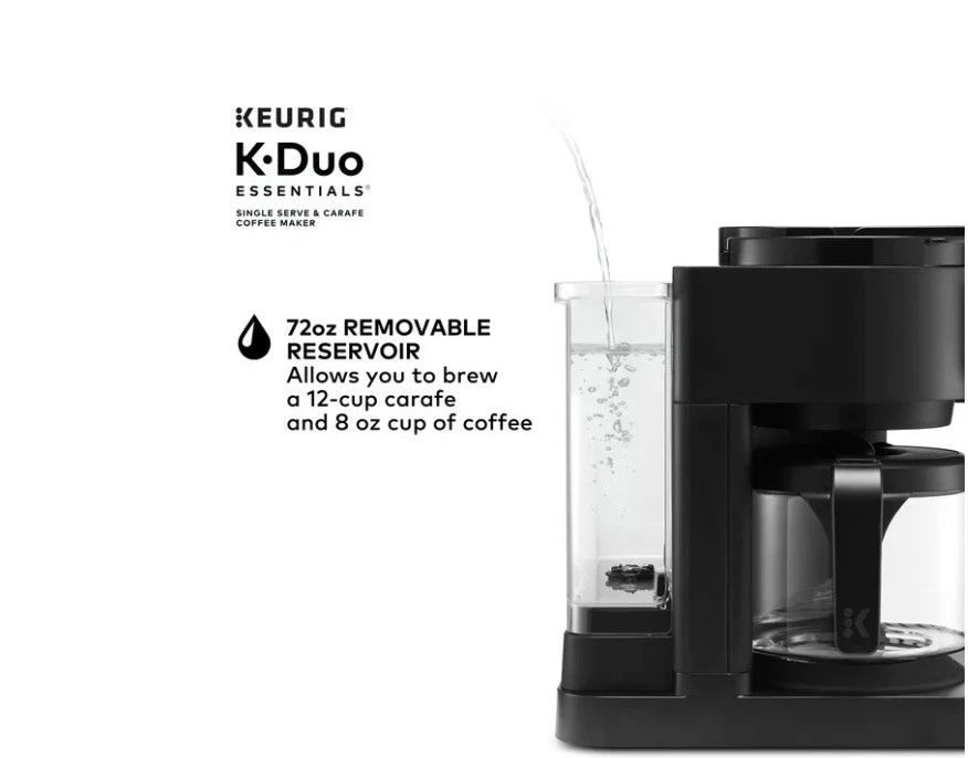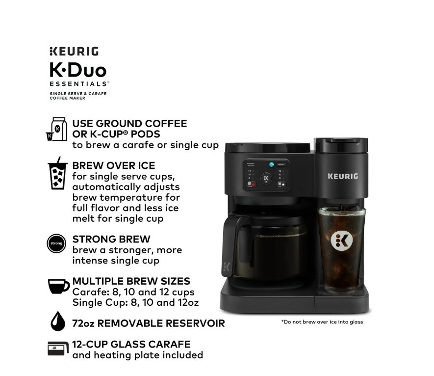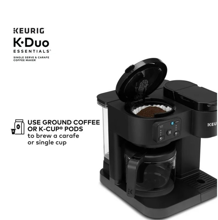 Product details The Keurig K-Duo Essentials Coffee Maker is the ideal brewer for any coffee occasion. It brews single cups using K-Cup pods AND full carafes of your favorite coffee grounds – all in one compact unit. It features a large 72 oz. removable water reservoir that feeds both sides of the brewer, which means faster, easier brewing with fewer refills. The single-cup side brews all your favorite K-Cup pod flavors in your choice of 8, 10, or 12-oz sizes. It offers the Brew Over Ice option for making refreshing iced coffees or teas, as well as the Strong Brew option, which makes a bolder, more intense flavor for your cup. On the carafe side, you can drip-brew full pots of your favorite grounds in 8, 10, or 12-cup sizes. It features a glass carafe and heating plate for keeping your coffee hot, as well as the Pause & Pour feature which allows you to pause mid-brew to serve fresh, hot coffee. Whether you’re serving a crowd or serving yourself, whether you need a pot of regular and a cup of decaf…no matter the situation, the K-Duo Essentials is the perfect solution. Available exclusively at Walmart. BREW BY THE CUP OR CARAFE: Brews both K-cup® pods and coffee grounds. ONE 72 OZ RESERVOIR: The extra-large 72 oz removable reservoir is shared by both sides for fast, convenient brewing with fewer refills. MULTIPLE BREW SIZES: Brew 8, 10, or 12-oz single cups or 8, 10, or 12-cup carafes. BREW OVER ICE: Adjusts temperature for maximum flavor and less ice melt for iced coffees and teas. STRONG BREW: Brews a stronger, more intense flavored cup. 12-CUP GLASS CARAFE: Included with brewer, along with heating plate to keep fresh coffee hot. PAUSE & POUR: Automatically pause carafe brewing mid-brew so you can serve fresh hot coffee, then return the carafe and continue the brew. COMPACT DESIGN: The versatility of two kinds of brewers in one space-saving unit.