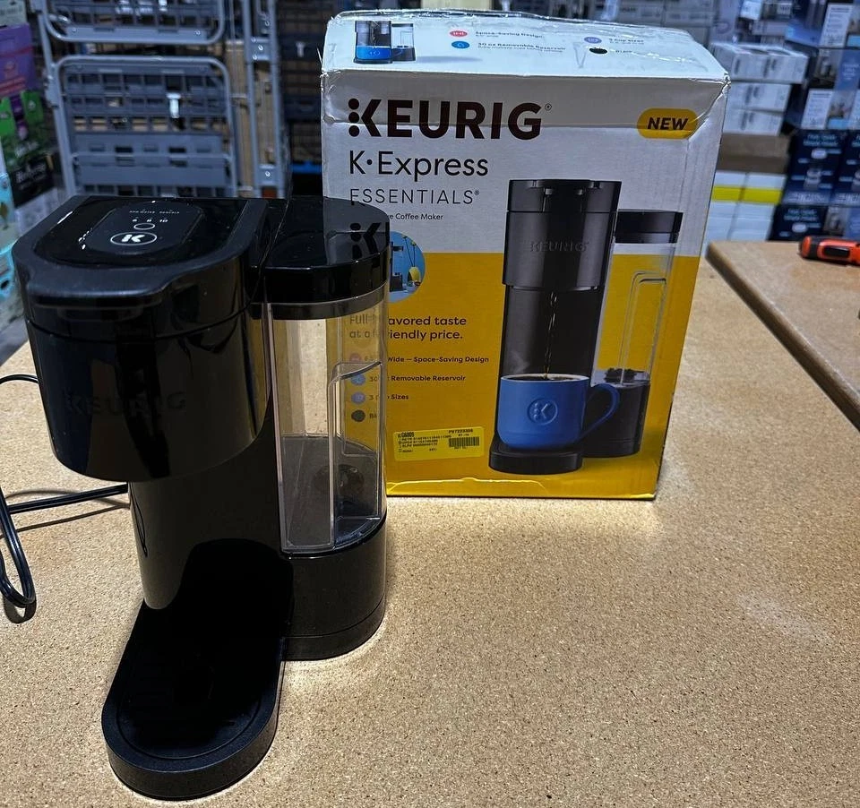 Keurig K-Express Essentials Single-Serve K-Cup Pod Coffee Maker – Black Enjoy fast, convenient, and rich coffee at home with the Keurig K-Express Essentials . This compact single-serve brewer offers the perfect balance of simplicity, speed, and great taste. With multiple brew sizes and compatibility with all K-Cup pods, it’s the ideal everyday coffee solution for home, office, dorm, or small spaces. ☕ Key Features Brews 3 Cup Sizes – Choose 8 oz, 10 oz, or 12 oz at the touch of a button. Strong, Rich Coffee – Designed to deliver a full-flavored cup using Keurig’s fast-brew technology. Fast & Simple Operation – One-button brewing makes it easy for anyone to use. Compatible with All K-Cup Pods – Enjoy coffee, tea, cocoa, and specialty beverages. Slim, Space-Saving Design – Perfect for countertops, apartments, office desks, and dorm rooms. Large 36 oz Removable Water Reservoir – Brew multiple cups before refilling. Auto-Off Energy Saver – Turns off automatically after 5 minutes to save power. 📐 Product Details Model: K-Express Essentials Color: Black UPC: 611247404881 Brew Sizes: 8, 10, 12 oz Water Tank Capacity: 36 oz Dimensions: Compact, space-efficient profile Compatibility: All Keurig K-Cup pods