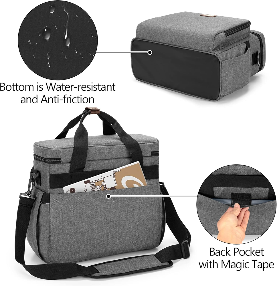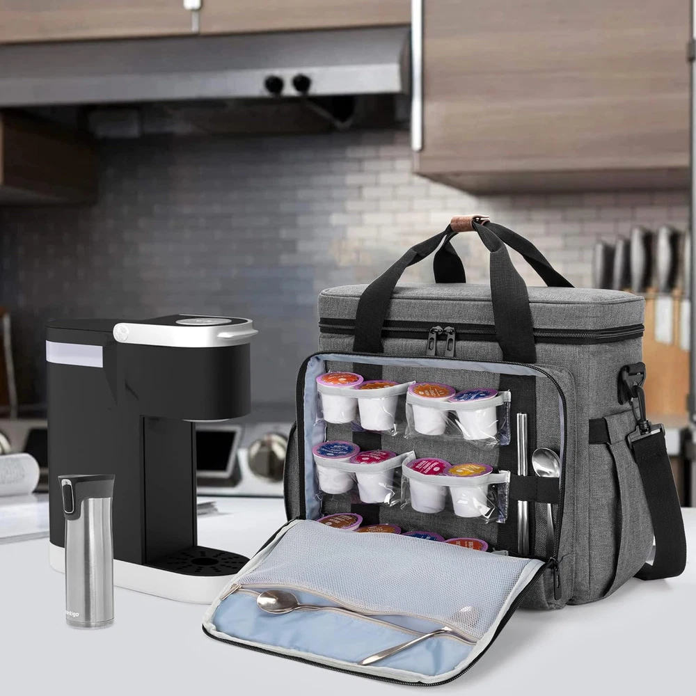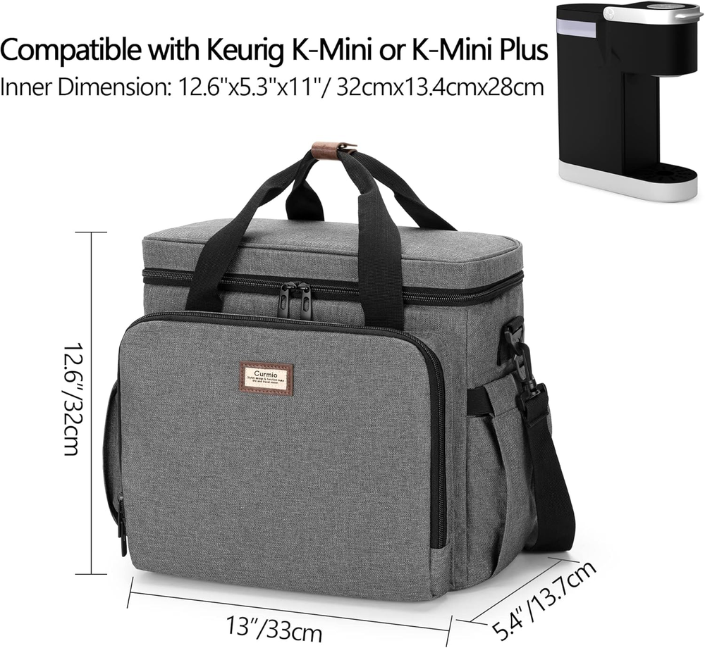 SNUG FIT: Main compartment dimensions 12.6" x 5.3" x 11", compatible with Keurig* K-Mini, K-Mini Plus, Nespresso* Essenza Mini, Pixie, Inissia and Citiz coffee machine. (Bag only, NOT includes coffee machine and accessories.) (*CURMIO carrying case is unrelated to brand referred.) FUNCTIONAL: 2 zipper pockets, 6 transparent pockets and 4 elastic loops for arranging coffee pods, creamers, sugar packets, spoons, stirrers, etc. Side pockets with elastic top for keeping travel mugs or water bottles. Back pocket for other things you need. DECENT DESIGN: Made of heavy duty nylon fabrics with quality aluminum foil lining and foam padding, well insulated and constructed, keeping items from dust, scratches, and bumps. Convenient to wipe down with soapy, damp cloth. 3 CARRYING OPTIONS: Portable top handle and detachable padded shoulder strap make it easy to transport your brewer. Back strap allows you to slide it over the luggage handle and free your hands. FITS FOR: CURMIO coffee maker carrying case would be a great companion to those who travel with coffee brewers. Ideal for camping, conventions, or vacations. Product Description CURMIO Coffee Maker Travel Bag (Bag only, NOT includes coffee machine and accessories.) Main compartment dimensions 12.6" x 5.3" x 11". Compatible with Keurig* K-Mini, K-Mini Plus, Nespresso* Essenza Mini, Pixie, Inissia and Citiz coffee machine. (*CURMIO carrying case is unrelated to brand referred.) Front compartment has 1 zipper pocket, 6 transparent pockets and 4 elastic loops for arranging coffee pods, creamers, sugar packets, spoons, stirrers, etc. Side pockets with elastic top for keeping travel mugs or water bottles. Back pocket with adhesive strap for other things you need. Portable top handle and detachable padded shoulder strap make it easy to transport your brewer. Back strap allows you to slide it over the luggage handle and free your hands.