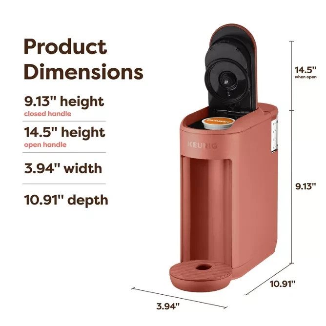 SHIPPED DIRECTLY FROM THE USA--FREE SHIPPING--NO IMPORT TAX The new Keurig® K-Mini Mate™ Single Serve Coffee Maker is tiny but mighty with big flavor in an unbelievably small package. Don’t let its size fool you – this modern, sleekly designed brewer is a one-cup coffee maker that brews the perfect tasting cup. Complete with the same brewing technology as many bigger Keurig coffee machines, this mini coffee companion brews a cup up to 12oz with the flavor you love from any of our hundreds of K-Cup® pod varieties. At just 4" wide, it's the smallest Keurig brewer ever, making it a major space-saver when it comes to your daily cup. Perfect for small kitchens, dorm rooms, and tiny apartments, the K-Mini Mate brewer’s compact design means it can fit almost anywhere you might want to place it. Whether you’re at home or just want to make somewhere feel like home, the K-Mini Mate brewer is your perfect travel companion. Just plug it in and you’ll have the convenience and coffee quality you love about Keurig brewers. FEATURES: 1. SMALL SPACE SAVER Compact at 4" wide for brewing the perfect cup of coffee in small kitchens, dorm rooms, offices, and surfaces with limited space. 2. 12 OZ CUP Features a One Cup reservoir for a freshly brewed cup, up to 12 oz. 3. TRAVEL MUG FRIENDLY Fits up to a 7.25” to-go coffee cup so you can brew and go! 4. FRESH & MODERN Featuring a sleek, minimal design that blends with your lifestyle. 5. ELEVATED COLORS Available in aesthetic colors that match your style.
