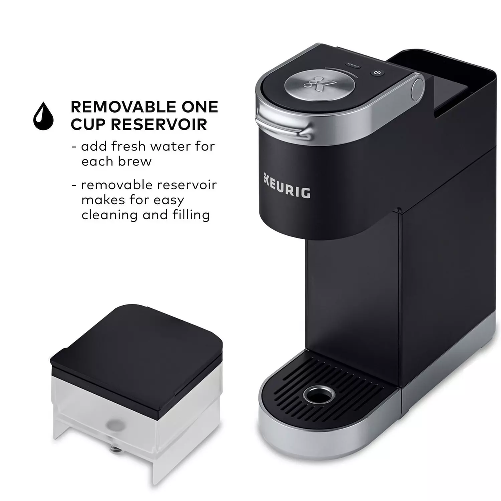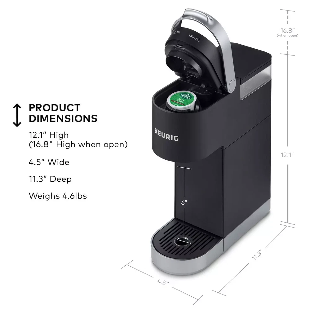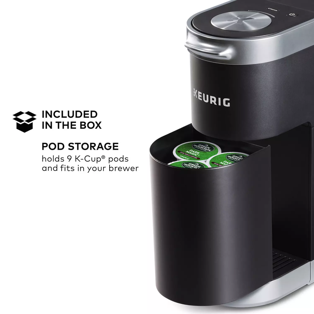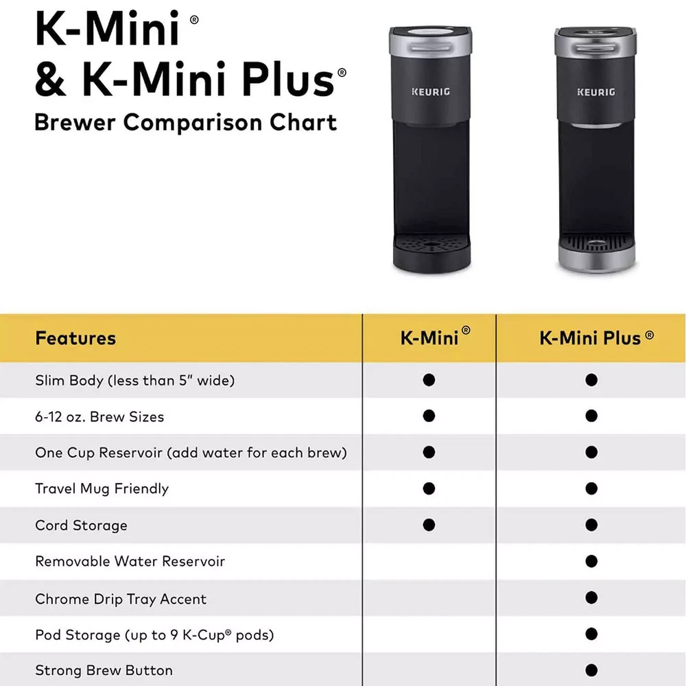 WHAT'S IN THE BOX: Keurig K-Mini Plus single serve coffee maker, pod storage unit that fits in your brewer and can hold up to 9 K-Cup pods. FITS ANYWHERE: Less than 5 inches wide, perfect for small spaces. STRONG BREW: Brew a stronger, more intense cup. YOUR PERFECT AMOUNT: Brew any cup size between 6-12oz with Keurig K-Cup pods. REMOVABLE ONE CUP RESERVOIR: Just add fresh water for each brew. Removable reservoir makes for easy cleaning and filling. FAST & FRESH BREWED: Coffee made in minutes. POD STORAGE: Holds 9 K-Cup pods and fits in your brewer for ultimate portability and saves counter space. CORD STORAGE: For easy transport and tidy countertops. TRAVEL MUG FRIENDLY: Removable drip tray accommodates travel mugs up to 7.0 inches tall and holds a full accidental brew for easy cleanup. ENERGY EFFICIENT: Auto off feature turns off your coffee maker 90 seconds after your last brew, helping to save energy. COMPATIBLE WITH THE MY K-CUP UNIVERSAL REUSABLE COFFEE FILTER: Brew your own ground coffee (sold separately). MATTE FINISH: Sleek simplicity meets modern style, the K-Mini Plus coffee maker is available in a variety of matte-finish colors with silver detailing on the handle and drip tray. KEURIG BREWER CONDITION - New