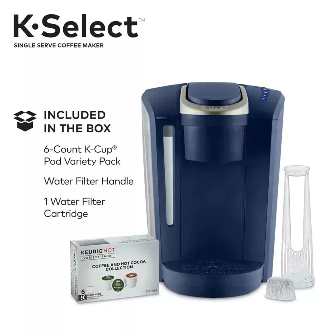 Keurig K-Select Single-Serve K-Cup Pod Coffee Maker - Matte Navy NEW BOX Key Features: • Strong Brew for a stronger, more intense cup • Brews 6, 8, 10, and 12 oz. sizes • 52-ounce removable side water reservoir • Programmable auto off • Removable drip tray accommodates travel mugs • Quiet Brew Technology™ Feature • Made from fingerprint resistant materials • Descale maintenance reminder • High altitude setting • Brews in under a minute • Compatible with the My K-Cup® Universal Reusable Coffee Filter Specs: • 12.5" High x 9.2" Wide x 11.6" Deep (17" high with bale open) • Accommodates travel mugs up to 7.4" tall • 7.4 lbs.