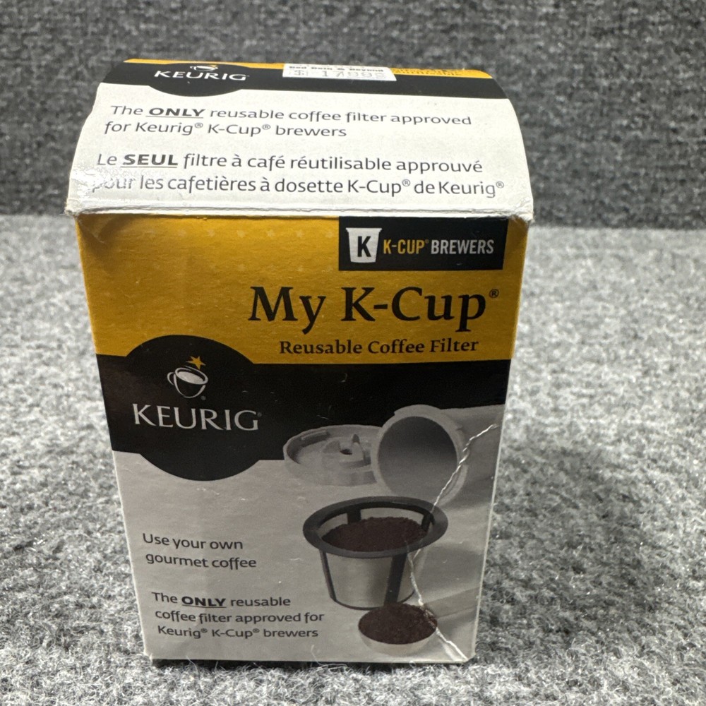 This Keurig Gourmet Single Cup Reusable Coffee Filter, also known as "My K-Cup," is designed for use with Keurig home brewers (excluding B100 models). It is compatible with various Keurig models, allowing you to use your own coffee grounds. The filter is made of lightweight plastic in a black and gray color scheme, with a capacity for brewing 1 cup of coffee. The item dimensions are 2 inches in depth, 3 inches in height, and 2 inches in width.