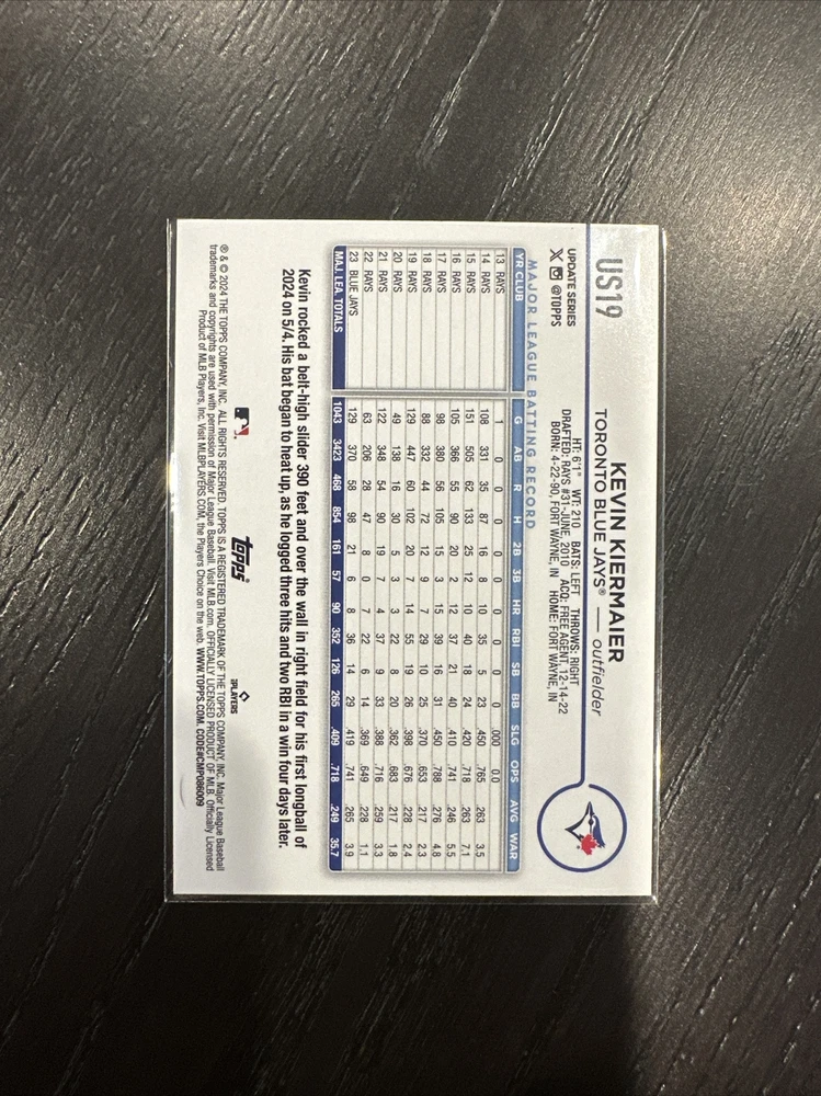 Parallel/Variety: Rainbow Foil Features: Parallel/Variety Manufacturer: Topps Card Number: US19 Team: Toronto Blue Jays Sport: Baseball Season: 2024 Type: Sports Trading Card Player/Athlete: Kevin Kiermaier Set: 2024 Topps