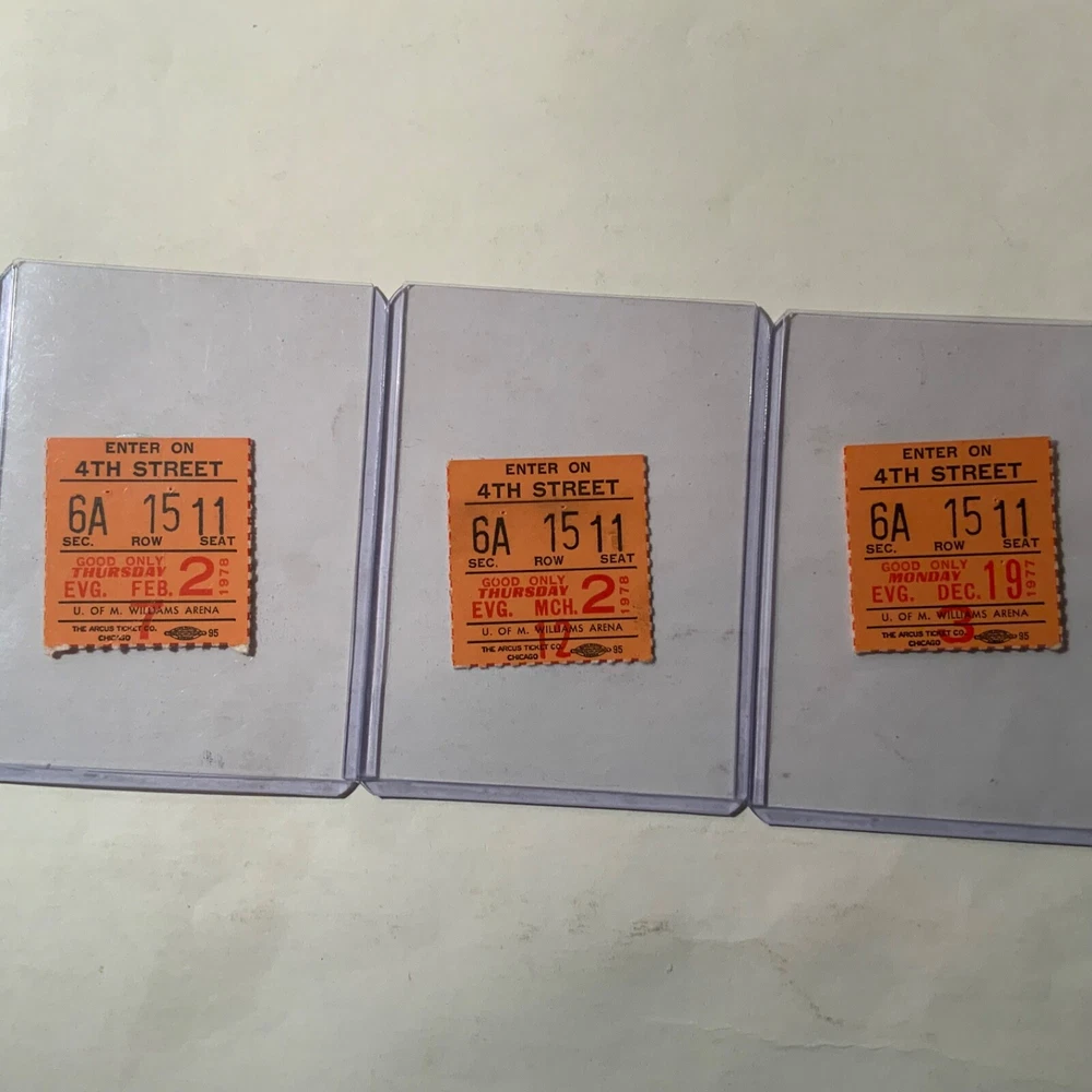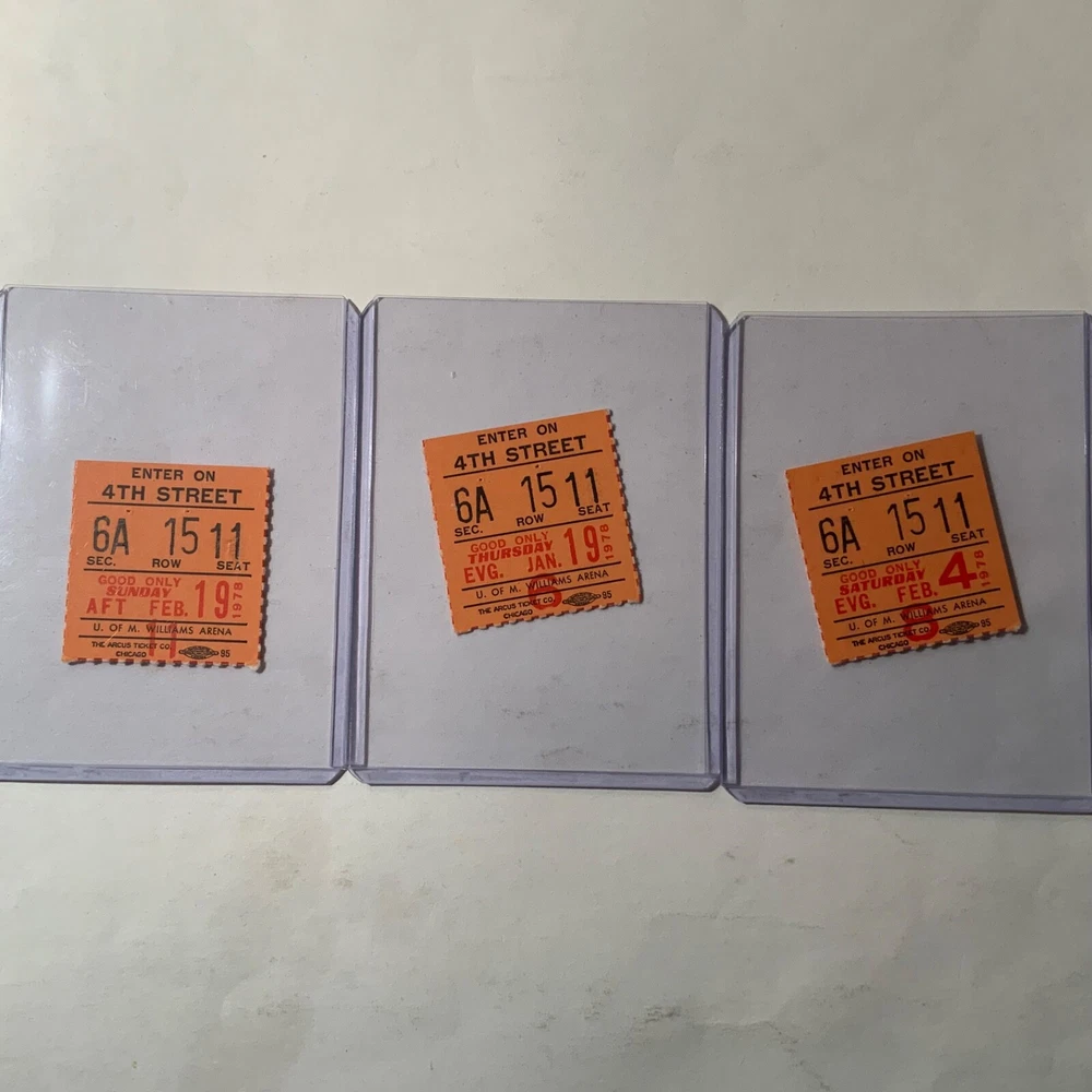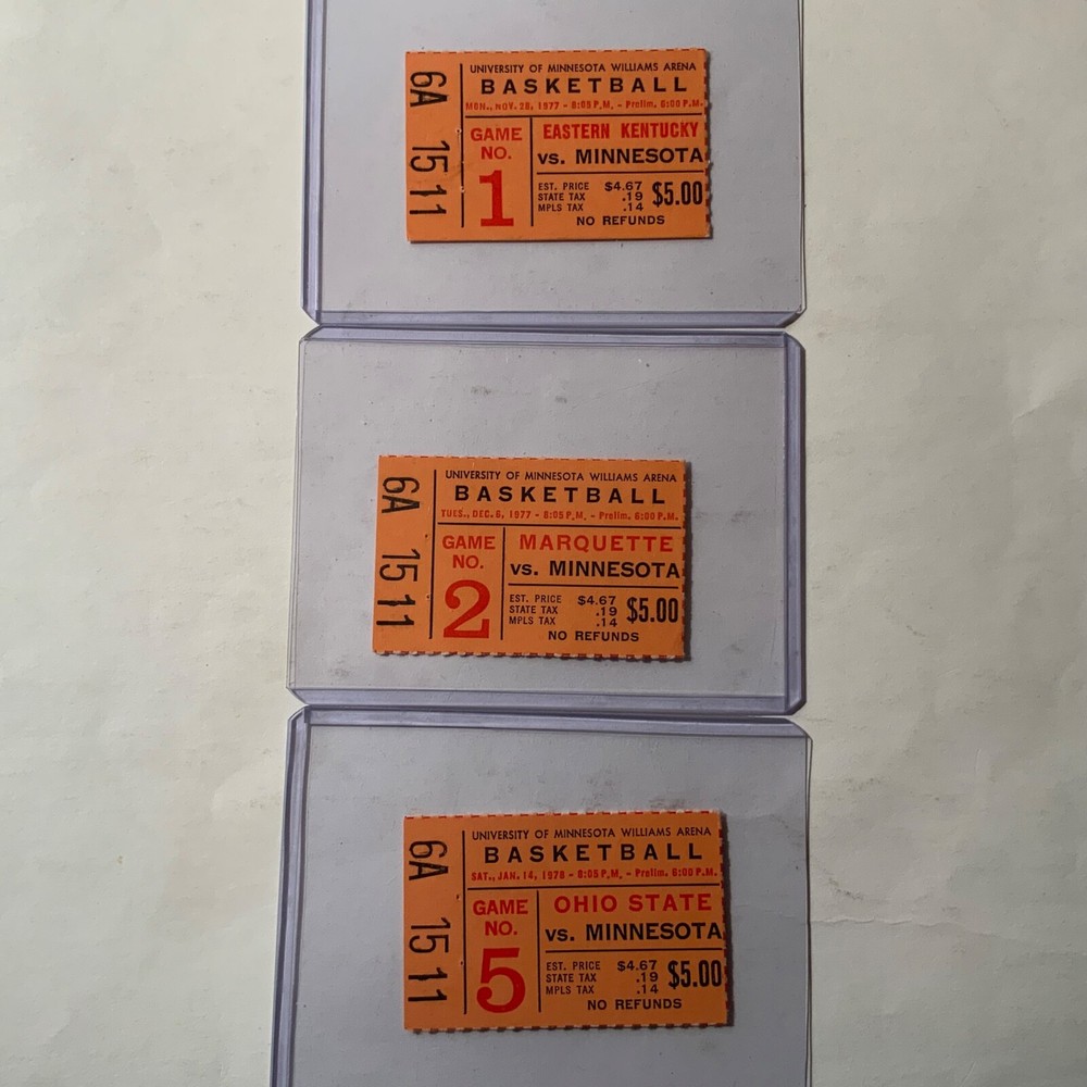 VG - EX. Nine ticket stubs + a season ticket holder booklet from the 1977-78 Minnesota Gophers basketball team that featured sophomore, and future NBA Hall of Famer, Kevin McHale (and Klay Thompson’s dad, Mychal Thompson): 1. 11/28/1977 - vs. Eastern Kentucky 2. 12/06/1977 - vs. #4 ranked Marquette (Butch Lee & Jerome Whitehead) 3. 12/19/1977 - vs. Nebraska 4. 01/14/1978 - vs. Ohio St. (Herb Williams) 5. 01/19/1978 - vs. Illinois (Eddie Johnson) 6. 02/02/1978 - vs. Iowa (Ronnie Lester) 7. 02/04/1978 - vs. Northwestern 8. 02/19/1978 - vs. #9 ranked Louisville (Darrell Griffith) 9. 03/02/1978 - vs. Michigan (Mike McGee) + booklet that once held full season tickets. + 8 X 10 of McHale showing defensive prowess.