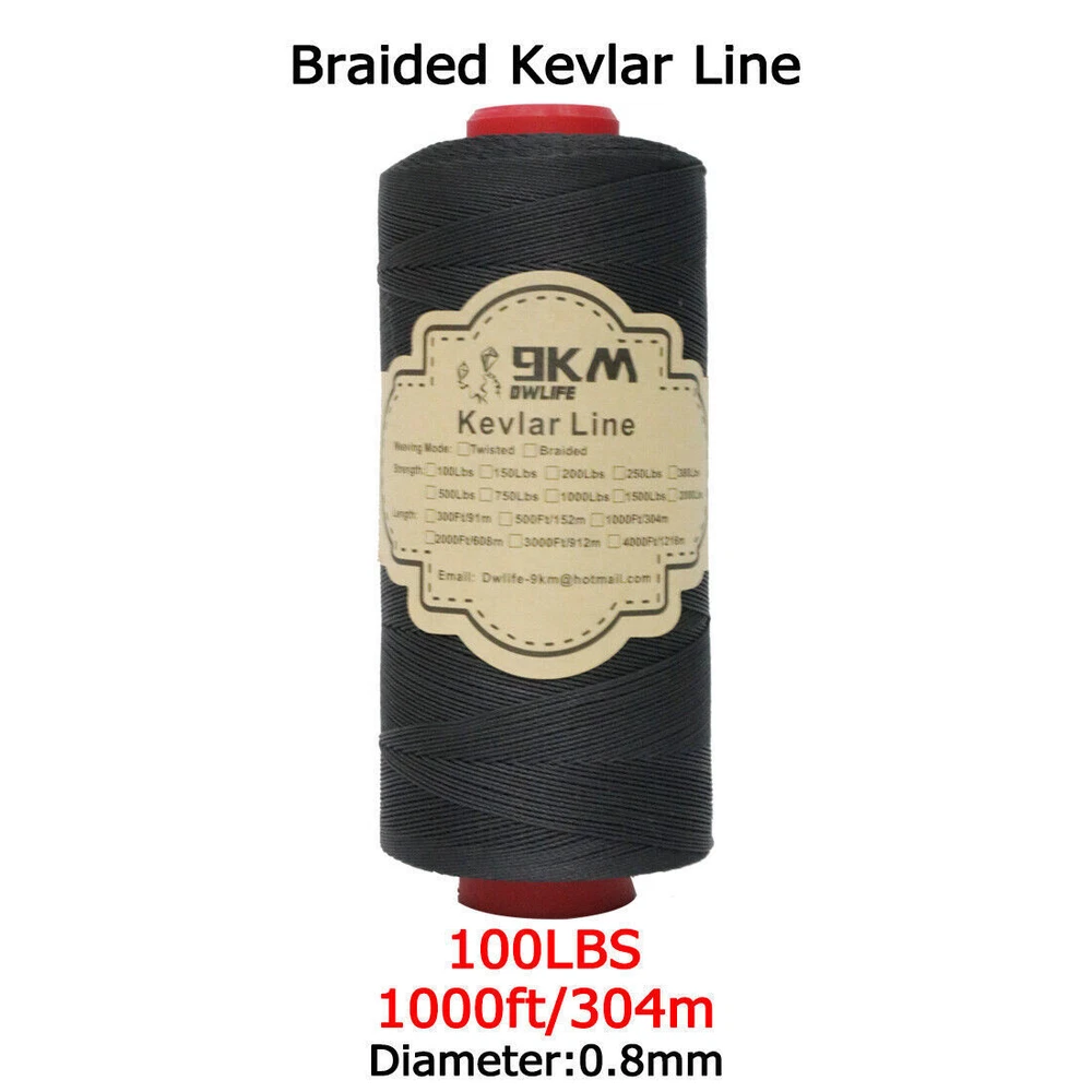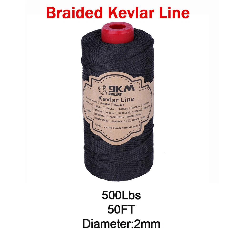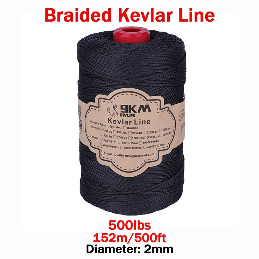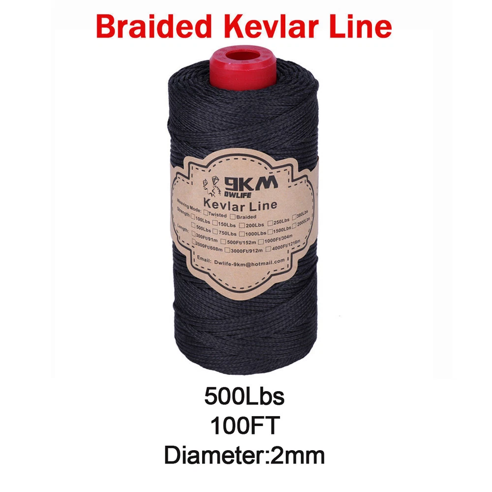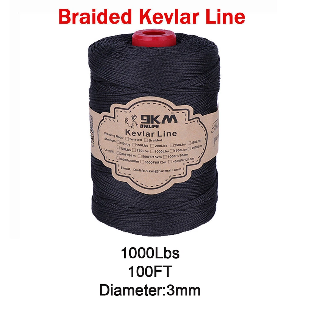 50lb-1500lb BRAIDED KEVLAR LINE Kevlar Fiber: The braided kevlar string is made of 100% kelvar fiber which is of high strength, high harness, high toughness and high abrasion resistance. Construction of Braid: Multi-strands interweaving process makes the string / cord much more durable, and it won't unravel like twisted line. Tough String: Every kevlar fiber is of high tensile strength. It exerts much higher strength in the same diameter. Cut-Resistance: One of the best advantages of Kevlar string. It helps avoid many unexpected string snaps which happen a lot in binding and fastening objects with sharp edges. Application: We provide strings from 100lb to 1500lb to meet different requirements, like, fishing, camping / hiking equipment fastening, usual outdoor line, plant support, gardening work, decoration hanging, creative projects, etc. Strength - Diameter - Weight per Meter: Approximately ±2~3% deviation exists in measurement. AMAZING Black COLOR! Great for outdoors Light weight, high tensile strength and small diameter make Kevlar cordage a great choice for below activities: Kites Flying String / Fishing Assist Line Large Model Rocket Cord / Speargun Shooting Line Camping Tarp Ridge Lines / Ultralight Backpacking Climbing / Rigging Sling / Survival Gear / Emergency Repair Cord Hiking Equipment Fastening / Tent Guy Lines Plant support / Arborist accessories Gardening Work / Decoration Hanging / Mason's line / Creative projects, etc. Notice:Around 90% of original strength is the safety working load. It‘s testing result from line factory.