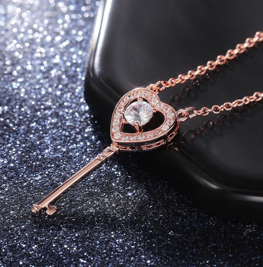 Key Hollow heart Simulated Diamond Micro Pave Rose Gold Plated Necklace, EVGG1101 ✅ Necklace Length: 18 Inch ✅ Metal: Rose Gold Plated over High Quality Brass ✅ Stone: Simulated Diamond ✅ High Quality Material ✅ Hand Crafted with love and care ✅ Perfect for gift, holiday, Christmas, birthday, vacation, Mother's day, Valentine's day, wedding, engagement , bridal, promise, anniversary, party ✨ Please feel free to message me if you have any questions. ✨ Thank You..!!
