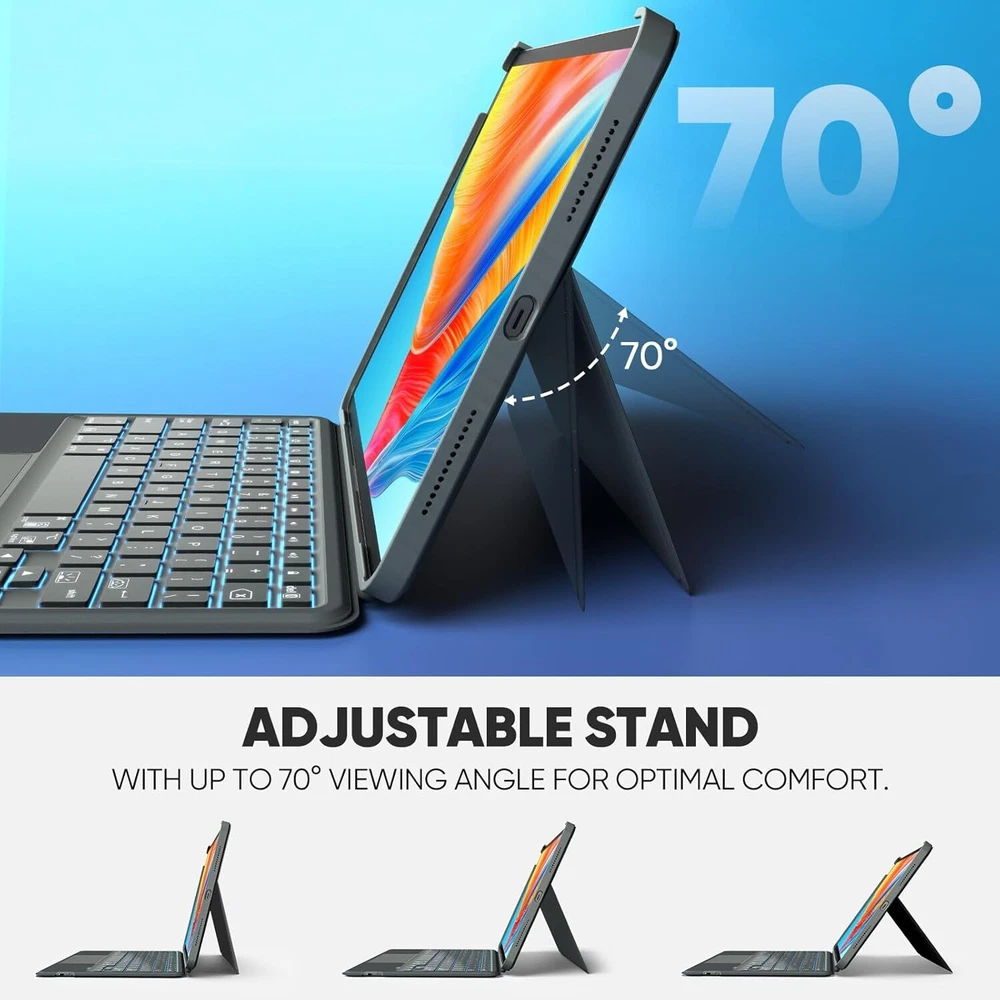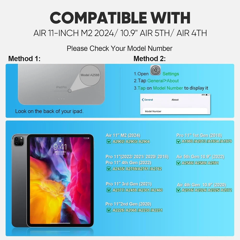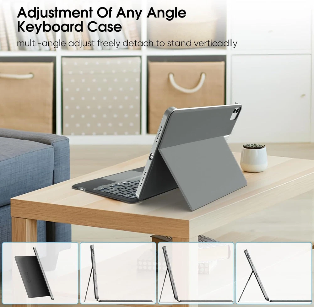 Keyboard Case for iPad -Air 11- inch 2024 & Pro 11 grey Product Details Product Dimensions: 11 x 8 x 1 inches Item Weight: 1.94 pounds Manufacturer: PUTIANSHI NIUDABIWANG MAOYIYOUXIANGONGSI Batteries: 1 Lithium Ion batteries required. (included) Brand: CAPNEW Compatible Devices: iPad Air 5/4 10.9 inch (2022/2020), iPad Air 6 11 inch (2024), iPad Pro 11 4/3/2/1(2022-2018) Connectivity Technology: Bluetooth Keyboard Description: Multi Functional Recommended Uses For Product: Everyday Use Special Feature: Lightweight, Backlit, Foldable, Trackpad, Rechargeable Color: grey Number of Keys: 1 Style: Classic Product Dimensions: 11"L x 8"W x 1"H Compatibility: only compatible with iPad Air 11 inch(2024), iPad Air 6th Generation (2024), iPad Pro 11 inch (2022/2021/2020/2018), iPad Air 5th Generation (2022), and iPad Air 4th Generation (2020); models A2759, A2435, A2761, A2759, A2435, A2761, A2316, A2324, A2325, A2072, A2377, A2459, A2301, A2460, A2068, A2228, A2230, A2231, A1980, A2013, A1934, and A1979 Work from Anywhere: Elevate your iPad Pro 11 Inch Case experience with our precise, versatile keyboard. Effortlessly navigate work and play with a full-area trackpad, and have 7-color backlight with 3 adjustable levels of brightness. Size: 25*19.5*2 cm Five Placement Detachable Modes:The touch keyboard for iPad is magnetically connected, making it easy to detach. It can switch between five placement modes for work, study, watching movies, drawing, and reading Lightweight and Portable Design: Boasting a slim, lightweight profile, And with a touchpad function. the keyboard case edge is the ideal companion for on-the-go users who seek functionality without additional bulk Keyboard Case for ipad Air 6/5/4th: Bluetooth keyboard with a rechargeable battery providing over 60 hours of use and 100+ hours of standby time. Lightweight, the keyboard can be removed and used as an iPad protective case