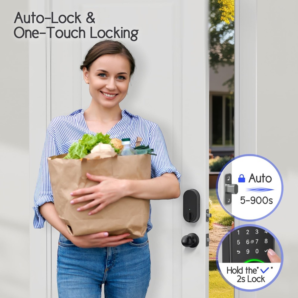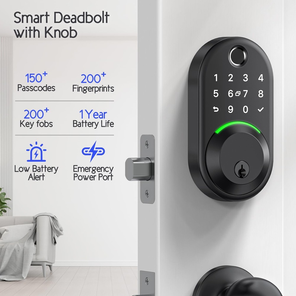 Keypad Smart Lock with Knob set,Keyless Entry Door Lock Deadbolt with Handle,Front Door Lock Set,Fingerprint Door Lock Set. Smarter and More Secure: Take control of your smart door lock with the app/PC, or use fingerprints, keypad, IC card, mechanical key, voice control,The lock is made of aluminum alloy and has been tested many times to ensure its durability and security. Remote Access: You can control and monitor the lock anytime, anywhere by connecting to the gateway (sold separately), peace of mind to you. Versatile Applications: Our products are compatible with most standard US door,it can be adapted to a variety of conditions with an IP66 waterproof rating and a temperature range from -22°F to 185°F. It's perfect for homes, hotels, apartments, offices. Easy to use: Only a screwdriver is needed to install the lock easily, while the lock provides 150 passwords, 200 fingerprints and key fob, easy to manage and use. Exceptional Customer Service: Alongside our high-quality products, we prioritize excellent after-sales service. Enjoy a 30-day money-back guarantee, a 1-year product warranty,and lifetime after-sales support.