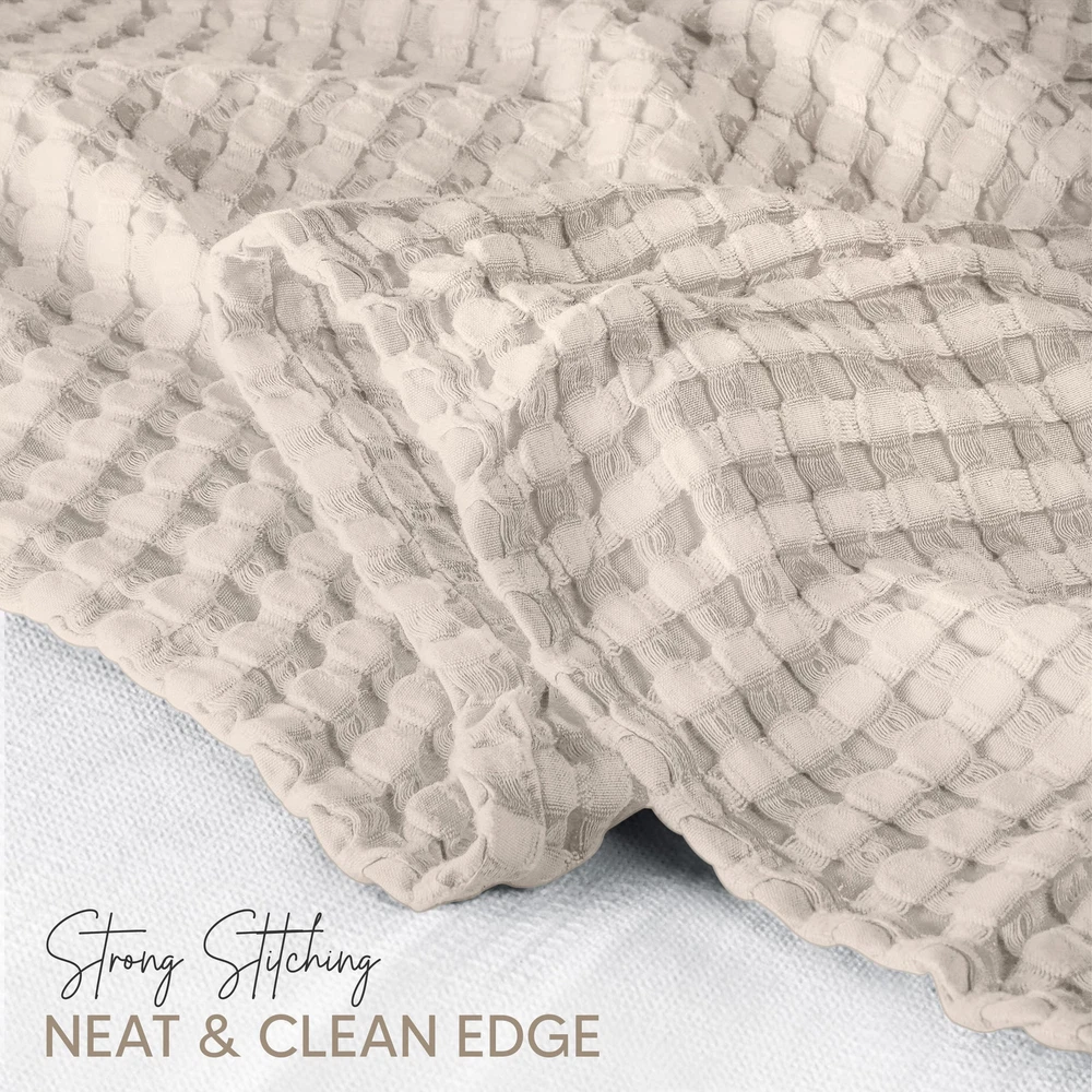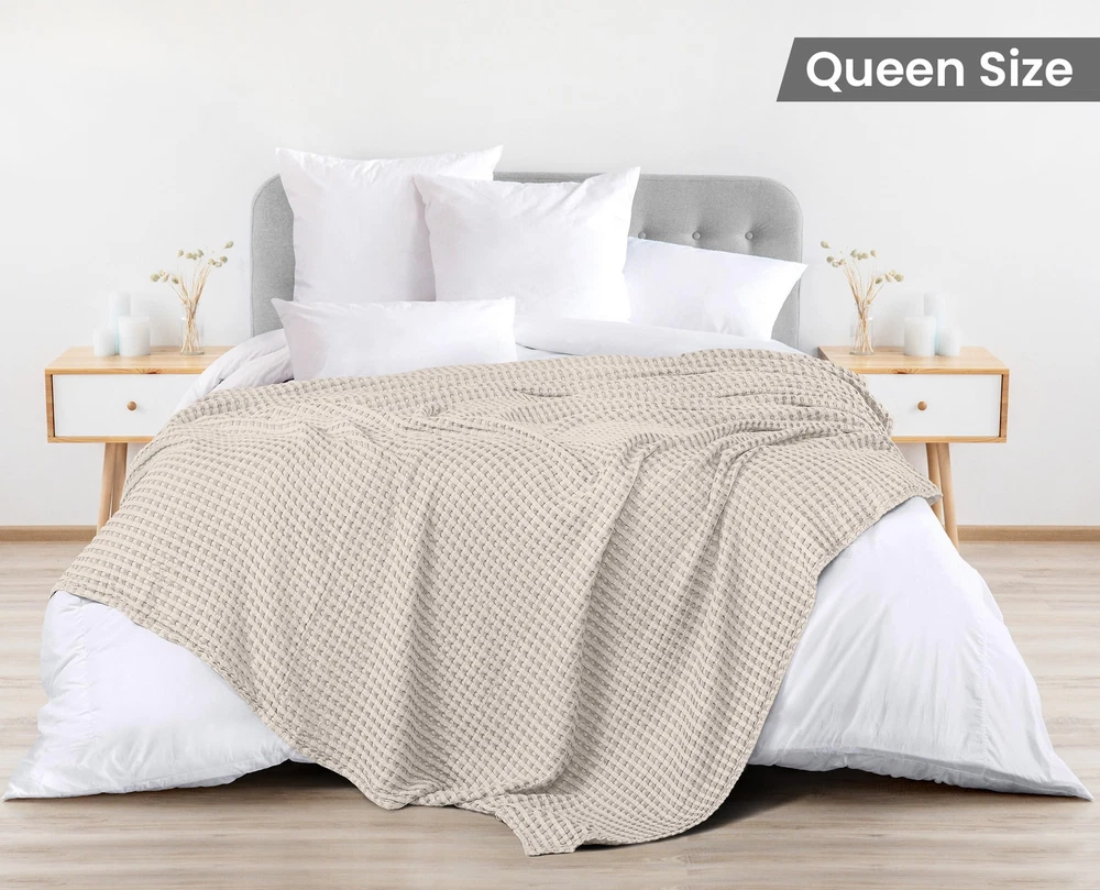 Waffle Weave – Skillfully constructed and neatly woven with a waffle weave texture, available in Queen, King, Twin Big, Throw and Full size is perfect for your comfort. The waffle weave pattern gives off a plush yet smooth feel. Add this layer of a cozy blanket to your bedding for a soothing retreat while enhancing the décor of the room. Quality Cotton Material – The waffle weave blanket is made of 100% cotton, creating a lavish experience for you and your family. When you drape it over yourself, on the bed or the couch, you will feel that it’s lightweight and allows breathability; providing a peaceful sleep at night. Solid Craftmanship – Featuring ring spun technology, it is expertly designed with self-binding edging that makes these blankets stronger and softer. Hence, the finishing of our waffle weave blankets is flawless and thorough. All-Season Blanket – A bedding essential in day-to-day life, this blanket will keep you warm in winters and cool on a hot summer night. This blanket has a versatile usage apart from bed or couch layering. You can use it outdoors for a picnic, traveling, while resting at the office, or carrying it in your cars. Care Instructions – The waffle weave blankets can be washed easily, as the fabric is cotton. There is no need to use harsh chemicals. They can be tumble dried or hung up to dry. To obtain the best results, it is recommended to wash them separately on first use.