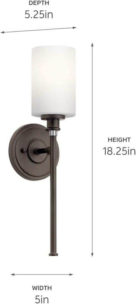 Kichler 45921OZL18 Transitional LED Wall Sconce from Joelson Collection Dark Finish, Olde Bronze Product Description Joelson delivers a 1-light wall sconce that's transitional and versatile enough for every room in the home. This light showcases a retro-inspired light bulb socket with beautiful satin etched cased opal glass. For added ambiance, Joelson is appointed with an Olde Bronze finish. This fixture features an LED light bulb.