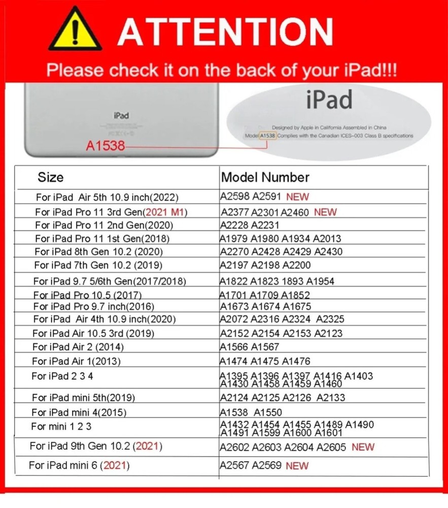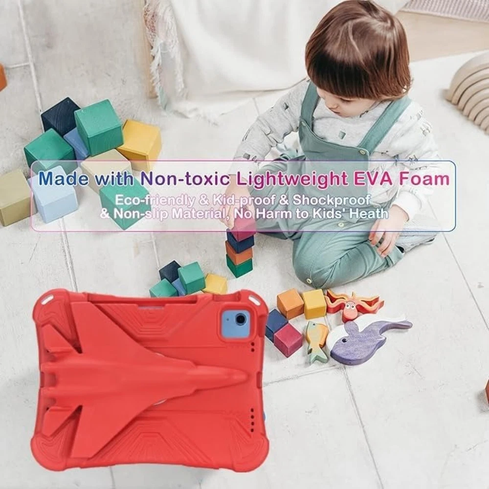 Features: 【Full Protection】 Made of durable, child-safe, lightweight, wear-resistant, shock-absorbing and heavy duty EVA Foam, protects your tablet from accidental drops and bumps. 【Unique 360°Airplane Stand】 Built-in 360 degree rotatable AIRPLANE kikstand, makes easy for kids to carry it around and hands-free viewing and comfortable typing. 【Precise Openings】 Easy access to all the controls and features. Perfect cutouts for speakers, cameras, ports. Also Raised edges keep screen and camera lifted to prevent surface scratches. 【Shockproof + Drop-proof】 Durable EVA foam enhanced drop protection with extra shock absorption to provide outstanding protection for the ultimate drop defense. 【Christmas Gift】High quality super sturdy light weight Non-toxic EVA protection case for kids. Lightweight,strong protection,easy to carry,environmentally safe,very suitable for children, boys, girls,kindergartens,schools.Great gifts for your baby kids children on Christmas. Package Included: 1 * EVA Foam Case ( Case Only, iPad, Pencil and Screen Prot ector Not Included ) Note: Because of different models, the holes of the protective case are also different. PLEASE CHECK THE MODEL OF YOUR IPAD ON THE BACK TO MAKE SURE IT MATCHES ONE OF THE MODEL NUMBERS IN THE TABLE BELOW Choose Model Name iPad Model Number Inch Year For iPad Mini 1/2/3/4/5 (7.9")-2012/2013/2014/2015/2019 A1432/A1454/A1455/A1489/ A1490/A1491/A1489/A1599/ A1600/A1550/A1538/A2133/ A2124/A2125/A2126 7.9 2012/2013/2014/2015/2019 For iPad 5/6(9.7"2017/2018) A1822/A1823/A1893/A1954 9.7 2017/2018 For iPad 7/8/9(10.2" 2019/2020/2021) A2197/A2198/A2199/A2200 /A2430/A2429/A2428/A2270 /A2602/A2603/A2604/A2605 10.2 2019/2020/2021 For iPad 10th Gen (10.9"2022) A2696/A2757/A2777 10.9 2022 For Apple iPad Air 1/2(9.7"2013/2014) A1474/A1475/A1476/A1566/A1567 9.7 2013/2014 For Apple iPad Air 3(10.5"2019) A2154/A2152/A2153/A2123 10.5 2019 For iPad Air 4/5 (10.9"2020/2022) A2316/A2324/A2325/A2072 /A2588/A2589/A2591 10.9 2020/2022 For iPad Pro 9.7" (2016) A1673/A1674/A1675 9.7 2016 For iPad Pro 10.5 (2017) A1701/A1709/A1852 10.5 2017 For iPad Pro 11" (2018/2020/2021/2022) A1979/A1980/A1934/A2013 /A2228/A2068/A2230/A2231 /A2301/A2377/A2459/A2460 /A2759/A2435/A2761/A2762 11 2018/2020/2021/2022