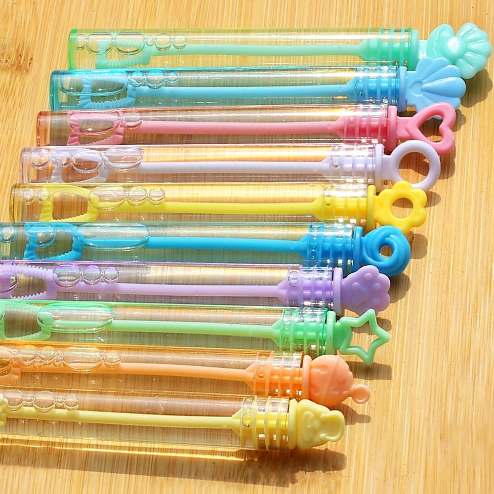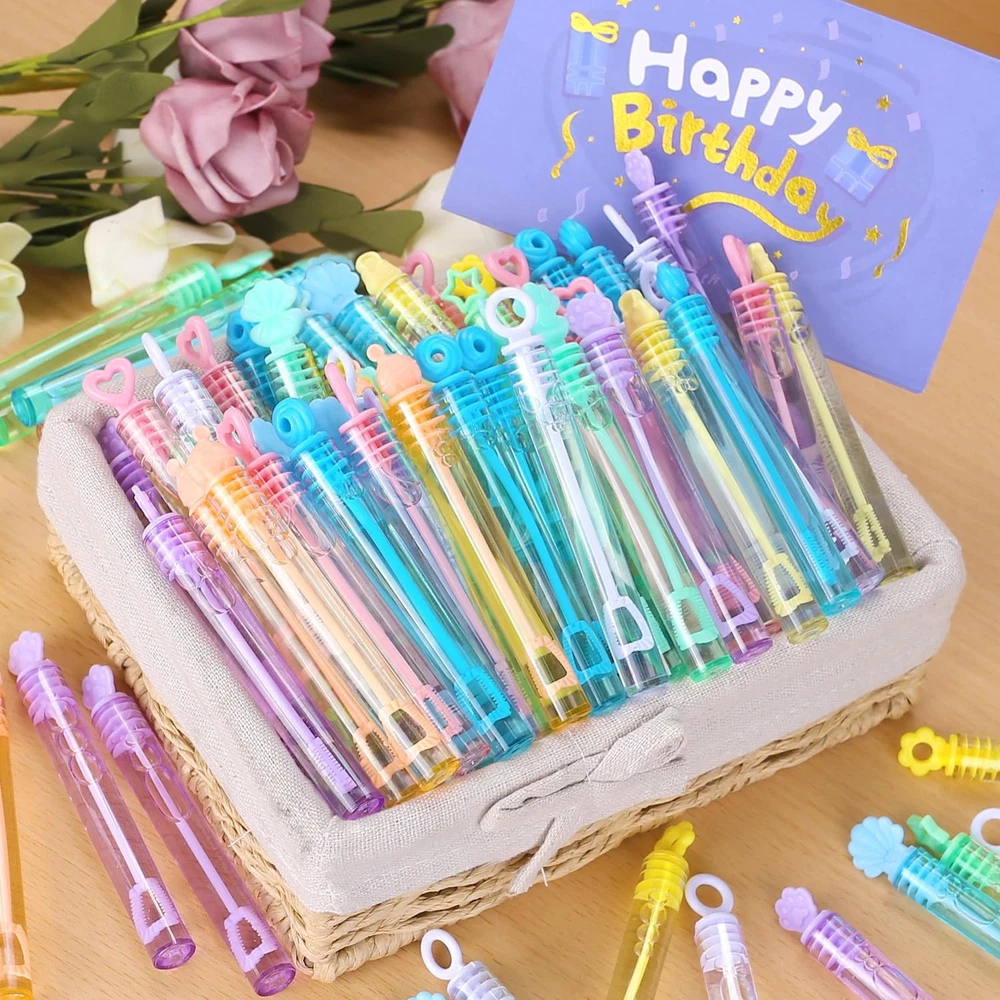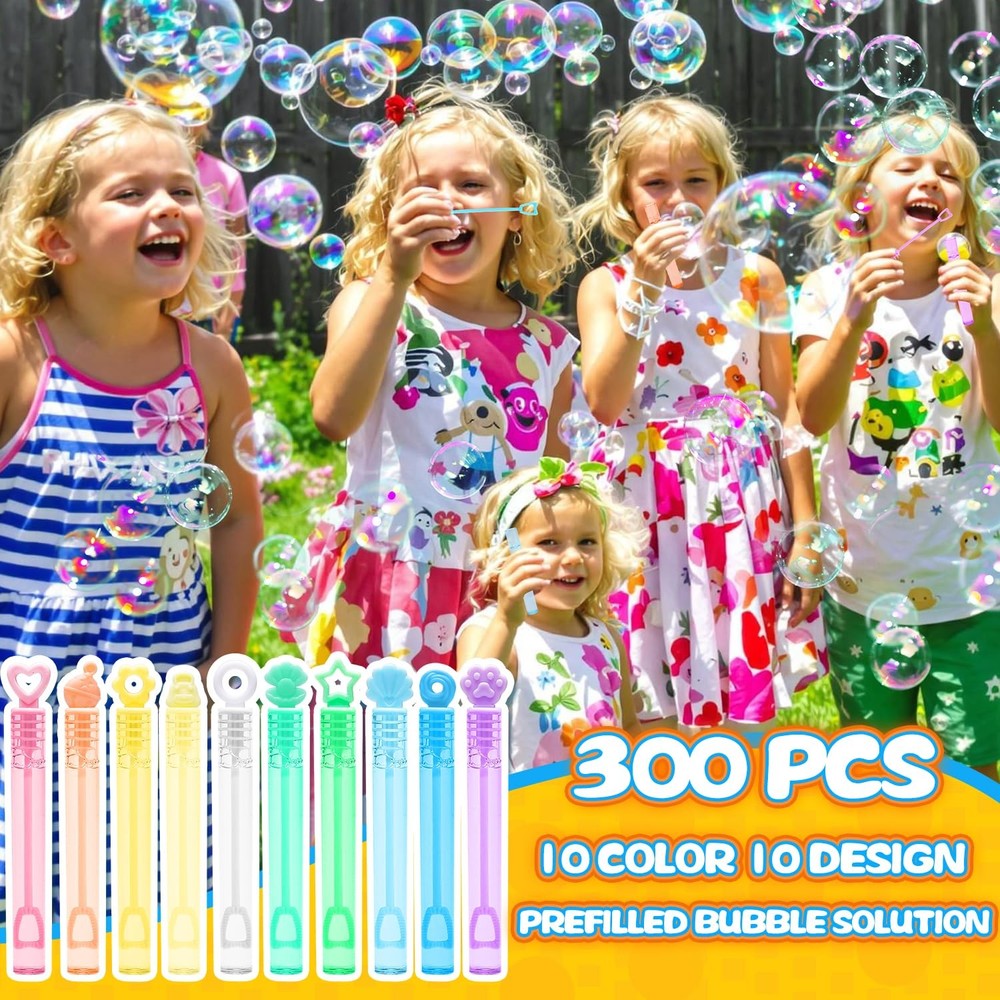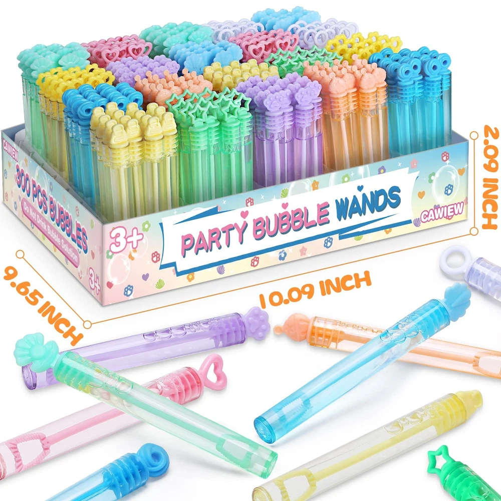 This bubble wand can liven up the atmosphere in many occasions and make your party more fun! Children in the party can simply blow bubbles and experience the colorful world brought by bubbles. Great for mermaid, princess, unicorn, ice cream, pool parties, kids' birthday parties, baby shower, bath time, wedding, pockets, goody bag stuffers, piñata filler, school bags, Easter baskets, Halloween carnival prizes, Thanksgiving, New Year gifts, etc.. Package include: 10 colors and 10 designs mini bubble wands with gift box Measure 4” tall and contains 0.2 oz bubble soap. Stars, shells, circles, hearts, flowers, and cat claws, etc. Corresponding to 10 different colors: cyan, light green, blue, light blue, white, pink, yellow, light yellow, light orange, and lavender Suitable for kid: 3 years old and age up All designs are patented 300 Pack mini bubble bulk with gift box(10 colors and 10 designs), including stars, shells, circles, hearts, flowers, and cat claws, ect. Each measures 4.1 inches (0.16 Fl Oz). Charming theme design perfect for summer events Perfect Packing: Featuring an innovative design, the gift box is fashioned to amaze in any setting. The assorted Pastel small bubble sticks can easily become decorations for theme parties without any additional trouble Bubbles for children: The bubble solution is non-toxic, safe, clean, and odorless. Perfect for boys, girls, and toddlers aged 3 years and up. Parents can feel confident while their children play Party Favors: These bubbles set wonderfully for mermaid, princess, unicorn, ice cream, and pool parties. Great for kids' birthdays, baby showers, bath time, and wedding. The bubble wands boost the festive atmosphere. Ideal Gifts: With a space-saving design that children can easily hold and put anywhere (pockets, goodie bags, pinata stuffing, school bags, Easter baskets, Halloween prizes, Thanksgiving, and New Year presents)