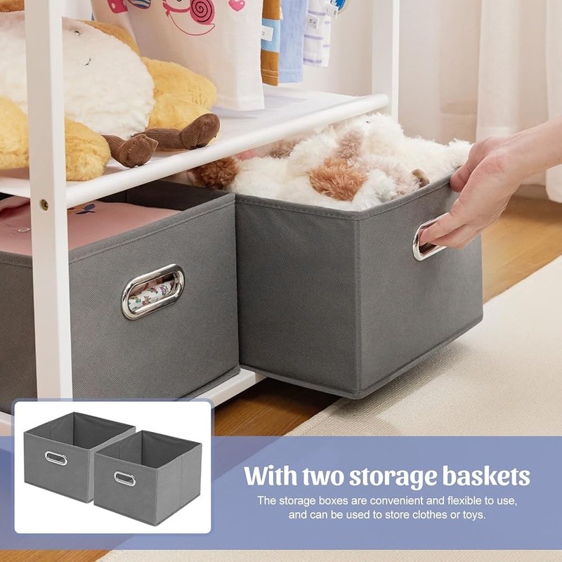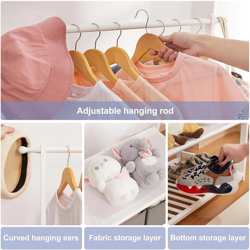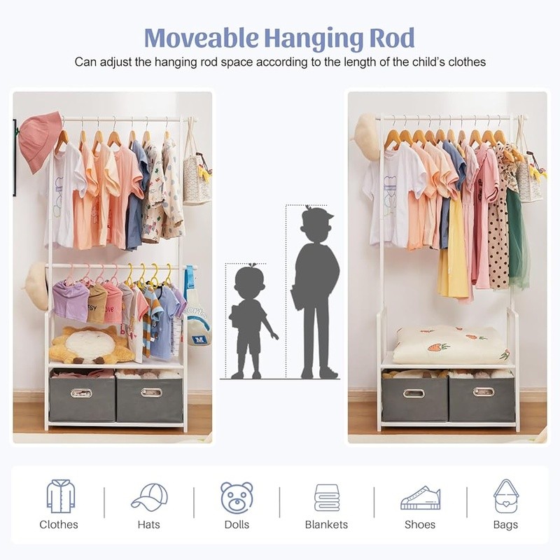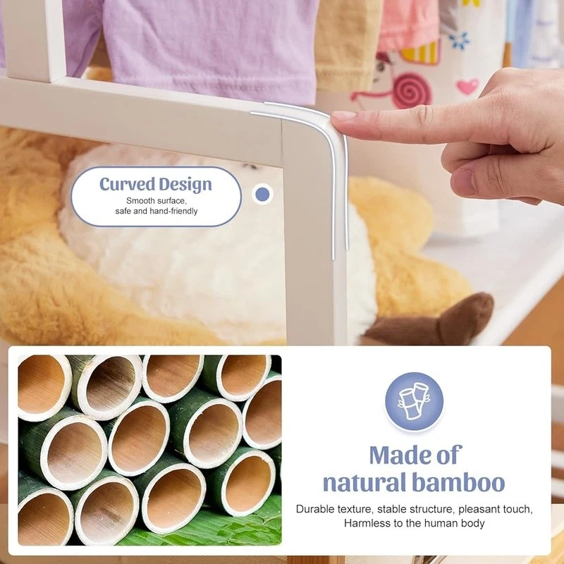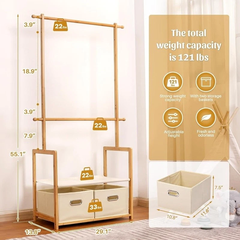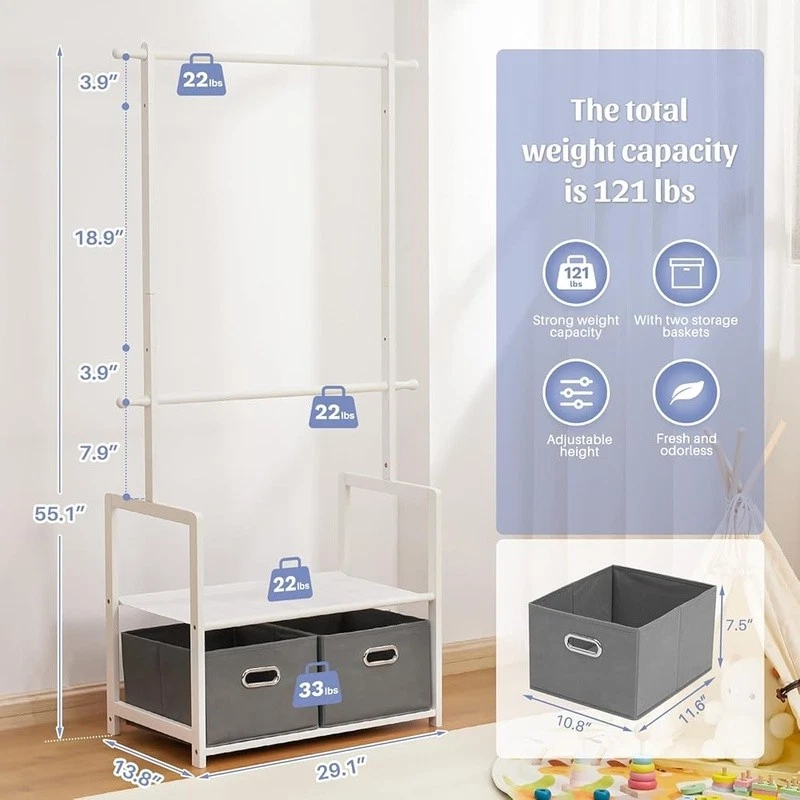 About this item With 2 Storage Baskets: Our kids clothing rack provides more storage space. The 2 storage baskets are convenient to carry and move. You can easily place them on bookshelves, wardrobes, or other storage spaces and adjust their positions as needed. They are suitable for storing your child's small items or toys,suitable for children aged over 8 years old 2 Adjustable Hanging Rods: This allows you to adjust the height of the hanging rods according to your child's height and needs, to accommodate different sizes of clothing and your child's growth. The height adjustment function of the hanging rods on our kids clothing rack is easy to operate and sturdy Partition and Storage: The kids clothing rack allows for partition storage, with 2 hanging rods to store different sizes of clothing, a middle layer for commonly used items, and a bottom shelf for storing children's shoes, books. The 2 storage baskets provide additional storage space. It allows children to better organize and store clothing, shoes, toys, and books Safety Design: Considering the safety of children, our kids clothing rack features a rounded design to avoid sharp edges. The surface of the clothes rack is polished smooth, ensuring safety and preventing hand injuries Bamboo Material: This kids clothing rack is made of natural bamboo, which is tough, stable in structure, and has a good touch. The bamboo material is also treated with PU paint, making it more sturdy and easy to clean. The maximum load of the entire children's clothes rack is up to 121 lbs › Brand: Color: White Material: Bamboo Recommended Uses For Product: Coats, Hats, Shoes, Tie & Belt Product Dimensions: 13.78"D x 23.19"W x 55.12"H