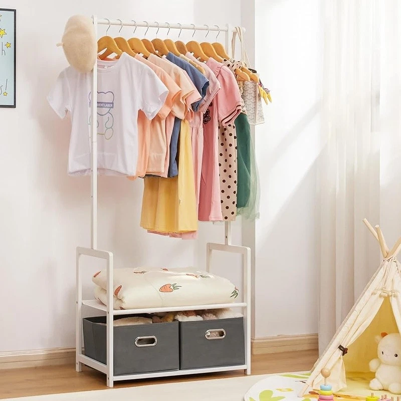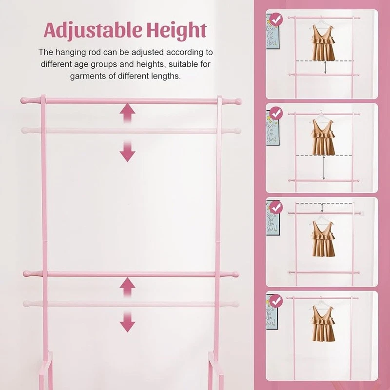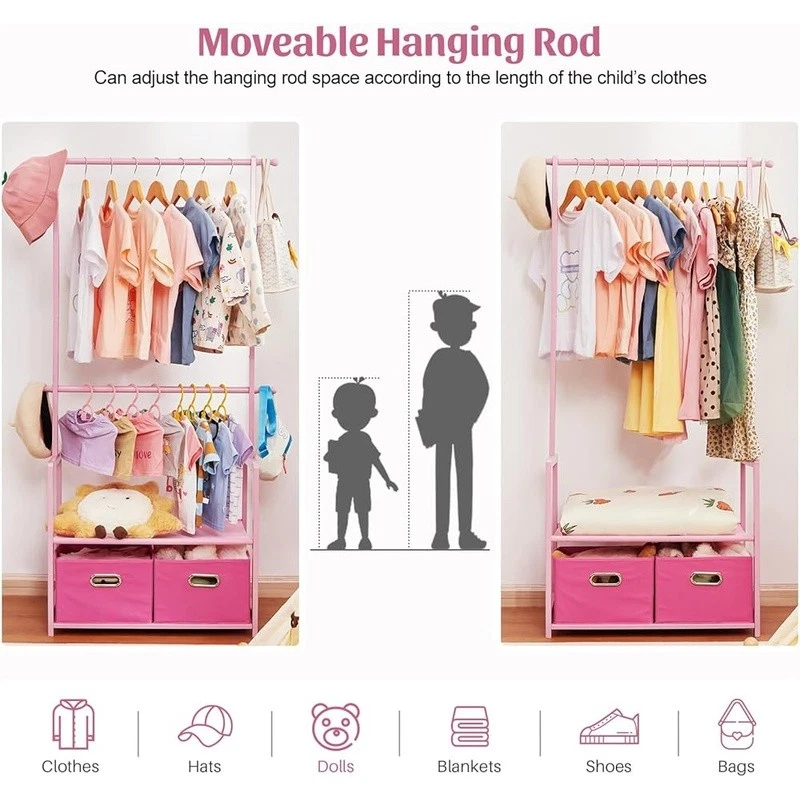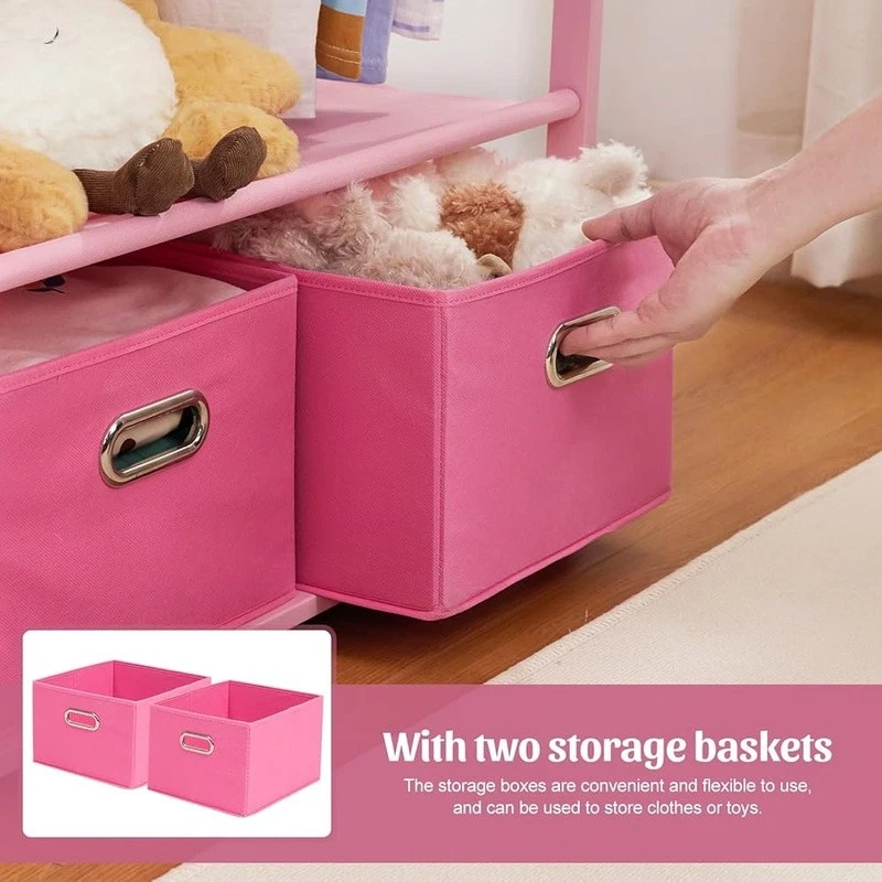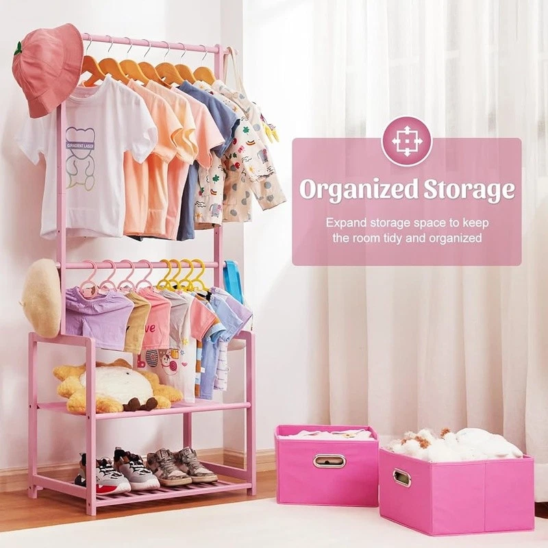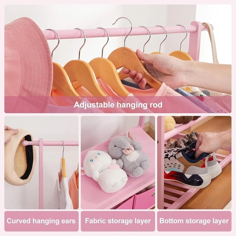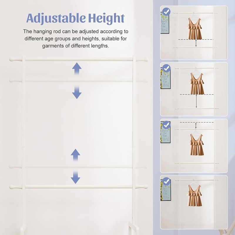 About this item With 2 Storage Baskets: Our kids clothing rack provides more storage space. The 2 storage baskets are convenient to carry and move. You can easily place them on bookshelves, wardrobes, or other storage spaces and adjust their positions as needed. They are suitable for storing your child's small items or toys,suitable for children aged over 8 years old 2 Adjustable Hanging Rods: This allows you to adjust the height of the hanging rods according to your child's height and needs, to accommodate different sizes of clothing and your child's growth. The height adjustment function of the hanging rods on our kids clothing rack is easy to operate and sturdy Partition and Storage: The kids clothing rack allows for partition storage, with 2 hanging rods to store different sizes of clothing, a middle layer for commonly used items, and a bottom shelf for storing children's shoes, books. The 2 storage baskets provide additional storage space. It allows children to better organize and store clothing, shoes, toys, and books Safety Design: Considering the safety of children, our kids clothing rack features a rounded design to avoid sharp edges. The surface of the clothes rack is polished smooth, ensuring safety and preventing hand injuries Bamboo Material: This kids clothing rack is made of natural bamboo, which is tough, stable in structure, and has a good touch. The bamboo material is also treated with PU paint, making it more sturdy and easy to clean. The maximum load of the entire children's clothes rack is up to 121 lbs › Brand: Color: White Material: Bamboo Recommended Uses For Product: Coats, Hats, Shoes, Tie & Belt Product Dimensions: 13.78"D x 23.19"W x 55.12"H