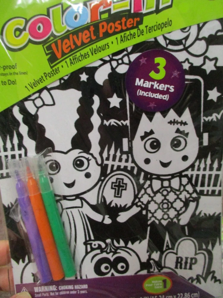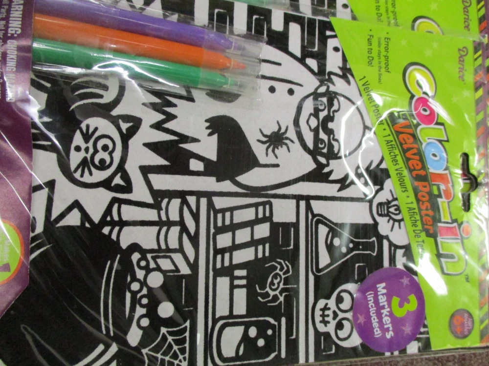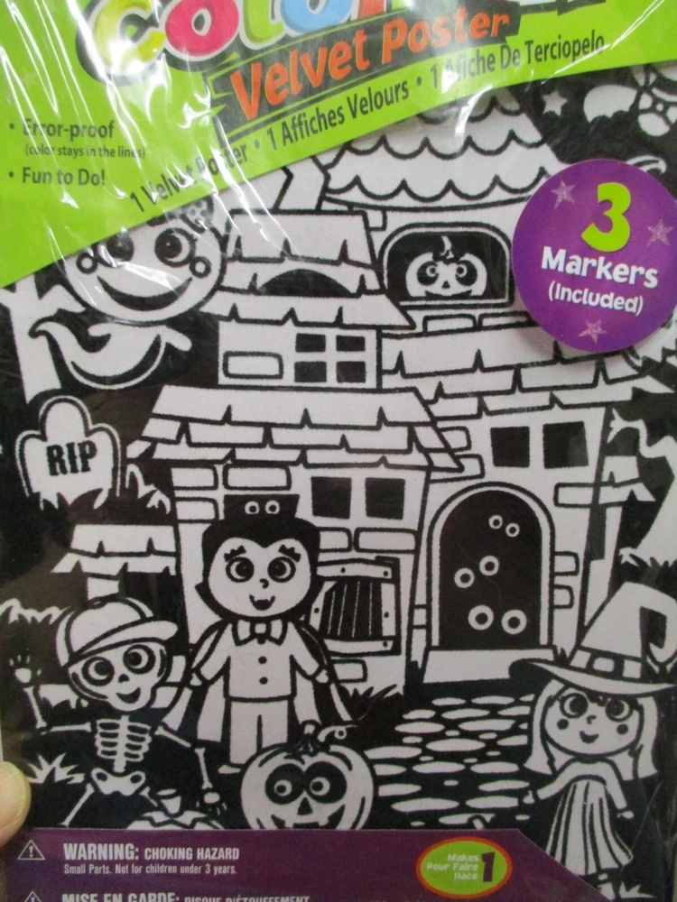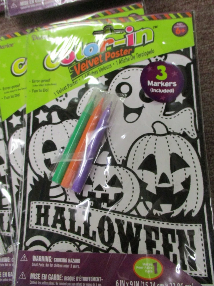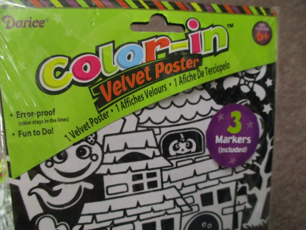Kids crafts Color-in velvet posters 12 pieces, 4 designs , 3 of each NOTE: one pack does not have any markers and these are older 5+ years old so markers may not be any good ???? each poster is 6" x 9" comes with 3 markers by Darice New great craft for a halloween party for kids