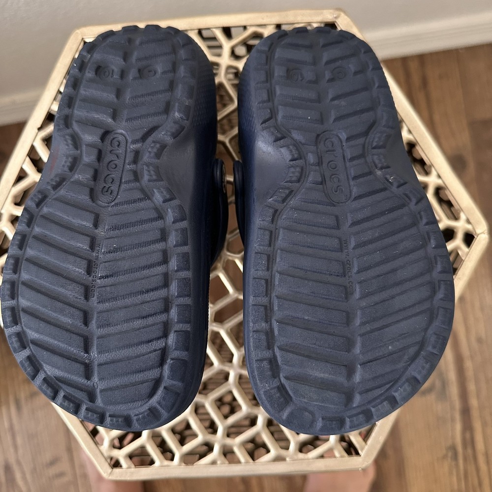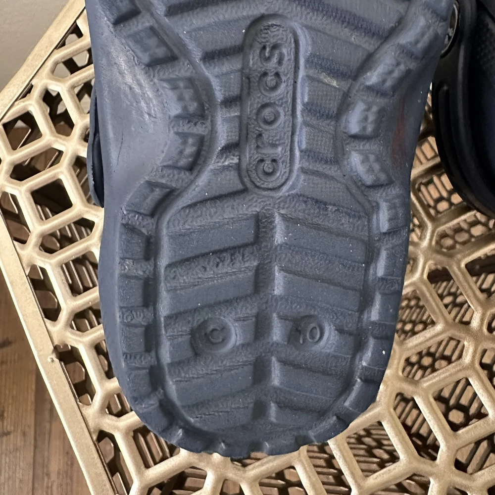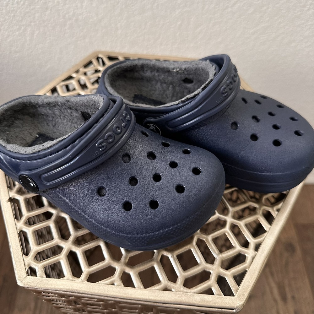 The product is a pair of navy Crocs Classic Lined Clogs in size C9 for unisex kids. They feature a fuzzy gray lining, strap accent, and are designed as a clog style sandal. The shoes are part of the Comfort Slide product line and are suitable for US shoe size 10. see pictures. shows as is.