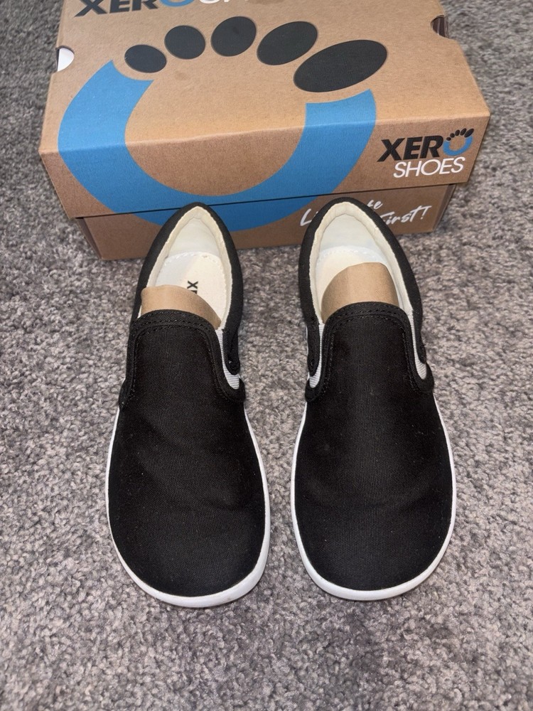 Daughter wore them once, but they were too narrow. The Kids Dillon Xero Shoes in black, size 1 youth, are a stylish and comfortable option for young children. With a round toe shape, pull-on closure, and flat heel style, these sneakers are perfect for casual wear. Made with rubber outsole material, they offer minimal cushioning for added comfort. The black color and unisex design make them versatile for both boys and girls.