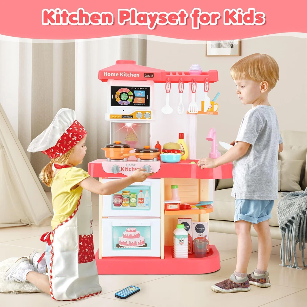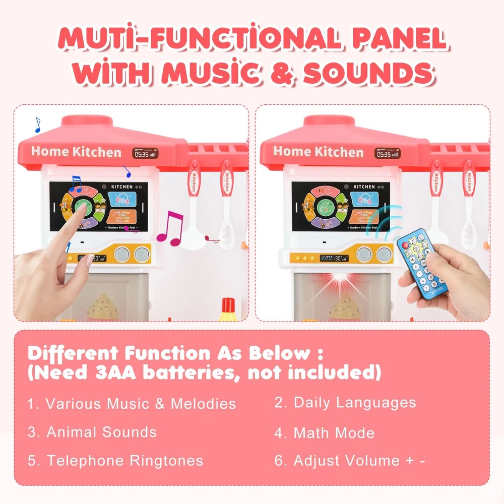【Interactive Toy Kitchen Set】Toy Kitchen set offers a glowing stove, makes cooking sound and steam, a running water sink, functional touch panel, various toy foods, color-changing foods, and kitchen accessories. Bring endless fun for your little chef. 【Touch & Remote Control Panel】Kids can touch or use a control to play different music, melodies, daily languages, animal sounds, math mode, telephone ringtones and volume adjustment. Multi-functional kitchen set supports role play and imaginative play, enhances kid's hearing, creativity and hands-on skills. 【Realistic Cooking Experience】Turn on the stove for a realistic effects with lights, sounds and steam (Need 3*AA batteries, not included). Put the color change foods like fish, meat and shrimp into ice water below 22°C, the color will gradually deepen. Providing a lifelike cooking adventure for kids. 【Play Sink with Circulation Design】Sink toy allows kids to clean food toys, plates, and utensils. It provides children an opportunities for imaginative play and exploration. Also, kids can learn about the importance of conserving water and develop good habits. 【Great Educational Toy Gift】Pretend play kitchen set are made of durable plastic, easily assemble, it is a ideal fantastic kitchen toy gift for reward, birthday and Christmas. Dimensions: 20.27*10.24*29.5 inch.