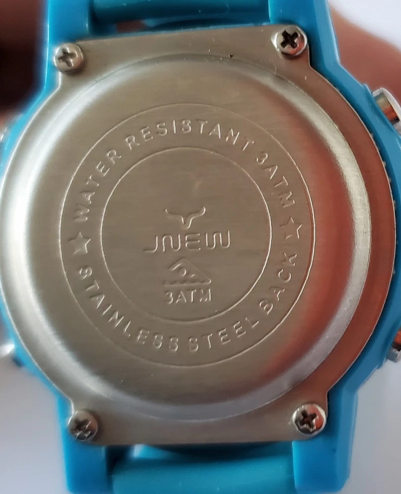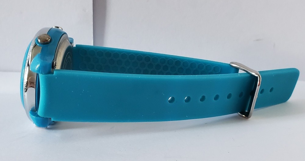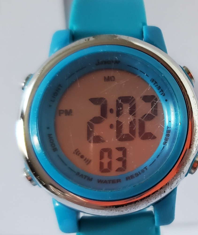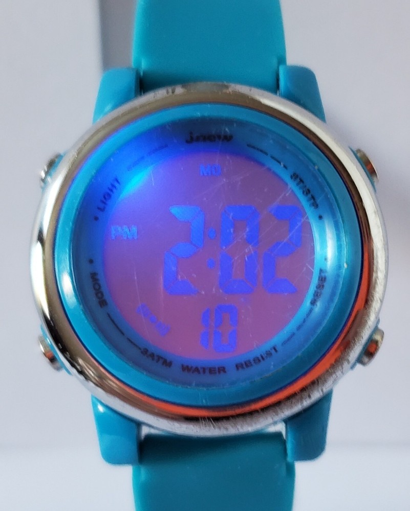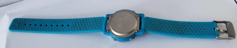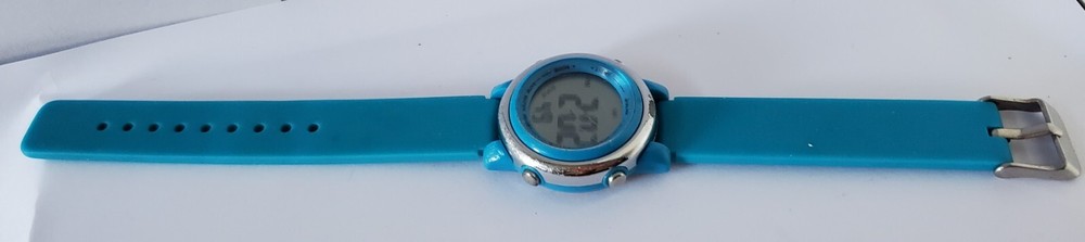 Children's digital watch with blue silicone strap. The glass has some scratches on it but is otherwise in good condition and full working order