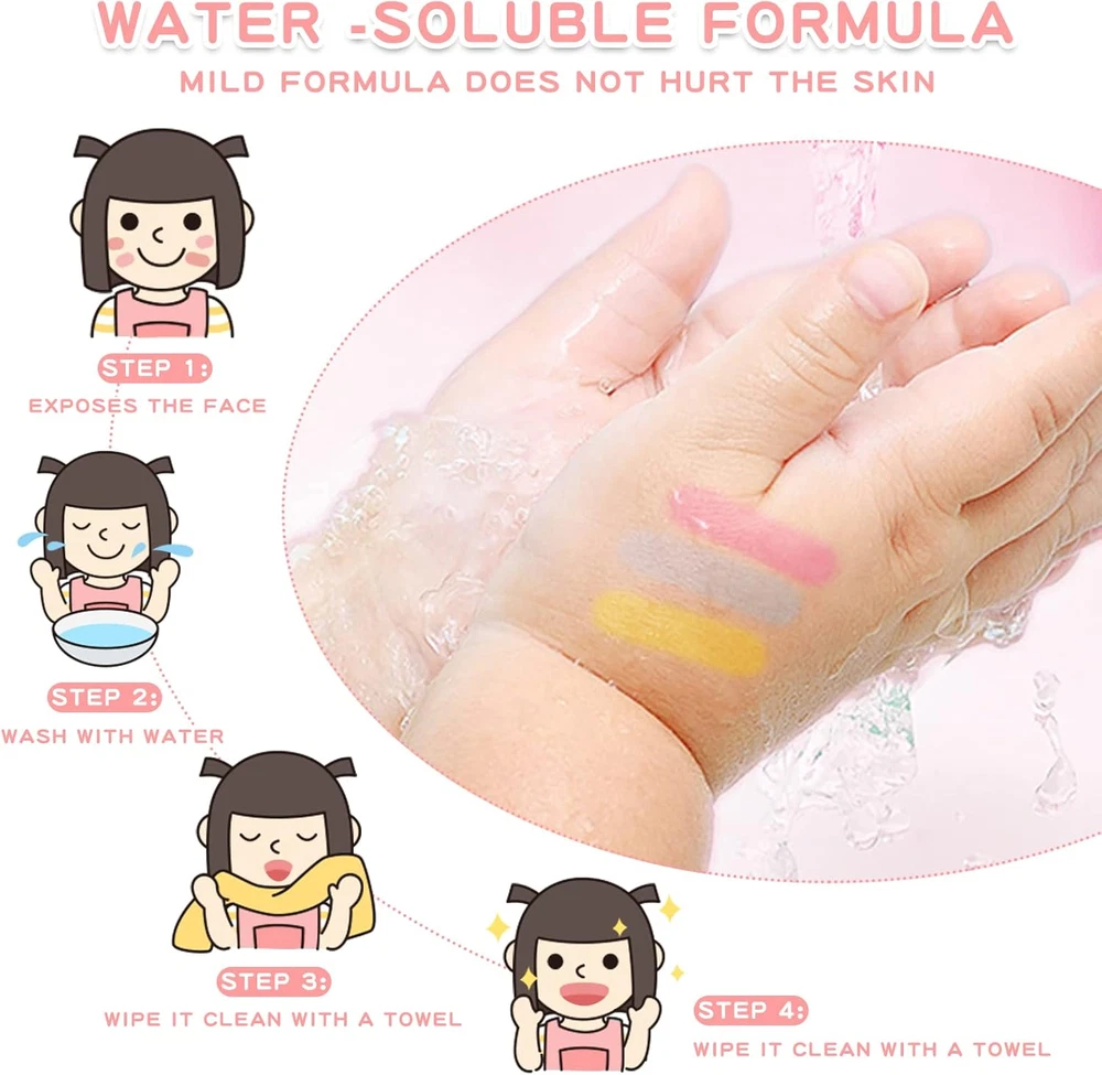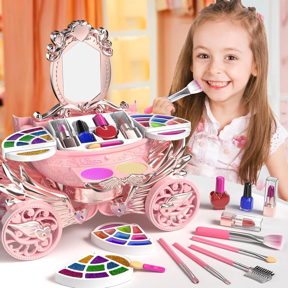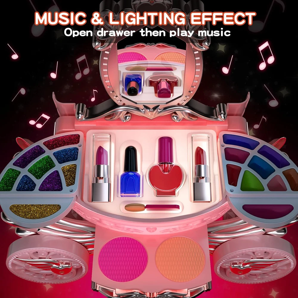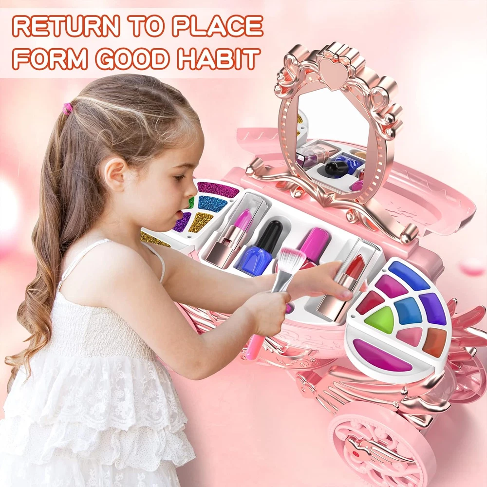 GIRL'S REAL MAKEUP SET - Kid makeup kit include an exquisite makeup vanity car with eyeshadow palette,lip gloss,lipstick,blush,tear-able nail polish, makeup brushes X5 and mirror. The girls makeup kit can meet children's curiosity about beauty. WASHABLE & NON-TOXIC - Children's washable makeup set for little girls are soft and compatible with skin. Dress-up toy set is made of water-soluble material, which can be washed with soap and water. Please use them with confidence. DURABLE AND STORAGE - Cute little girl makeup can collect decentralized cosmetics toys. It is convenient to carry, little girls can bring their beloved makeup toys anywhere, such as , dressing party. LIGHT AND MUSIC EFFECT - Open the drawer of the pumpkin car, you will enjoy the flashing lights and music. Little ones have an innate curiosity about everything grown-up. With this pretending toy, children can imitate mothers to dress up and enjoy the fun of role -playing. Ideal toddler toys for age 3-4. IDEAL GIFT FOR PRINCESS - The toddler girl toys encourage kids to play their ideas and make the first try on makeup. Great Gift Idea For Girls of any age! This dollhouse as a birthday party, christmas, holiday or party gifts for 3 4 5 6 7 8 year old boy and girls. Product Description Gift or Girls of Any Age! This make up toy as a birthday party, christmas, holiday or party gifts for 3 4 5 67 8 year old boy and girls. Meantime,it can be played at home, outdooror as a part of the science project at school. This is a gift to every girl that has aprincess dream in her heart! Product Size When the makeup box is opened: 11 × 6.7 × 11.1 in When the makeup box is closed: 10.4 × 4.3 × 5.9 in Makeup brush: 4.5 in Makeup brush: 3.9 in