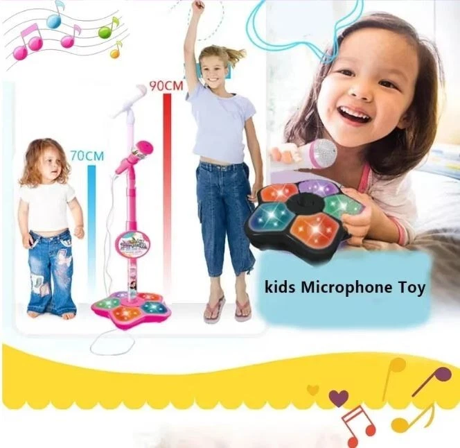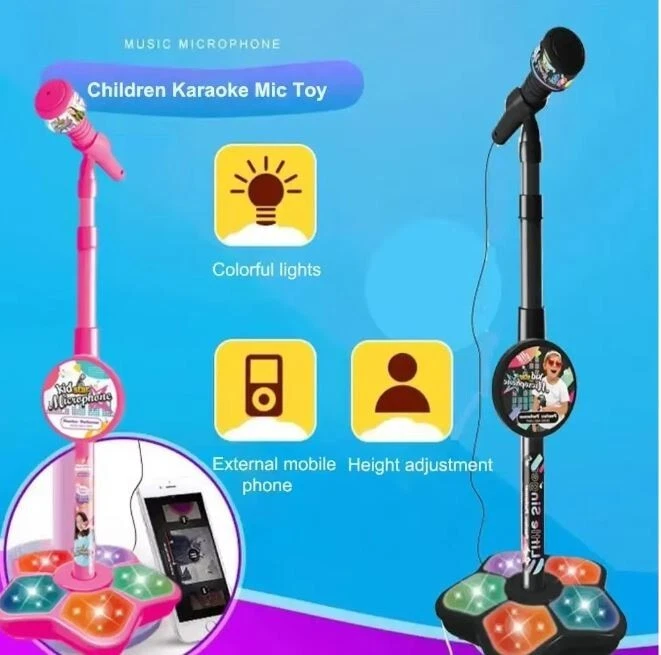 Description: Material: Plastic + Electronic Components Power By: 3*AA Battery(Not Included) Package: Microphone x 1 Features: 1. This microphone in fine workmanship and cute modeling has great appeal to kids. 2. Stand type microphone design lets kids sing enjoyably as a singer on the stage. 3. Multifunction brings kids more fun. 4. The microphone can change songs and be connected with MP3 player or phone to play more music. 5. Light Effect makes the microphone look more cool and interesting. 6. The height of the stand is adjustable, can perfectly fit for different ages of kids. 7. The product supports volume control, and is convenient to install, which is the good gift for your kids.