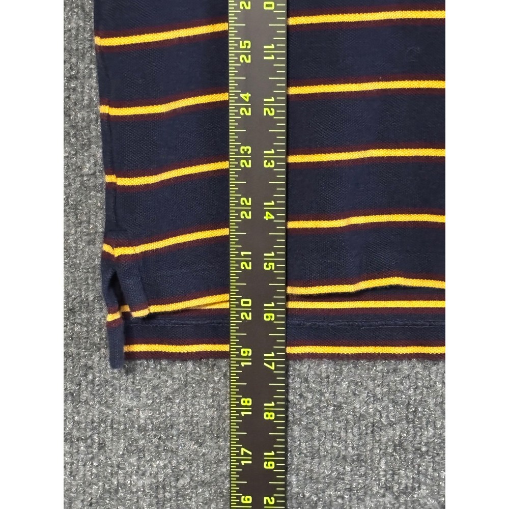 Brighten any day with this vibrant Polo Ralph Lauren polo shirt. Bold navy and sunshine yellow stripes create a playful yet classic look perfect for your little one. The iconic green Polo Player logo embroidered on the chest adds a touch of timeless style. This comfortable and durable polo is ideal for everyday adventures, playground fun, or family gatherings. Measurements: • Chest (pit to pit): 13 in • Length (shoulder to hem): 17 in Department: Boys Type: Polo Sleeve Length: Short Sleeve Closure: Button Fabric Type: Knit Performance/Activity: Golf, Tennis, School Pattern: Striped Material: Cotton Neckline: Collared Style: Pullover Features: Breathable, Easy Care, Contrasting Trim Fit: Classic Accents: Logo, Button Collar Style: Point Keywords: Polo Ralph Lauren, kids polo, boys polo, striped shirt, preppy, classic, short sleeve, summer, casual, playground, school, activewear