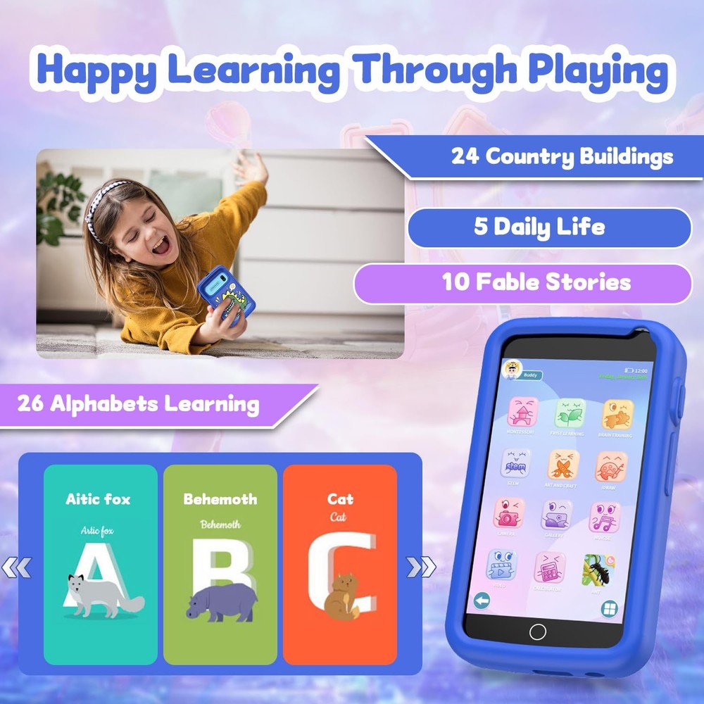Features: Kids Smart Realistic Cell Phone ToyThe smartphone toy for kids is equipped with a 3.97-inch high-definition touch screen, and the larger screen allows children to experience the true fun of smartphones. Without the need for a SIM card (unable to make phone calls or send text messages). The kids can take photos and videos, listen to music and stories, and play games, satisfying their desire for exploration. 200+Fun Puzzle GamesThe real cell phone toy is designed specifically for children, with over 200 puzzle games built-in to enhance their cognitive abilities. They can stimulate the brain, promote early education, and make learning enjoyable and interactive. The Gift That Children ExpectThe kids always hope to be treated like adults and have the same things as their parents, especially a phone. This kids toy phone is an ideal gift for children aged 3, 4, 5, 6, and 7. It is a great choice for birthdays, Children's Day, Valentine's Day, Easter, Thanksgiving, Christmas, and New Year. Built in 1500mAh rechargeable battery, which can provide 5-6 hours of daily use for children. Education Meets EntertainmentThis kid phone provides ABC learning modules, with each letter having phonetic pronunciation and animal names, making learning both interactive and fun. 24 landmark buildings from different countries enrich children's horizons. At the same time, parents can guide their children to use electronic products correctly by playing with toy phones. Parent child interaction not only increases the fun of interaction between children and toy phones, but also deepens the relationship between parents and children. Portable for Kids Travel ActivityThis lightweight and durable kid smart phone is perfect for use in cars, airplanes, restaurants, or parties, making it easy for children to play while on the go. When camping without internet, it is also a popular toy that can keep children's hands busy. Both boys and girls can use it to play games, listen to music, and take photos with friends during their travels. Safe Kids Toy PhoneThis toy phone is non-toxic, BPA free, and radiation free, safe and reliable, suitable for children aged 3-12 who enjoy playing with their phones. and do not require WiFi. Our kids phone toys have undergone countless tests to ensure compliance with CPC and CPSIA regulatory standards.