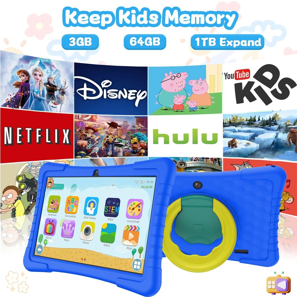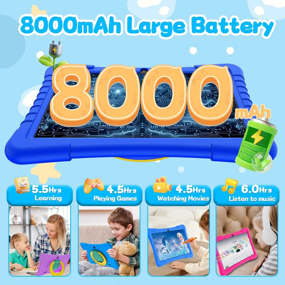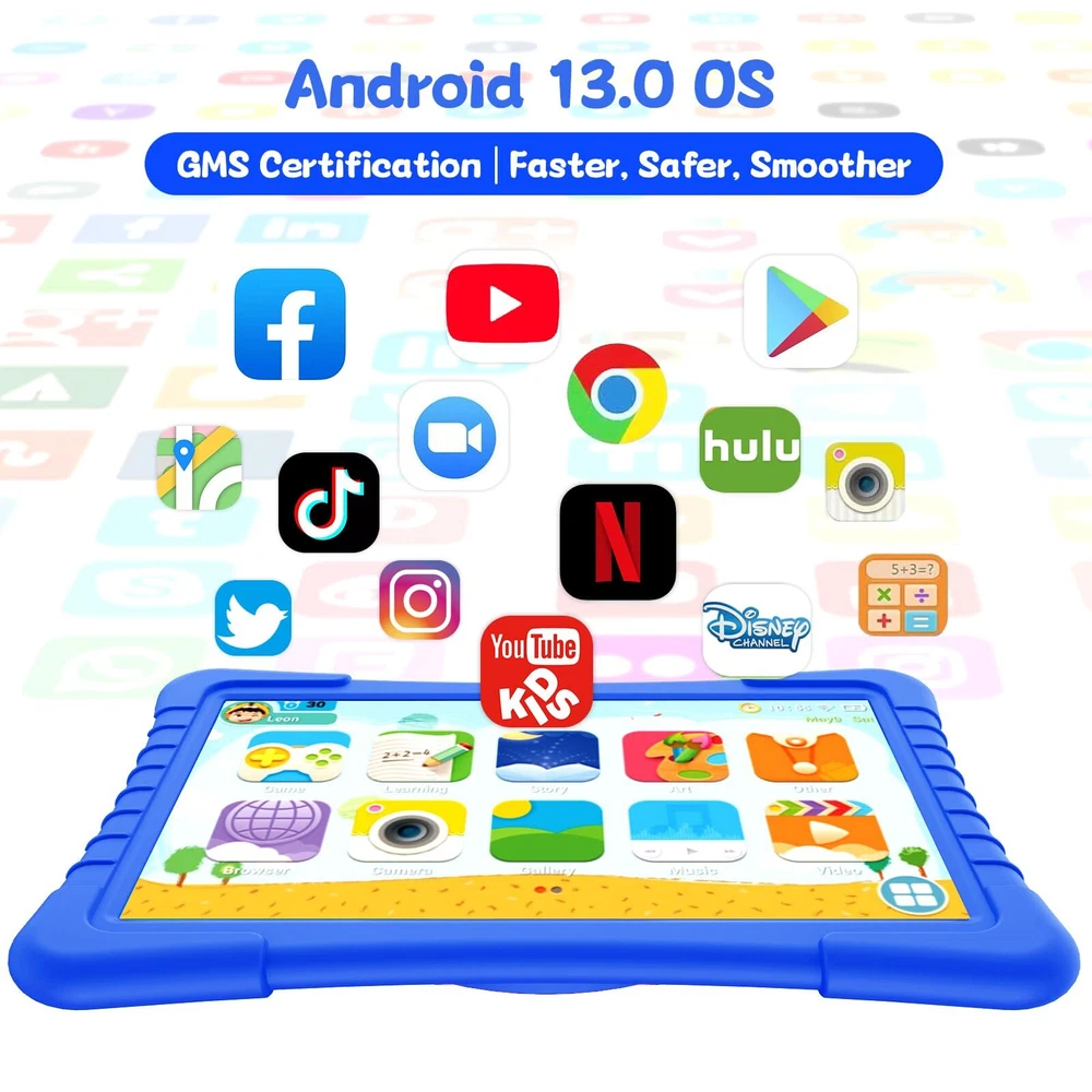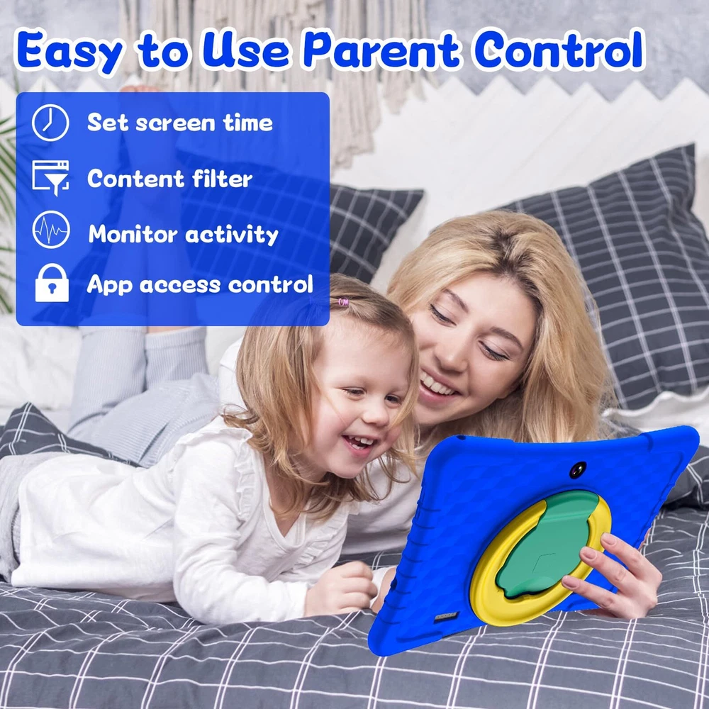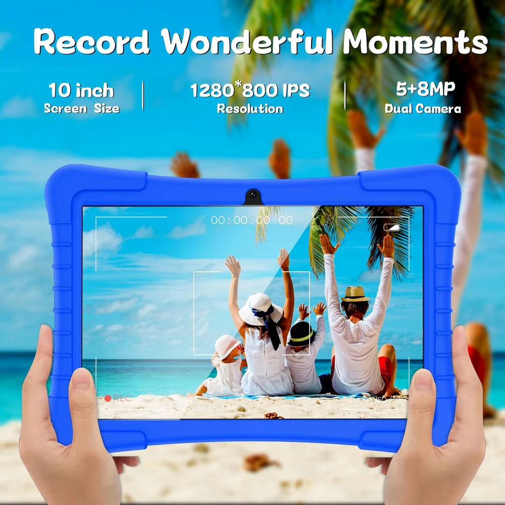 【Android 13+ 3GB/64GB】 Kids Tablet 10 inch with 3GB RAM and 64GB ROM, The kids tablet offers ample space to store apps, games, videos, etc. The Android 13 OS on the kids tablet offers the latest features, security updates and performance enhancements 【Parental Control】This kids tablet has parental control mode, parents can set educational goal and control screen time and filter content. Provide a safe environment for kids to surf the Internet, it is a good helper to manage kids use of kids tablet 【Protective Case】This kids tablet has a durable protective case that keeps the 10 inch tablet safe from bumps and scratches, and has a stand that makes it perfect for watching videos, studying and playing games without having to hold the tablet 【WiFi + Bluetooth】This kids tablet features WiFi, so kids can easily connect to the Internet, The WiFi connectivity ensures a seamless browsing experience. The tablet allows kids to pair the device with such as headphones, speakers, etc. 【Dual Cameras + 8000mAh】The kids tablet has dual cameras that allow kids to take photos, record videos and video chat with family and friends. This kids tablet has a 8000mAh battery, it's ensures non-stop entertainment and learning for kids