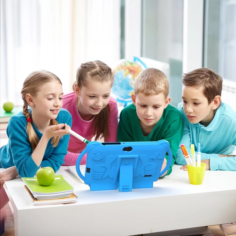 Kids Tablet 7 inch for Boys, Android 12 Tablets Kids, 4GB RAM 32GB Blue Product Details Brand: ZZB Model Name: ZZBQ8K Memory Storage Capacity: 32 GB Screen Size: 7 Inches Display Resolution Maximum: 1024*600 Pixels 【2024 Kids Android Tablet】The kids tablet is equipped with safer and faster Android 12.0 operating system, powered by a 1.5 GHz quad-core processor, 1024x600 Eye protection IPS HD display, Wifi, dual cameras, with 4GB RAM(2+2 expansion), 32GB ROM, and includes a micro SD (512GB expansion) card slot for easier storage of e-books, songs, pictures, videos, games, and more. 【Tailored for Kids】 kids can have their own private playground, and the kid-friendly interface makes it easy to use. Children can access educational and entertainment apps and websites without risk. Everything in kids tablet is tailored to your child's age and skill level. Effective games and apps designed to provide innovative digital educational content for kids aged 3-15, learning about animals, learning clothes, learning fruits, typing. 【Eye Protection HD Touchscreen】 The tablet for kids adopts 1024*600 IPS HD touchscreen, provides outstanding visual experience from all angles. The 7’’ kids tablet LED is designed with low blue light technology, display is bright, high contrast, and has a wide viewing angle, while helping to reduce damage to the eyes, and automatically adjust the brightness in the night reading mode to experience the fun of immersive reading. 【Tablet with Kid-Proof Case】This Toddler tablet equipped with a durable protective handles cover to prevent damage caused by falling, bumping, and squeezing, which can better protect your tablet. The tablet case that can stand, kids don't need to hold the tablet all the time when learning, watching or playing. 【Ideal Gift】The cute cartoon kid tablet, brings children a lot of fun and knowledge, which is very popular with children, It is the best gift choice for holidays and birthdays, Christmas, NewYear, Resurrection. You can also enjoy a happy parent-child time with your child, and chat with your child online at any time through video and voice calls. 【4GB +32GB Performance Kids Tablet】Tablet adopt 4GB RAM, 32GB ROM, Android 12 system. Large capacity RAM and new System, ensures the fast speed when open apps and multi task. 1024x600 IPS display, Wifi, Bluetooth, front 2.0+ back 5.0MP HD Camera. Dual Speaker, 3.5mm headphone jack. Pre installed kids apps, Specially designed for different age kids.
