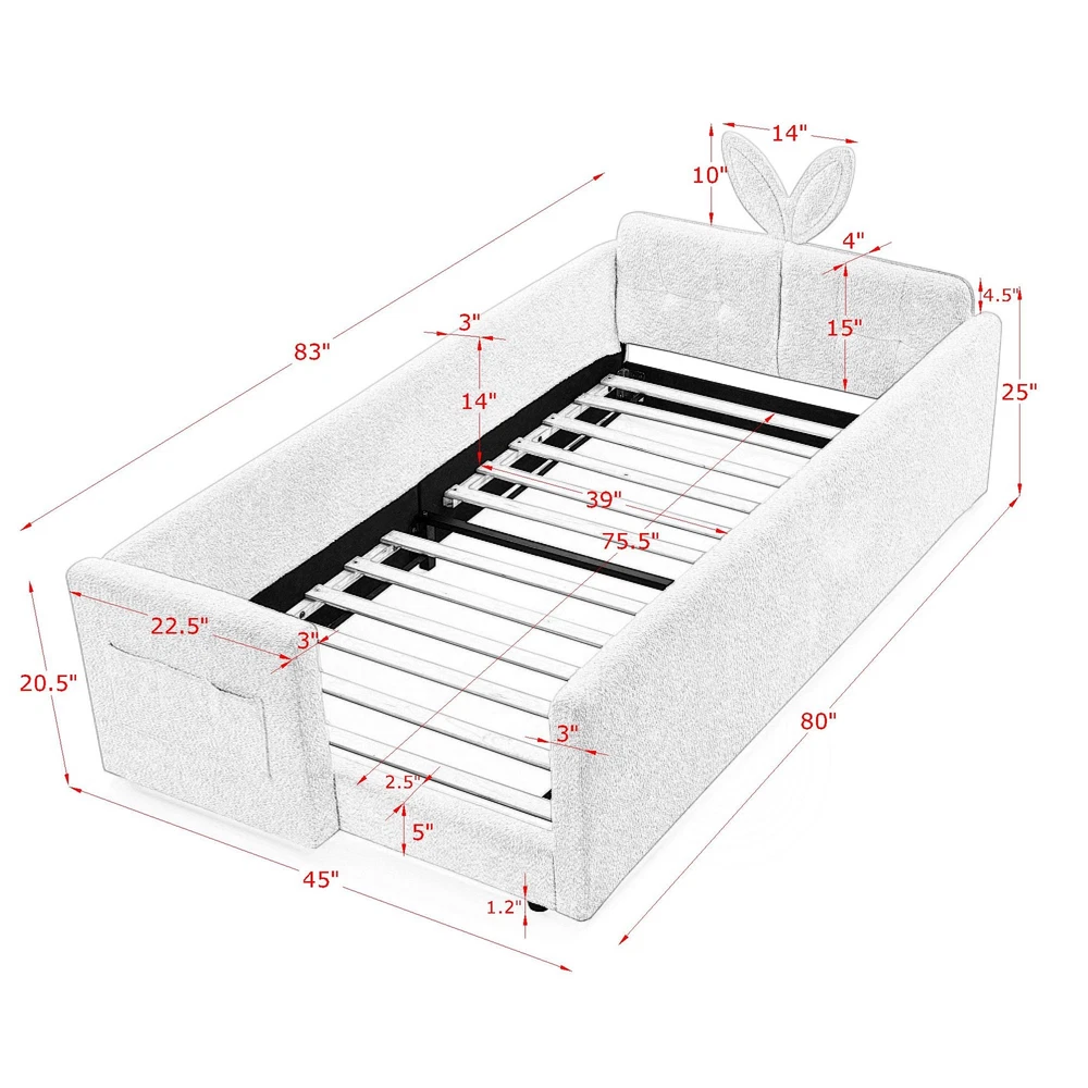Product Description Dear customer: Thank you for your time and patience. If you have any questions about this product , or find that there are any quality problems after you receive the package, please don't hesitate to contact us by email .We will try our best to serve you. If you don't want this product , you can also contact us . We will send you a return shipping label and full refund you . You don't need to pay any costs. Thank you, have a good day!♪(・ω・)ノ Specification Product Information Item Code: W1413P307371 Product Type: Single Box Product Product Name: Twin Size Upholstered Platform Bed with Cute Rabbit Ear Shaped Headboard, with Safety Rail and Pocket, Boucle Fabric, Sky blue Main Color: Baby Blue Main Material: Boucle Product Style: Cute Use Case: Bedroom Bed Size: Twin Upholstery Material: Boucle Product Dimensions Assembled Length (in.): Not Applicable Assembled Width (in.): Not Applicable Assembled Height (in.): Not Applicable Product Weight (lbs.): Not Applicable Package Size Length (in.): 41.00 Width (in.): 21.45 Height (in.): 20.70 Weight (lbs.): 88.00 Product Features Cute rabbit ear modeling, creating a playful bedroom. Safety guardrail design, guarding night activities. Distinctive boucle texture, durable & kid-friendly, resisting wear. Overall Dimension 80''L x 45''W x 25''H Weight capacity:300lbs Description Specification Overall Dimension 80''L x 45''W x 25''H Detail Product Dimension Please refer to the Size image Size Twin Material Boucle Fabric+Plywood+MDF+Foam Product Net Weight 82 lbs Product Gross Weight 89 lbs Weight Capacity 300 lbs Product Type Sofa Bed Upholstery Material Boucle Fabric Frame Material Solid Wood and plywood Leg Material Plastic Seat Fill Material Foam Seat Construction Sinuous Springs Back Fill Material Foam Assembly Required Yes About Us Payment Shipping Returns Contact Us * We are professional in developing, producting and exporting laptop bag company. * We are able to produce 100,000 pieces per month by more than 100 worker. Our main market is North America, Europe, Oceania, Southeast Asia, the Mid east etc. We always offer you competitive price, good quality, prompt delivery and good service. * Those styles are designed by our engineer and the material are pro-environment. Factory Evaluation and Material Evaluation are welcomed. * Any comments and inquires will be great appreciated! * Once cooperation, forever friends. * Our office hours are: 9:00 a.m. to 6:00 p.m. (GMT+8), Monday to Friday * And our office is closed on weekends and public holidays. Message replying will sometimes be delayed. 1.We accept ONLY PAYPAL Payment. 2.Cheque will be held until cleared. 3.Please write any special request (e.g. Colors or Size) in PayPal Note when you make payment, because most of orders will be processed instantly and dispatched in same day. 4.Please confirm your detailed shipping address is up-to-date and same in your eBay and PayPal account before you make payment. Please include daytime phone number in your eBay address; your local postman or customs will use this phone number to contact you! 5.Please settle the full payment as soon as possible after the auction. Thank you for your cooperation. All cargo will be sent within two business days after the confirmation of your payment. We Ship via Air-Mail on default. The cargo with value more than 28 USD will be sent by registered Mail with tracking number. If you haven't received the item within 35 days from the payment, please contact us. We will track the shipment and get back to you with a satisfying reply. We will not be responsible for any delay during delivery including but not limited to customs postage checking, strike, force majeure etc. We will post the item to the address of your Paypal registered. Please ensure your address is correct. If the item returns to us without fault. This product has a 30 days warranty. Our warranty does not extended to any products that are physically damaged or that are not under normal operating conditions as a result of misuse or improper installation on the buyer/user's part. For all returned products, buyers MUST contact us for the returning address. We are responsible for all return shipping charges.Refund will be offered once we received the returned items. 1. We're running an ebay business and our aim is to provide our customer with fast, simple and pleasant buying experience. 2. We will our best to server our each customer and make them satisflied with our product and service. 3. Since your feedback's very important to our business development, we would appreciate if you could leave us Positive Feedback with Four 5-star DSR (Detailed Selling Rating). 4.If you have any problem about the goods, please feel free contact us, we would like to give you a good solution. 5. Any questions, please feel free to contact us via Ebay Message or E-mail. We always reply messages within 1 business day, except holidays. 6. Please kindly check your Spam Inbox or eBay Message Box if you do not receive a response within 2 business days. Thank you! About Us * We are professional in developing, producting and exporting laptop bag company. * We are able to produce 100,000 pieces per month by more than 100 worker. Our main market is North America, Europe, Oceania, Southeast Asia, the Mid east etc. We always offer you competitive price, good quality, prompt delivery and good service. * Those styles are designed by our engineer and the material are pro-environment. Factory Evaluation and Material Evaluation are welcomed. * Any comments and inquires will be great appreciated! * Once cooperation, forever friends. * Our office hours are: 9:00 a.m. to 6:00 p.m. (GMT+8), Monday to Friday * And our office is closed on weekends and public holidays. Message replying will sometimes be delayed. Payment 1.We accept ONLY PAYPAL Payment. 2.Cheque will be held until cleared. 3.Please write any special request (e.g. Colors or Size) in PayPal Note when you make payment, because 
