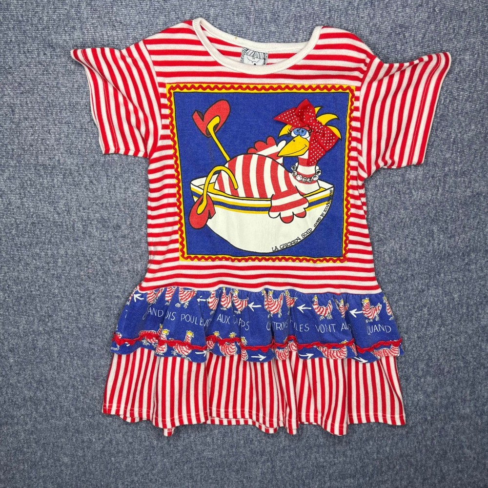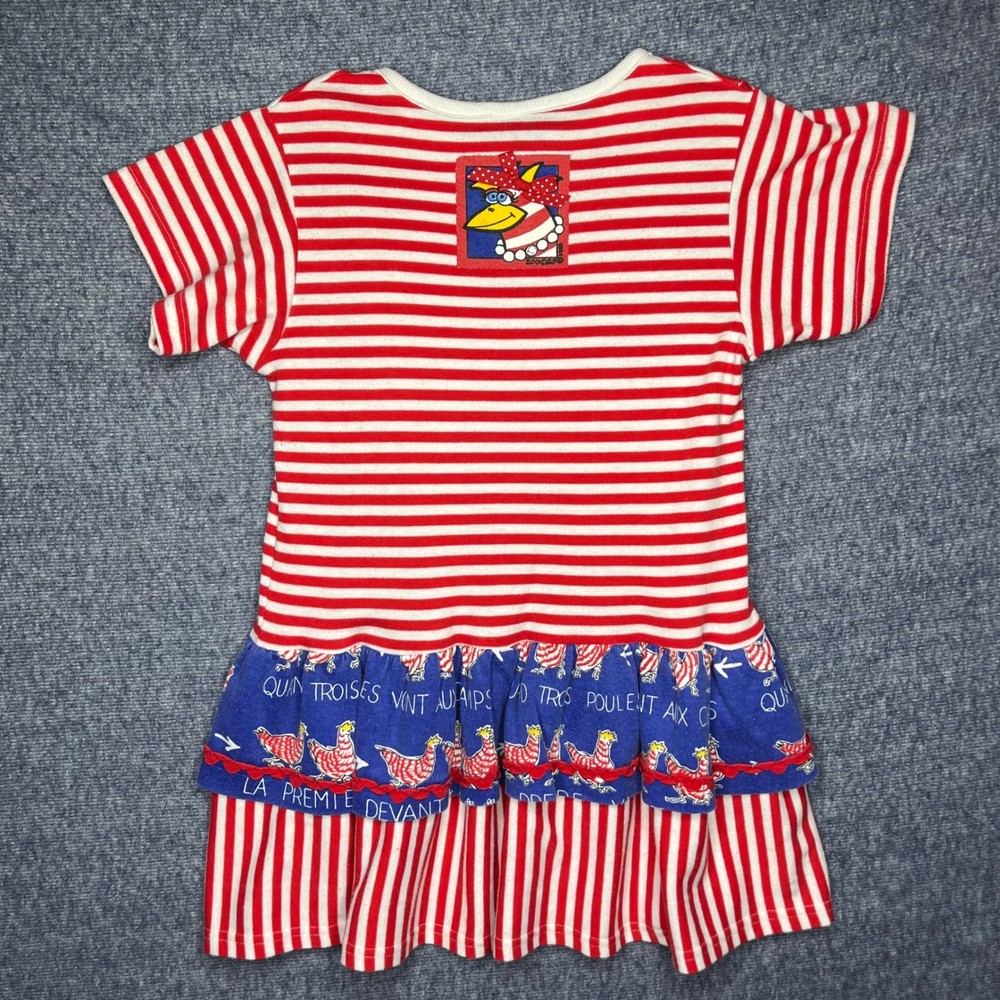 The ruffle is a bit faded. But over all this one is my favorite zoodles. Style: T-Shirt Dress Dress Length: Knee Length Department: Girls Theme: Food & Drink, Letters, Numbers & Words, Cartoon, TV & Movie Characters, Nature Sleeve Length: Short Sleeve Occasion: Casual, Party Fabric Type: Jersey Pattern: Striped Season: Summer, Spring Material: Cotton Blend Keywords: Kids dress, Girls dress, Zoodies dress, Striped dress, Chicken graphic, Ruffle dress, French text, Playful dress, Summer dress, Casual dress, Party dress, Toddler dress, Little girls dress, Cute dress, Whimsical dress